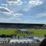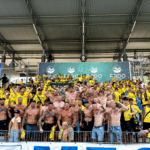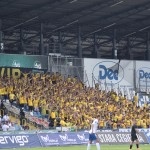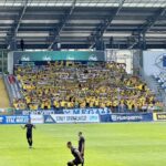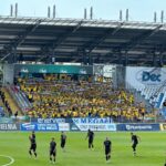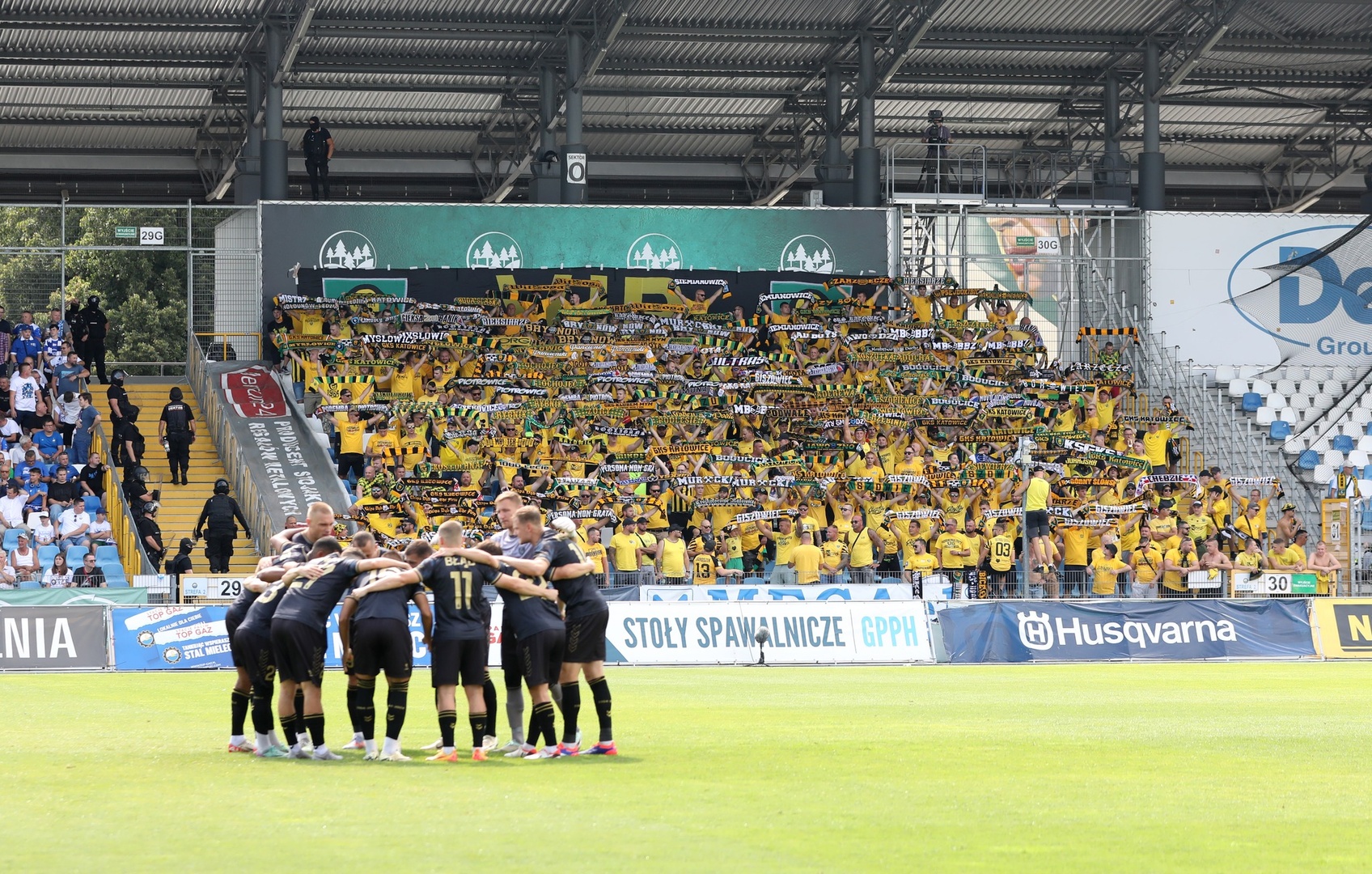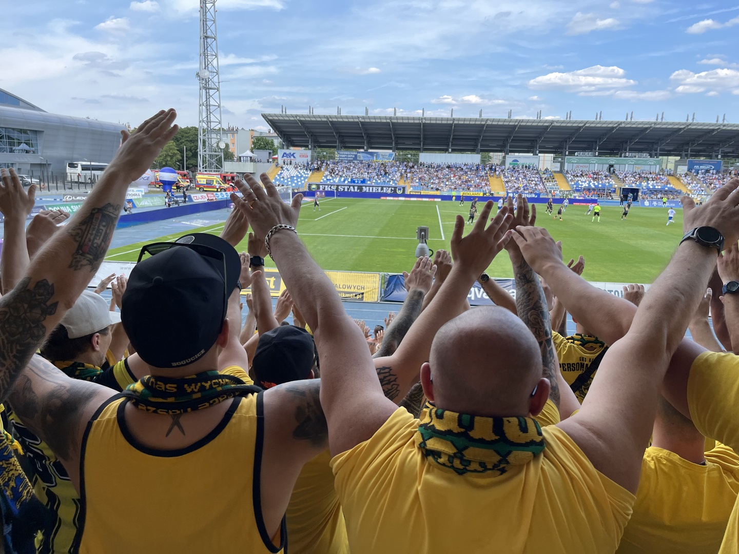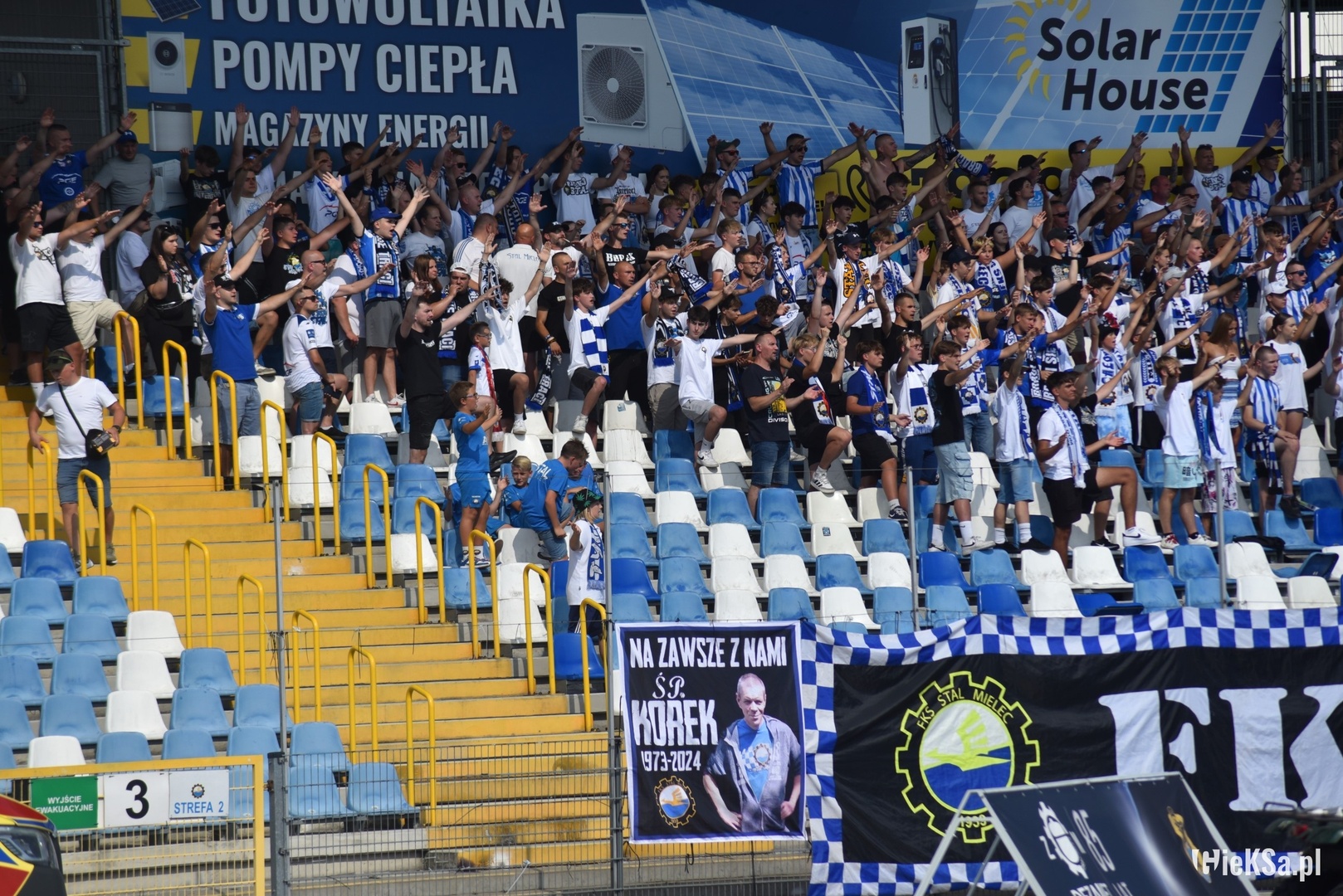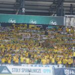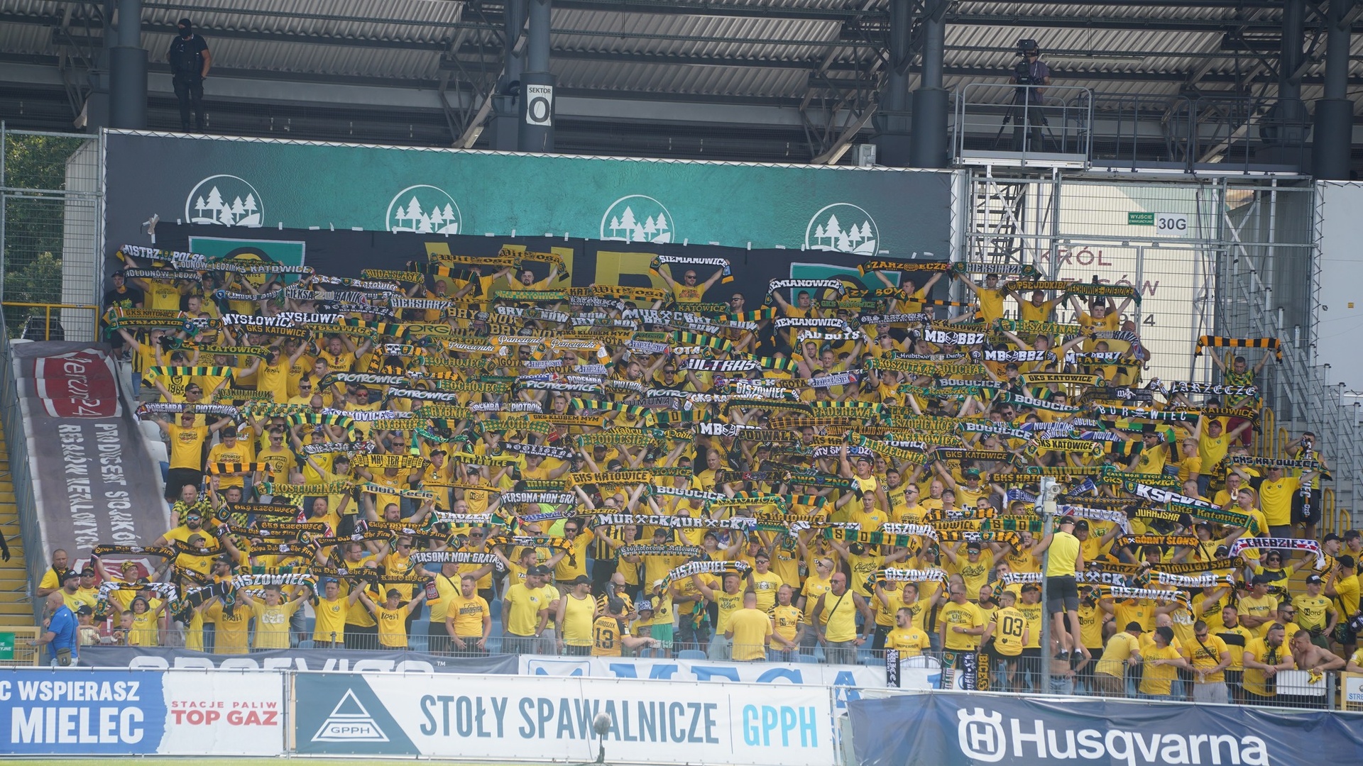 Na początek głośno dziękujemy gospodarzom za możliwość obejrzenia pierwszego wyjazdowego spotkania naszej drużyny po powrocie do Ekstraklasy, a następnie jedziemy już z wokalem dla naszej jedenastki. Z naszej perspektywy młyn FKS-u, który był naprzeciw, niesłyszalny wcale. Ogólnie ciężko mieli się przebić przez nakręconą decybelami „żółtą ścianę”. Ta sztuka udała im się jedynie gdy włączały się inne sektory. Na wyposażeniu mieli flagę „FKS STAL MIELEC”, do której w drugiej połowie dołączyło płótno „ŚP. KOREK”.