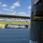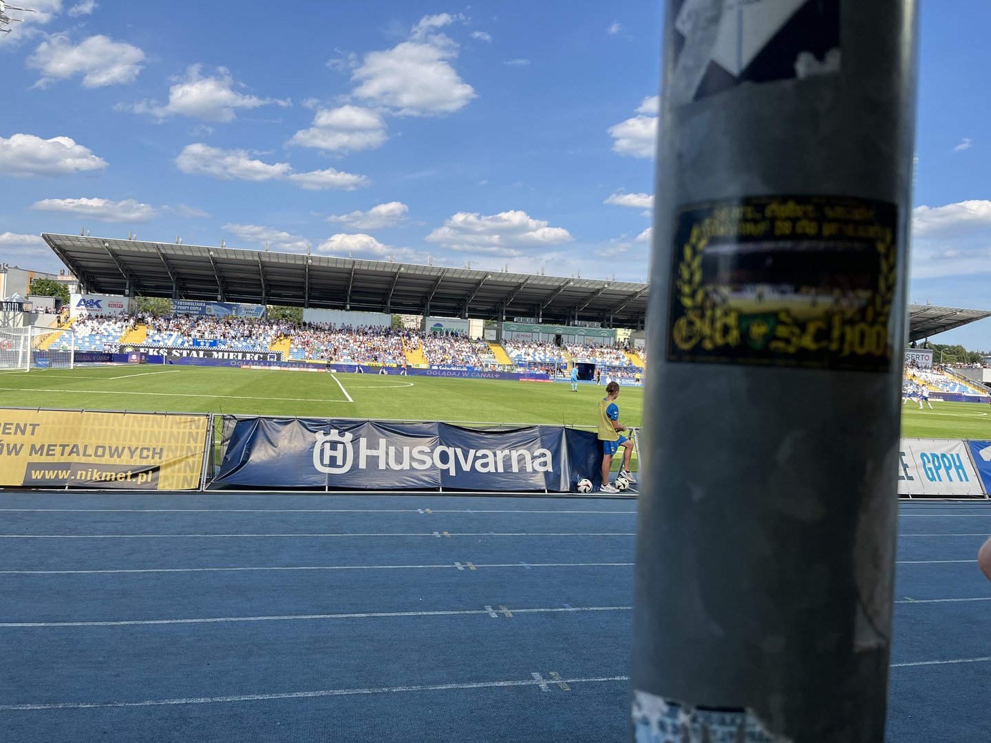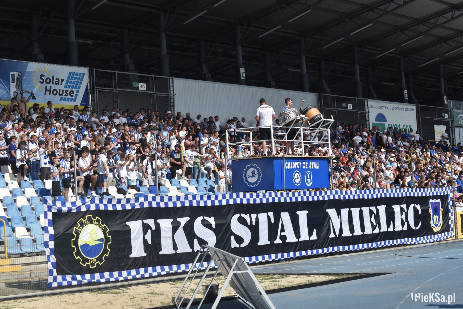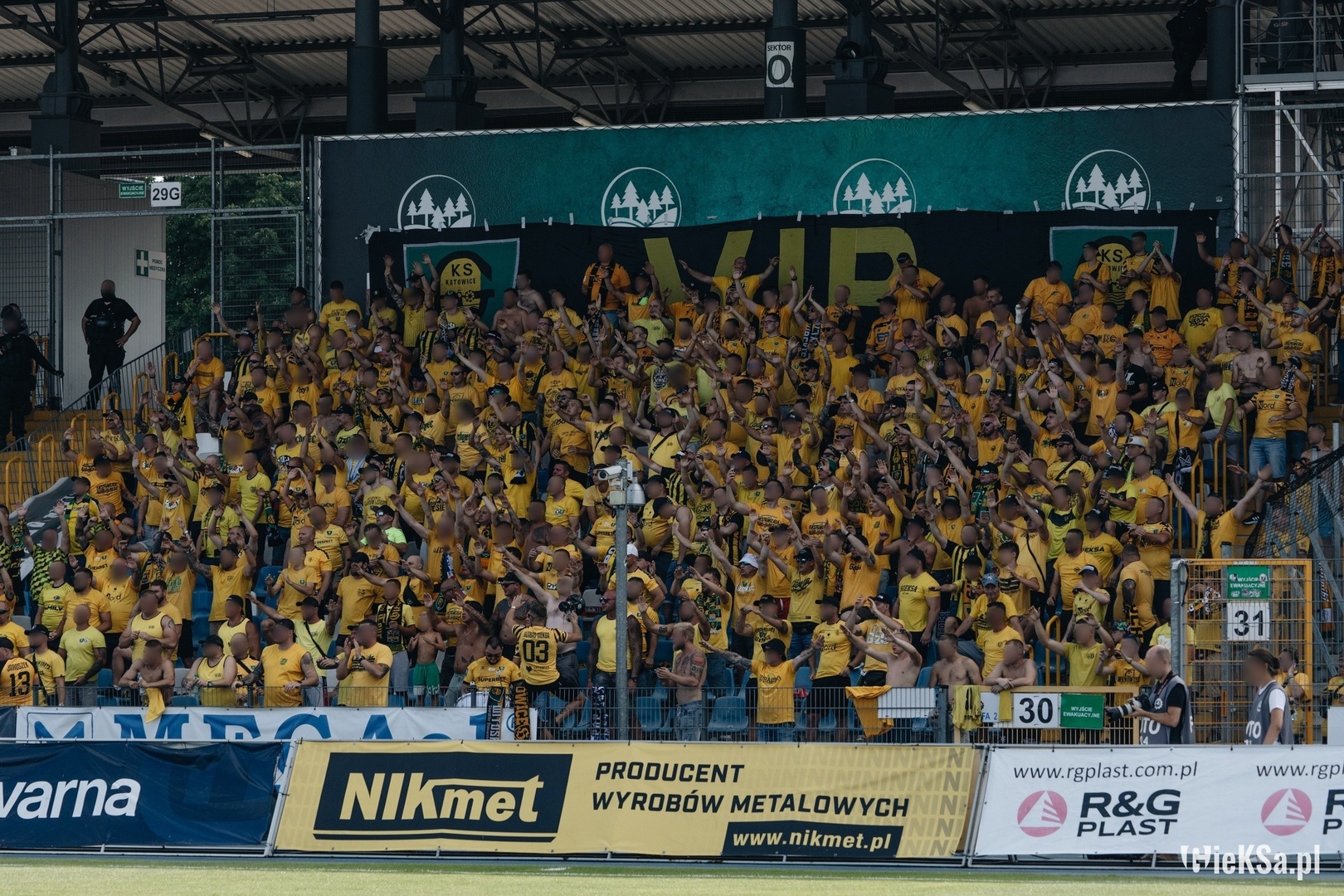 Do miasta kryzysów, jakim określają Mielec jego kibice, docieramy na godzinę przed pierwszym gwizdkiem, w 384 osoby, w tym jeden kibic Banika – dzięki. Już przed samym wjazdem na obiekt, widzimy na bloku mural poświęcony królowi strzelców z Mundialu 1974, który ma przypominać, że od tamtego roku Grzegorz Lato stał się patronem mieleckiego stadionu. Ku naszej uciesze słońce, znajduje się za trybuną, na której mamy zasiadać, a naprzeciw młyna Mielcoków. Przy pogodzie, jaka panowała to istne zbawienie. Zajęliśmy miejsca obok klatki i wedle ustaleń na wyposażeniu mieliśmy tylko jedną flagę „VIP”, która pamięta jeszcze czasy gdy GKS grał w najwyższej lidze. Powiesiliśmy ją z tyłu sektora, gdyż ogrodzenie przed, nie jest dostosowane do wysokości naszych płócien.
