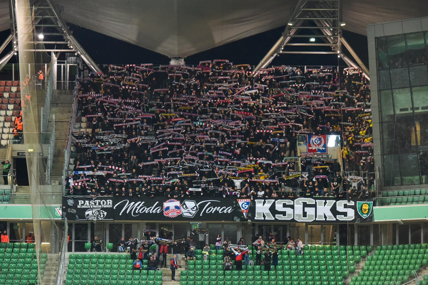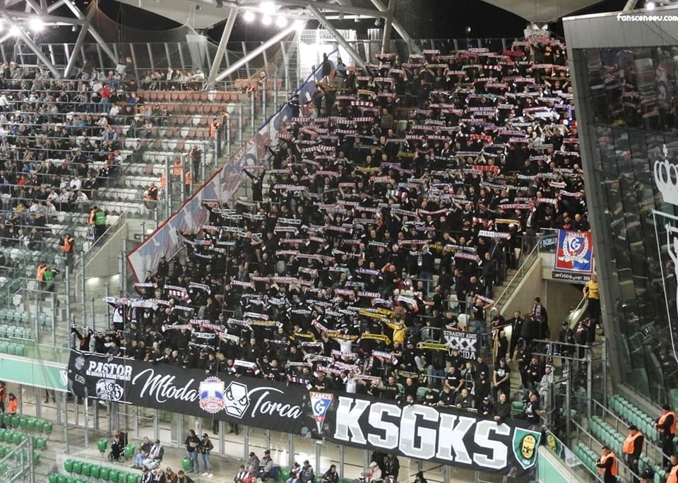 Na ten wyjazd zabrzanie zdecydowali się na czarny ubiór na sektorze, co dość fajnie się prezentowało. Niestety nie każdy dostosował się do wytycznych, w tym też kilku naszych kibiców. Na płocie ląduje 6 flag: GÓR\G/NIK, ŚP. PASTOR, MŁODA TORCA, KSGKS, XXX i HERB KSG VLEPKA.