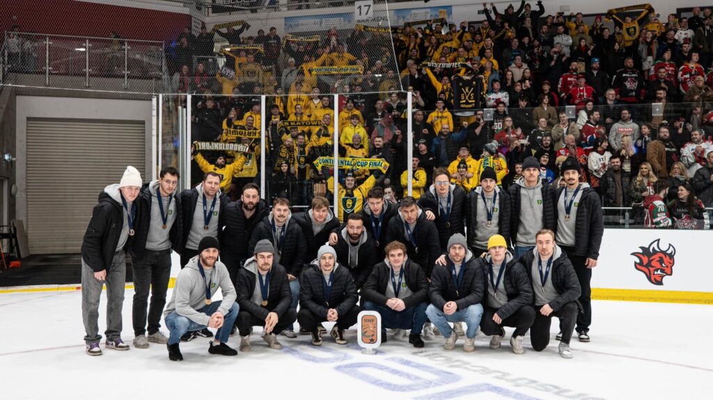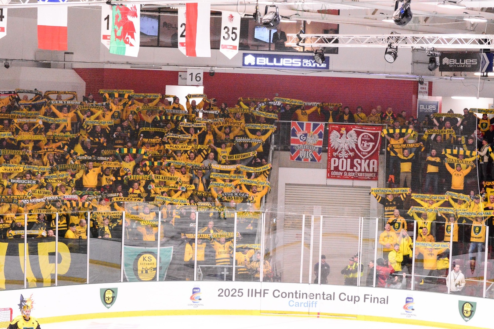 Dzień później Odbył się ostatni mecz finałów Cardiff – Grenoble, który miał wyłonić zwycięzcę. Większość GieKSiarzy wróciła już do domu, lecz grupa ok. 120 osób zawitała ponownie do Vindico Areny. Większość z nas zasiadała razem, dając czasem znać o sobie. Po meczu, który wygrali bez skrupułów gospodarze, kiedy nastała ceremonia zamknięcia turnieju i została wywołana drużyna GieKSy, fani z Cardiff zaczęli skandować „Katowice, Katowice”. Niedługo potem nasza drużyna podchodzi pod nasz sektor, by zrobić sobie pamiątkowe zdjęcie z brązowym trofeum. Szkoda tylko że zabrakło wszystkich kibiców z Satelity. Oby, do zobaczenia za rok!