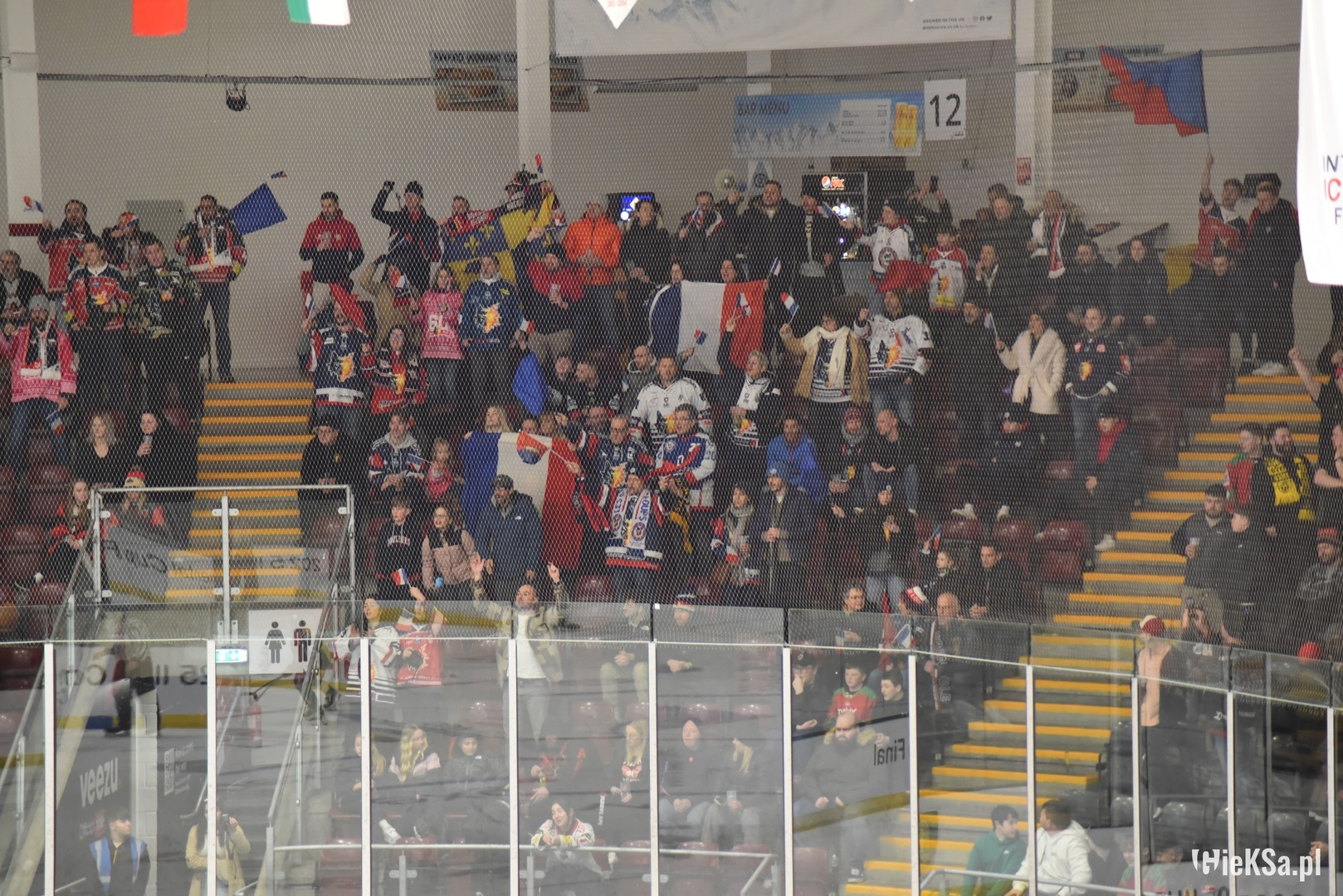 Od początku lecimy z konkretnym dopingiem, a w drugiej tercji prezentujemy oprawę przygotowaną przez Wyspiarzy. Rozwijamy żółtą sektorówkę z hokejowym kaskiem i skrzyżowanymi kijami, opisaną hasłem „GIEKSA UNITED KINGDOM”, w asyście machajek. W tym momencie nasza drużyna wyrównuje, a niedługo potem wychodzi na prowadzenie, co wprawia nas w szał radości. Wszyscy w tym momencie śpiewają na maksa, wierząc że dowieziemy wynik, co ostatecznie się nie udało. Ulegliśmy po siedmiu kolejkach karnych. W trzeciej tercji zaprezentowaliśmy jeszcze baloniadę. Francuzów wokalnie wspierało ok. 70 głów. Mieli tylko flagi narodowe.