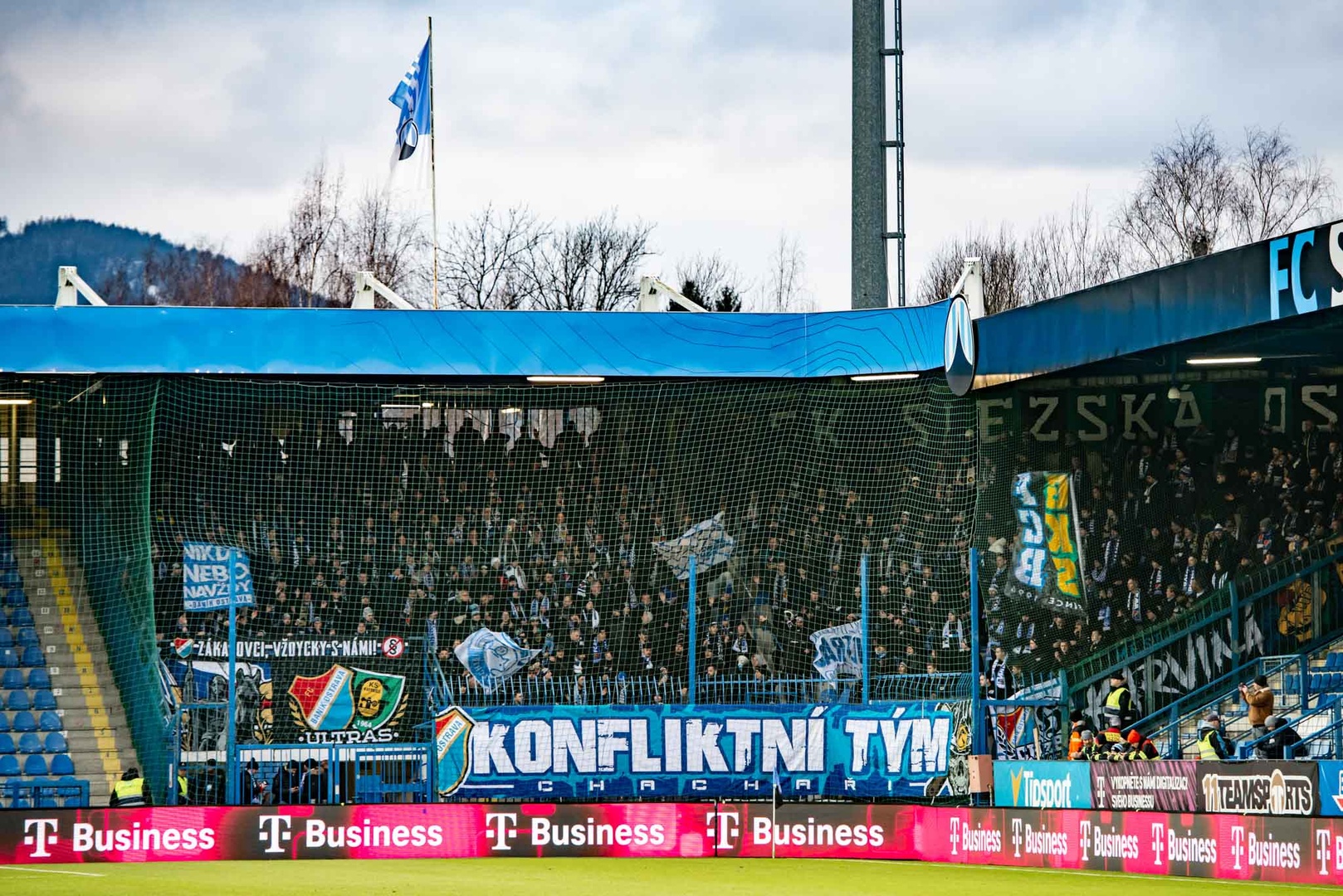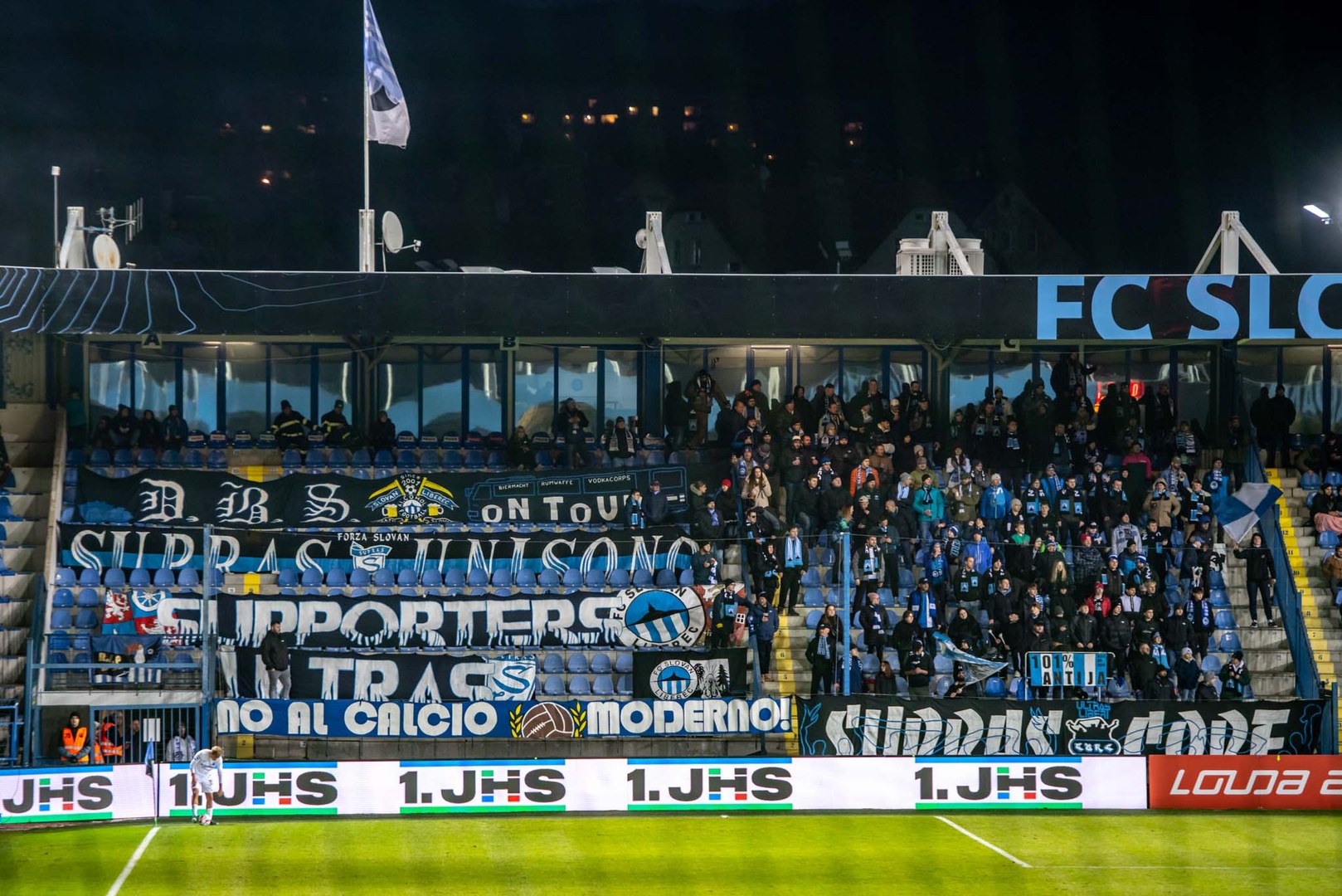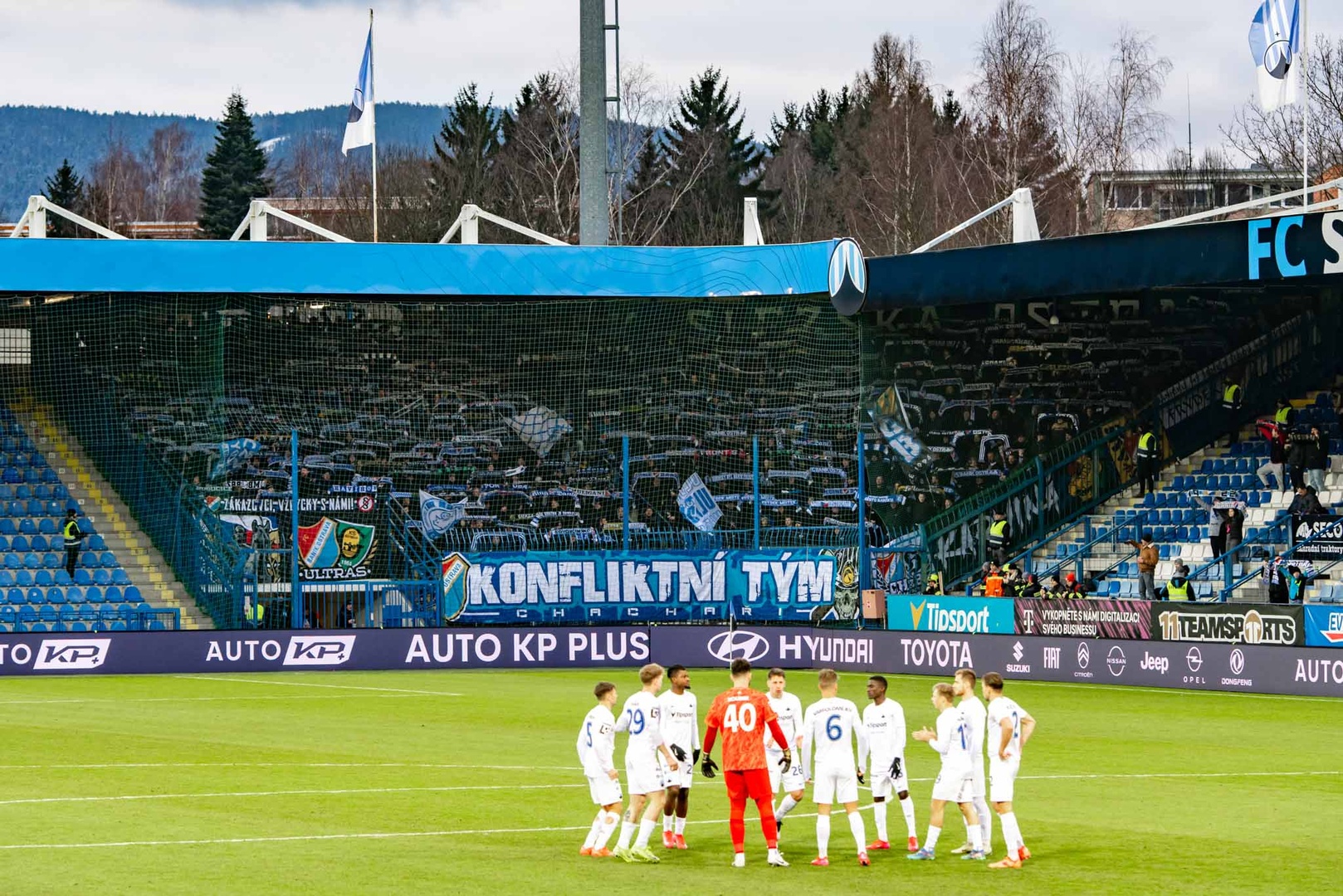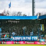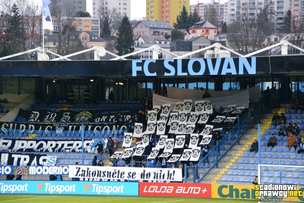 Przed gwizdkiem rozpoczynającym mecz możemy również zobaczyć przygotowaną choreografię gospodarzy. Czarny znak na białym tle z napisem „Zakousněte se do nich” („Wgryź się w nie”” uzupełnia stado psich głów. Przynajmniej wydaje się mi, że to były psy, bo z daleka rysunki były trudniejsze do zidentyfikowania. Niektórzy widzieli w nich owce, kozy albo lamy… Trochę jak test Rorschacha.