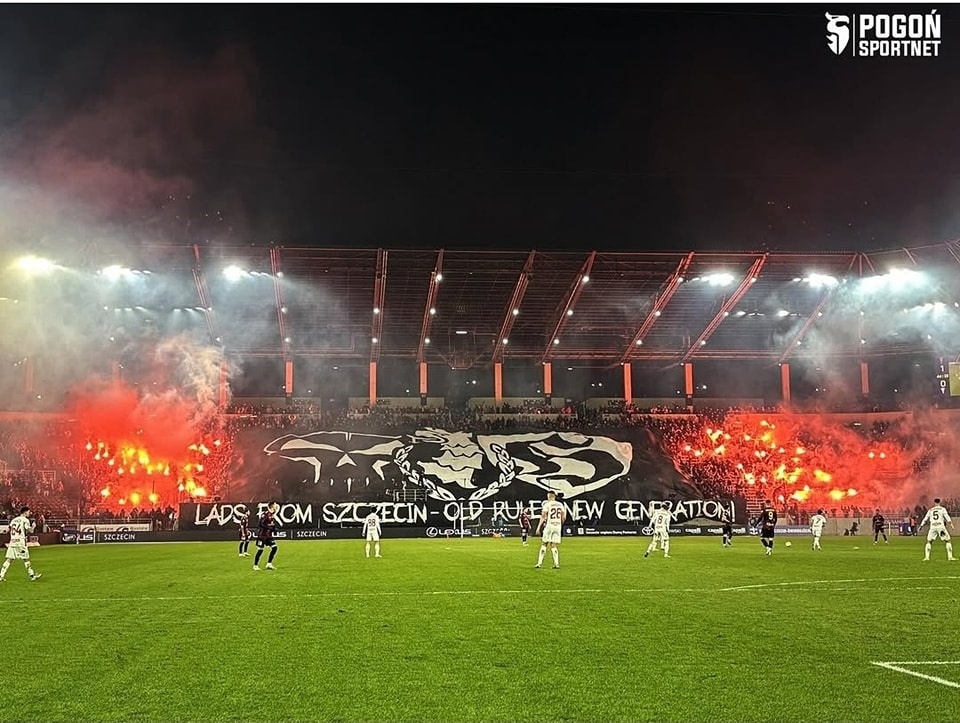Poza tym często bluzgamy na Pogoń i ich nowych przyjaciół, gdyż Paprykarze dołączyli już oficjalnie do obozu WRWE. Ci zresztą nie byli nam dłużni. W ich młynie widoczna kilkunastoosobowa grupa śmieRdzących ultrasów, która pomagała im przy oprawie, podczas I połowy. Choreografia w czarno-białej tonacji pt. „LADS FROM SZCZECIN – OLD RULES, NEW GENERATION!” do której rozwinięto sektorówkę z logiem grupy, klubu i herbem Hooligans. Całość uzupełniono pirotechnikom odpalaną w dwóch etapach.