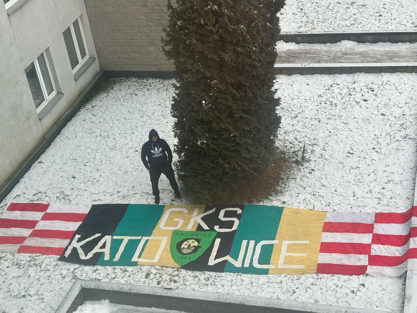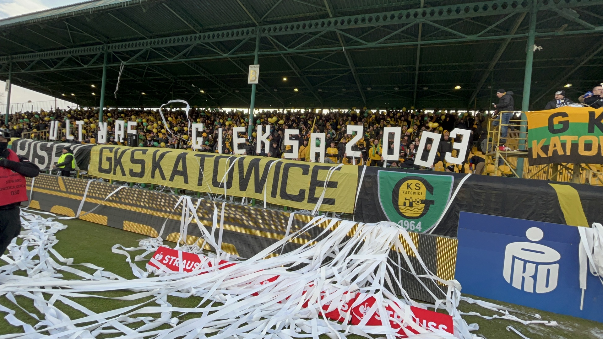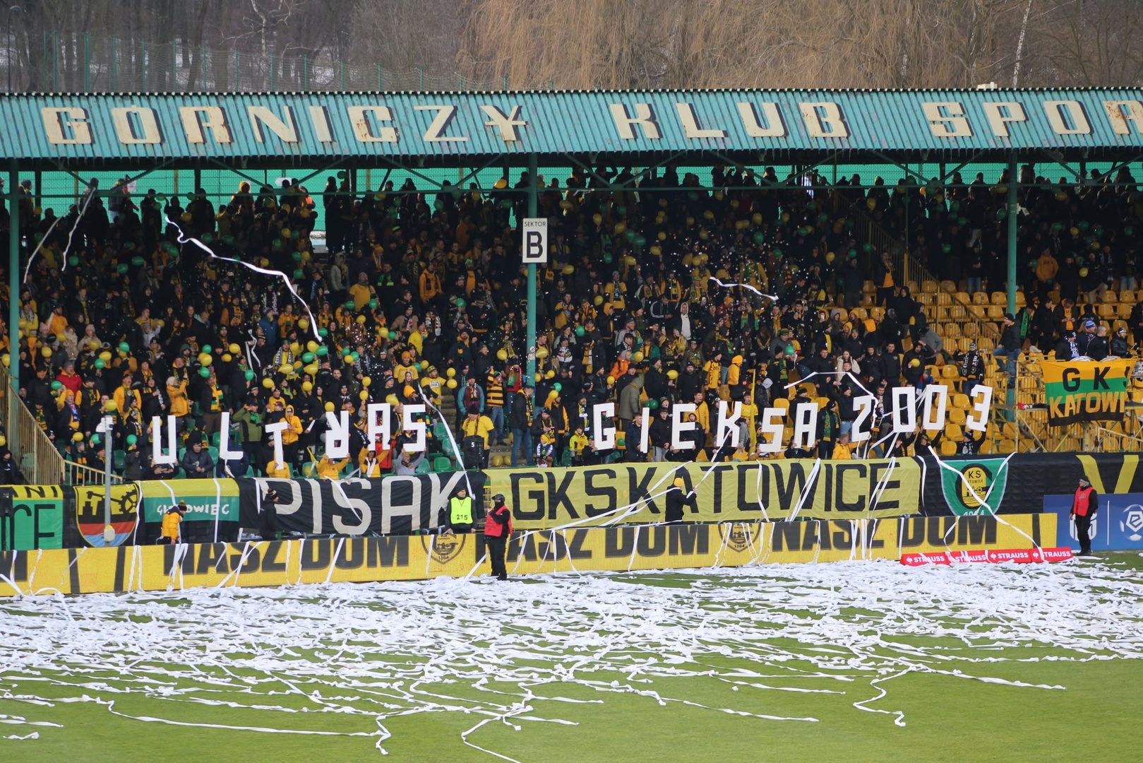 Oflagowanie: GKS DUMA ŚLĄSKA, FAN – CLUB GKS KATOWICE, RYDUŁTOWY, MARIHUANA – GKS KATOWICE WEŁNOWIEC, KLUCZE, NFG, HERB, BRIGADE GERMANY, WIERNI I ODDANI GKS KATOWICE, TYLKO NIEŻYWI PRESTANIEMY BYĆ MŚCIWI, BANIK OSTRAVA, GKS KATOWICE, LIBIĄŻ, WIERNI I DUMNI GKS KATOWICE, GISZOWIEC, PISAK, GKS KATOWICE (żółta), VIP, BUROWIEC, DĄBRÓWKA MAŁA, GKS KATOWICE (pasy + biało czerwone wstawki), oraz na gnieździe GKS KATOWICE (gardina).