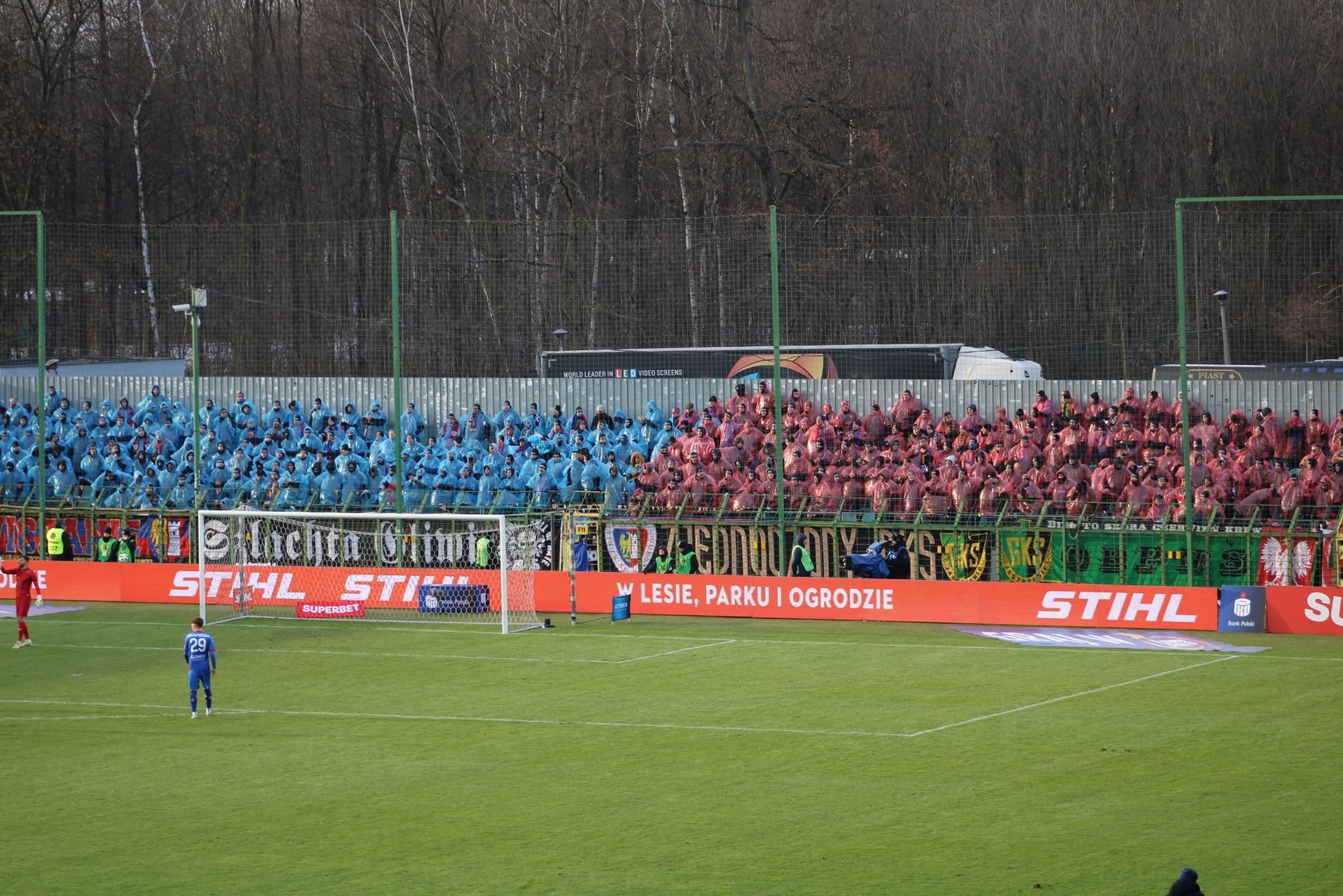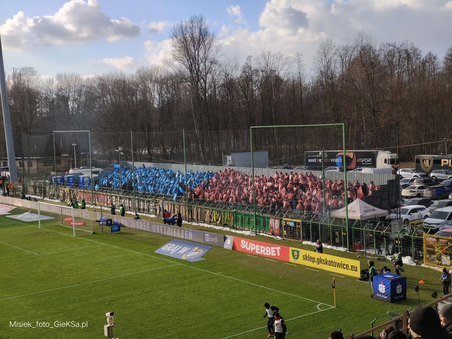 Nie zabrakło również wymiany nieuprzejmości z Piastuchami i ich koleżankami, którzy przyjechali transportem kołowym na godzinę przed rozpoczęciem. Ci najbardziej gotowali się gdy pozdrawialiśmy Górnik, w szczególności gliwicka Torcidę. Tym bardziej że Żabole tego dnia wspierali nas w 150 osób i zajęli miejsca najbliżej sektora gości, co skutkowało słownymi utarczkami jeszcze długo po meczu. Niebiesko-czerwoni w ramach oprawy w około 25 minucie ubrali niebieskie i czerwone pelerynki. Niebiesko-czerwoni określili się na 410 głów w tym GKS Jastrzębie (70) i ich nowi koledzy z RKS Radomsko (31), których chciano przywitać odpowiednio na Górnym Śląsku, lecz ten pomysł nie spodobał się palanterii, która zachowała czujność tego dnia — CHWDP. Cała grupa dodatkowo ubrana była w jednakowe czapki „NIGDY”.