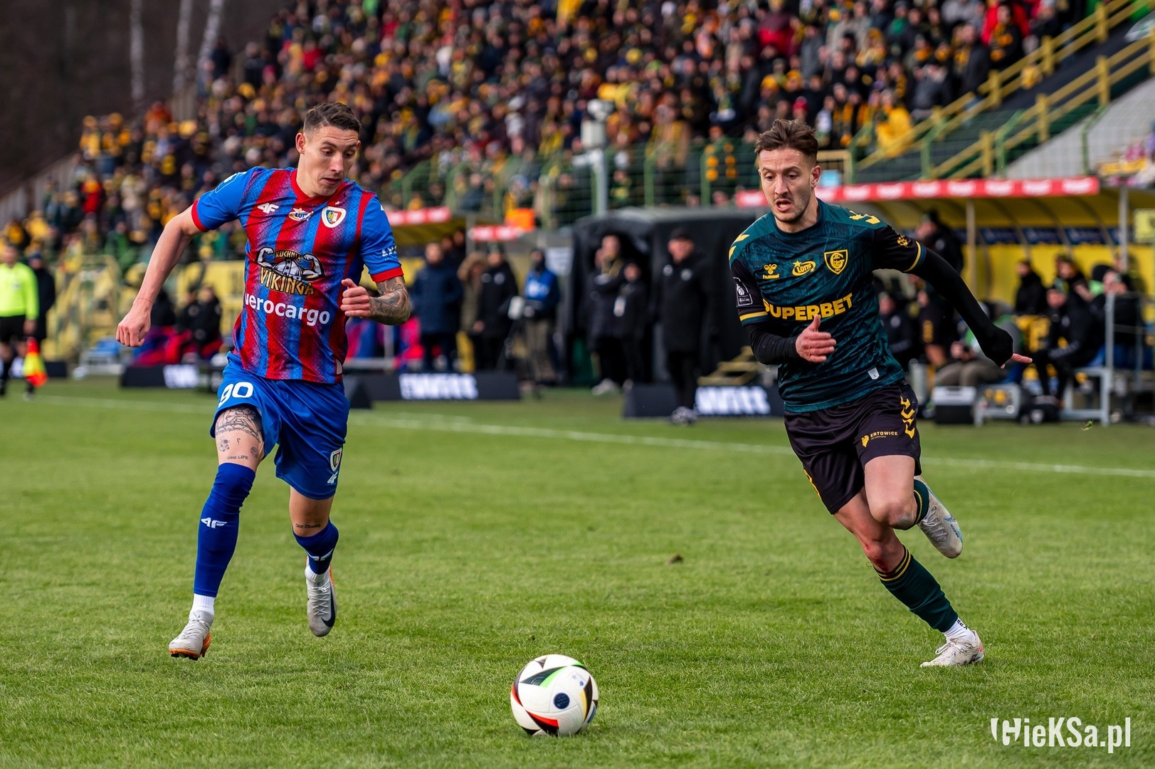 GieKSa bezbramkowo zremisowała z Piastem Gliwice po meczu pełnym walki wręcz. Katowiczanie po raz pierwszy zaprezentowali się w koszulkach upamiętniających Bukową 1a. Do derbów oba zespoły przystąpiły w okrojonych składach, choć mimo to nie musiało to oznaczać widocznego zjazdu boiskowych umiejętności. Trójkolorowi skorzystać nie mogli z Oskara Repki i Adama Zrelaka, jednak przed meczem usłyszeliśmy bardzo pozytywną informację – Oskar Repka zostaje w GieKSie do końca czerwca 2027 roku! Pierwsze kopnięcie należało do przyjezdnych, jednak na to wydarzenie czekaliśmy kilka minut po planowanej godzinie, co wynikało z wydarzeń okołomeczowych. Akcją oskrzydlającą zaskoczyć Kuuska próbował Erik Jirka, ale doświadczony stoper powstrzymał go z łatwością. Po chwili byliśmy już pod drugą bramkę, gdzie Bartosz Nowak perfekcyjnie obsłużył Kowalczyka, skończyło się na cornerze. Nieco lepsza kontrola nad piłką znacząco zwiększyłaby szanse młodzieżowca na zdobycie bramki, jednak i tak należy docenić obu piłkarzy za tę akcję. Wyskoczenie Kuuska w 9. minucie przed linię obrony skończyło się groźną akcją Piasta, na szczęście strzał z dystansu przeleciał wysoko nad poprzeczką. Odpowiedź GieKSy nadeszła po ofiarnym odbiorze Milewskiego, który zaryzykował przejęcie własną głową. Goście musieli faulować Bergiera, by zatrzymać kontrę. Dobra centra z głębi pola po tym stałym fragmencie Bartosza Nowaka pozwoliła zyskać rzut rożny, po którym zapanował prawdziwy chaos w szesnastce – niestety bez efektów. W 13. minucie Jędrych popełnił duży błąd przy kryciu indywidualnym na spółkę z Czerwińskim, jednak wcześniej udało im się skutecznie założyć pułapkę ofsajdową. GieKSa spokojnie kreowała swoje okazje, a Piast był przygotowany i od razu zamykał przestrzenie w okolicach linii bocznej. Rafał Górak miał jednak w zanadrzu śmiertelną broń, czyli Bartka Nowaka, który był nie do powstrzymania. W 20. minucie Adrian Błąd staranował Igora Drapińskiego (w ramach przepisów) i pognał z piłką na bramkę rywali, niestety Marcin Wasielewski nie doszacował dystansu i zepsuł dośrodkowanie. Dużo lepiej wrzucał Borja Galan po drugiej stronie boiska, poprzedzając to swoim popisowym dryblingiem na skraju boiska, czym wywalczył rzut rożny. Długie i misterne rozegranie skończyło się na bardzo złej próbie minięcia rywala przez Arkadiusza Jędrycha. W 26. minucie Michał Chrapek wykonał salwę na cześć bogów z Olimpu, wykopując daleko ponad stadion. Swą klasę Kuusk potwierdził na zamknięcie drugiego kwadransa gry, umiejętnie blokując przeciwnikowi dostęp do piłki we własnej szesnastce. W 31. minucie Dawid Kudła zagrał futbolówkę po nodze napierającego rywala, bardzo mocno ryzykując utratą bramki. Po faulu Kowalczyka miał miejsce rzut wolny, w efekcie którego Jorge Felix miał wyśmienitą okazję do otworzenia wyniku, fatalnie jednak spudłował. Zupełnie przypadkowo Marcin Wasielewski dopisał sobie kluczowe podanie, blokując wybicie Jakuba Czerwińskiego, Sebastian Bergier został powstrzymany tuż przed próbą finalizacji. Rzut rożny znów skończył się na błędzie technicznym naszego kapitana. W 44. minucie Bartosz Nowak kąśliwie uderzył tuż przy słupku z rzutu wolnego na 25. metrze, musiał wysilić się Frantisek Plach przy interwencji. Na rozpoczęcie drugiej części Borja Galan uraczył nas zejściem do prawej nogi i soczystym rogalem z dystansu, który minął bramkę o naprawdę niewiele. W 49. minucie Erik Jirka potężnie huknął między gospodarzami, zmuszając Dawida Kudłę do efektownej interwencji. Po drugiej stronie boiska Bartek Nowak próbował wykreować okazję do zdobycia bramki, zabrakło najpierw dobrego przyjęcia przez niego piłki, a później zagrania o kilka milimetrów więcej obok obrońcy. W 55. minucie zobaczyliśmy kolejne podanie przecinające od Nowaka, tym razem Sebastian Bergier przyjęciem piłki wpadł wprost na rywala. Następne tego typu podanie z udziałem tych samych GieKSiarzy skończyło się kartonikiem dla Munoza. Znów rzut rożny zaowocował kolejnym nieudanym zagraniem Jędrycha, choć tym razem nieco lepiej to wyglądało. W 64. minucie Filip Szymczak i Bartosz Nowak dość widowiskowo wyprowadzili kontratak, niestety nie udało się go sfinalizować. Milewski imponował swoją walecznością przez cały mecz, prawdziwy zakapior. W 73. minucie Kowalczyk własnym ciałem zatrzymał strzał wynikający z prostej straty Nowaka. Dość kuriozalna sytuacja miała miejsce w 80. minucie, poturbowany Sebastian Milewski za linią końcową nie wiedział, że został zmieniony i próbował wejść na plac gry. W 85. minucie Borja Galan doskonale zagrał na ścianę z Szymczakiem, jednak przy finalizacji zabrakło mu nieco opanowania i bramkarz zdołał uratować sytuację. Na koniec spotkania Jirka huknął z woleja w okienko, Dawid Kudła wyciągnął się jak struna, by to wybronić.