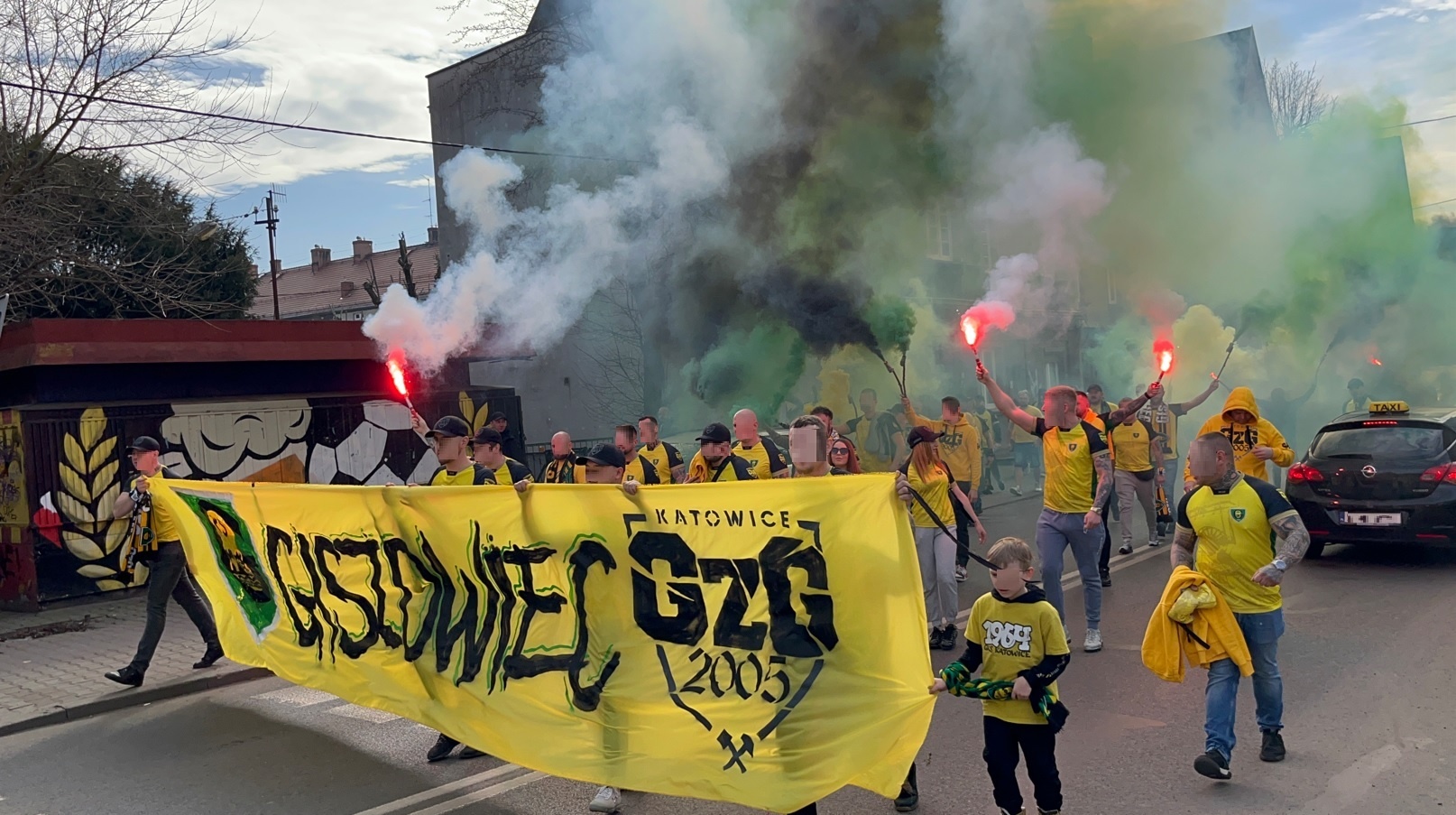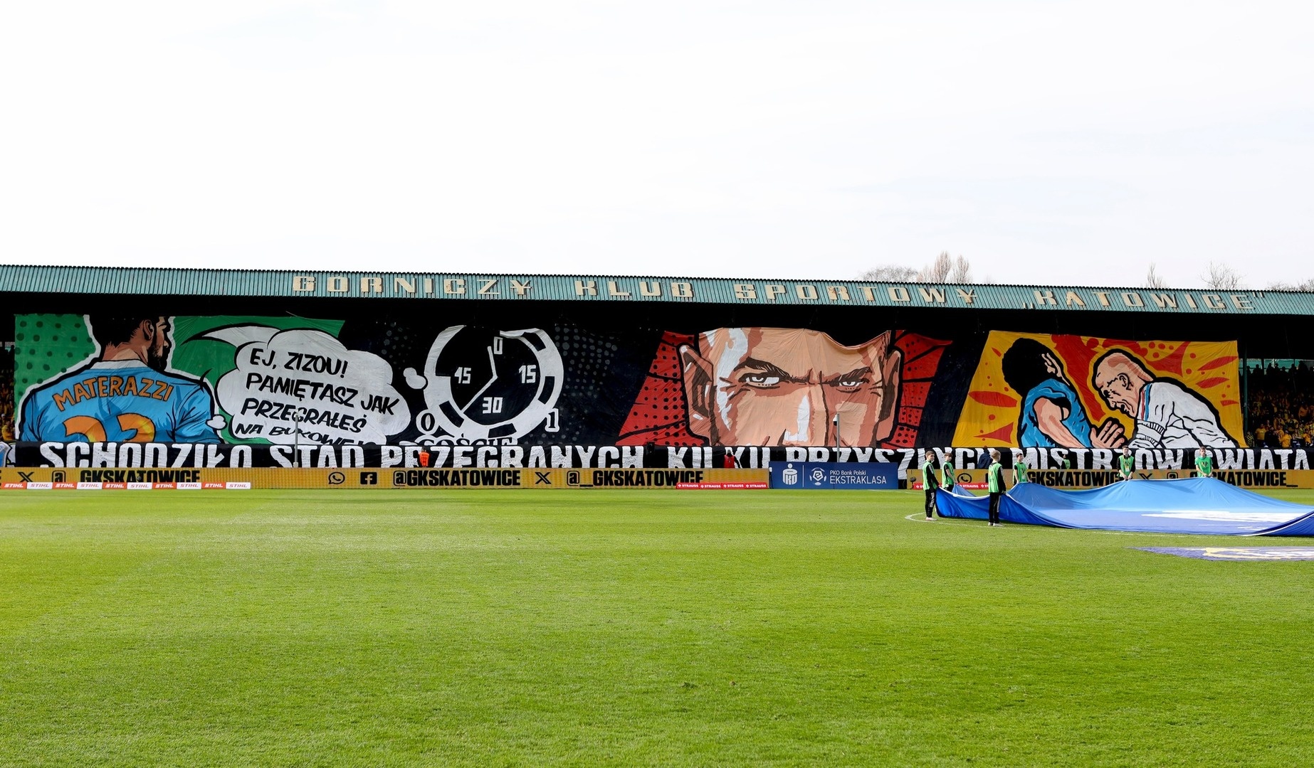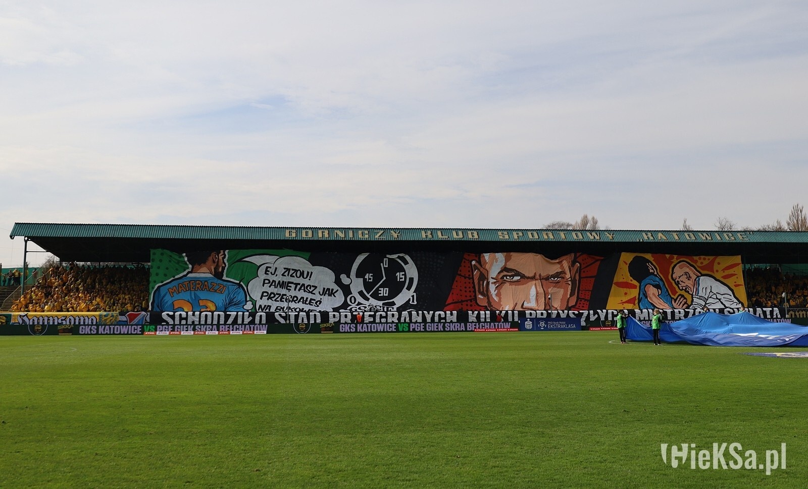 Na wyjście piłkarzy pod dach Blaszoka podciągnięto sektorówkę ujawniającą powód, dla którego Zinedine Zidane uderzył głową Marco Materazziego, podczas słynnego finału MŚ 09.07.2006. Ultrasi, przedstawiając tę historię w komiksowej grafice, w której Włoch komentarzem przypomina Francuzowi jak ten przegrał z GieKSą słowami „Ej, Zizou! Pamiętasz jak przegrałeś na Bukowej?”. Kolejny obraz przedstawiał stary zegar z Bukowej, przypominający wynik meczu z Bordeaux w 1994 roku, którego wspomnienie rozwścieczyło Zizou, do słynnego ataku „z byka”, co było zobrazowane w kolejnych dwóch okienkach. Całość opisał transparent ukazujący się po opadnięciu sektorówki „SCHODZIŁO STĄD PRZEGRANYCH KILKU PRZYSZŁYCH MISTRZÓW ŚWIATA”, doskonale obrazujący fakt, że w całej historii Bukowej, nasz stadion gościł największe światowe osobistości piłki nożnej gdzie zostali odprawieni z kwitkiem. Finalnym etapem tej oprawy było odpalenie świec dymnych, które utworzyły żółto-zielono-czarną ścianę, do której w końcowej fazie dodano rząd czerwonych rac u dołu Blaszoka.