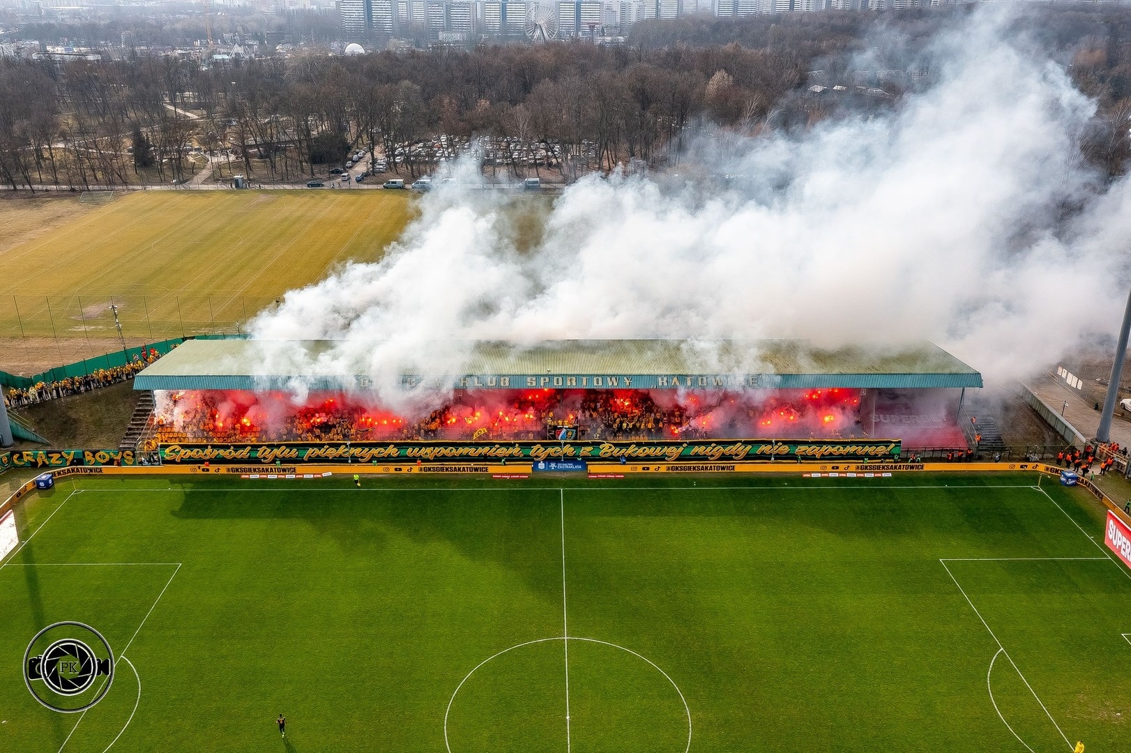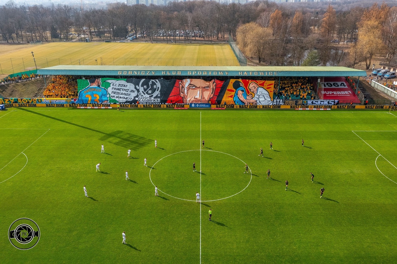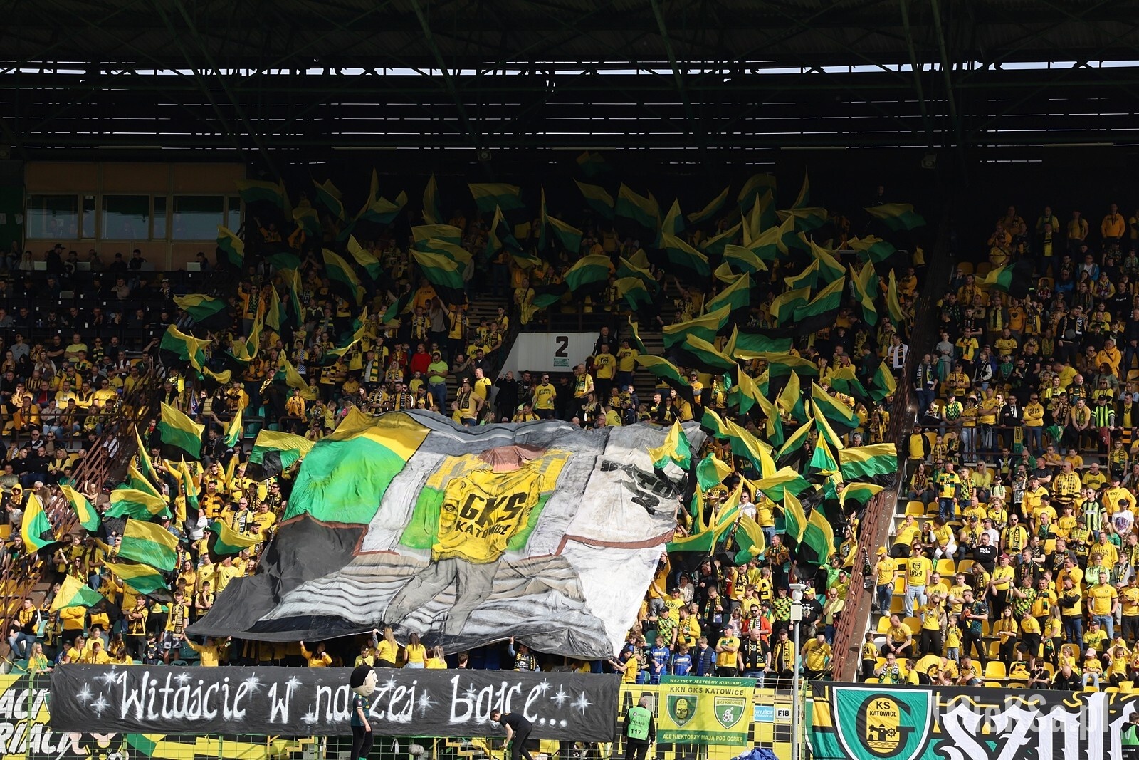 Oflagowanie: transparent MAŁOLACI TO WARIACI (S2), SZALEŃCY Z BUKOWEJ (S1), UZNANI GENTLEMANI, PERSONA NON GRATA, ANTY KOMUNA – GKS KATOWICE, ONE NINE SIX FOUR, JKS – GOOD NIGHT LEFT SIDE, DUMA ŚLĄSKA, CRAZY BOYS, ŚP. MUCHA, HANYSOWO, SILESIAN FAMILY, GKS KATOWICE, VIP, GÓRNICZY KLUB SPORTOWY, KSGKS, oraz na gnieździe ULTRAS FCB & GKS.