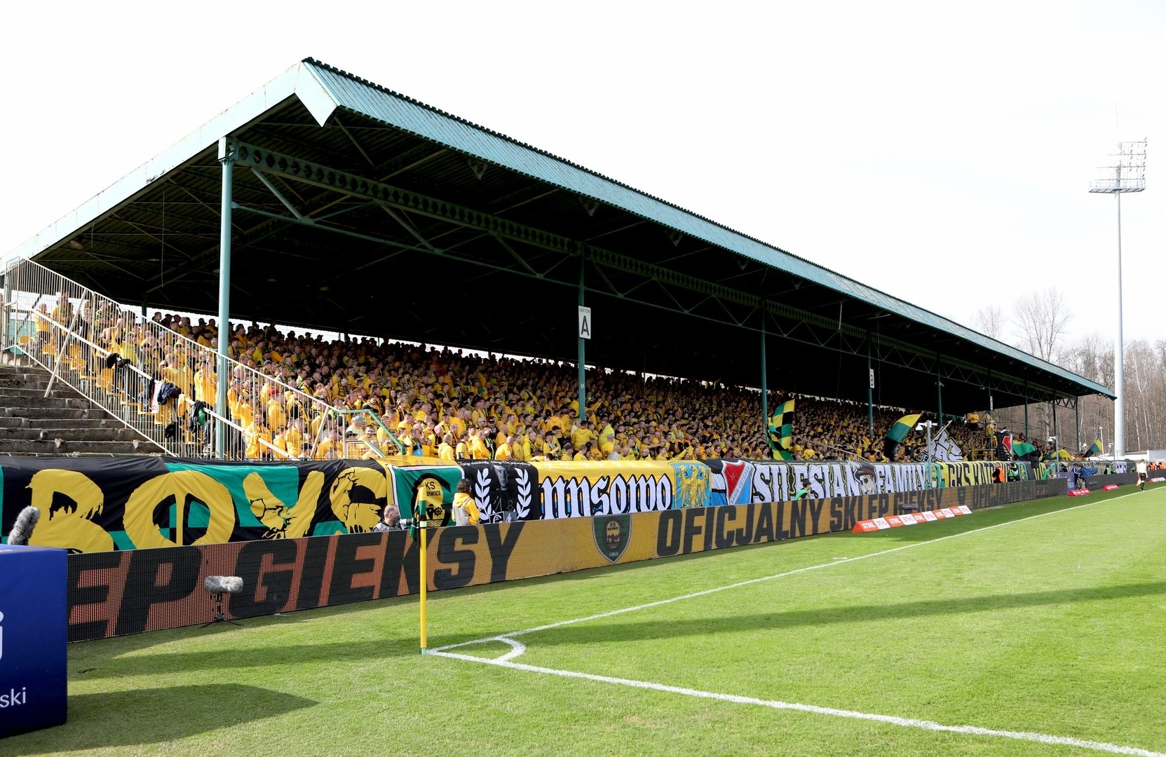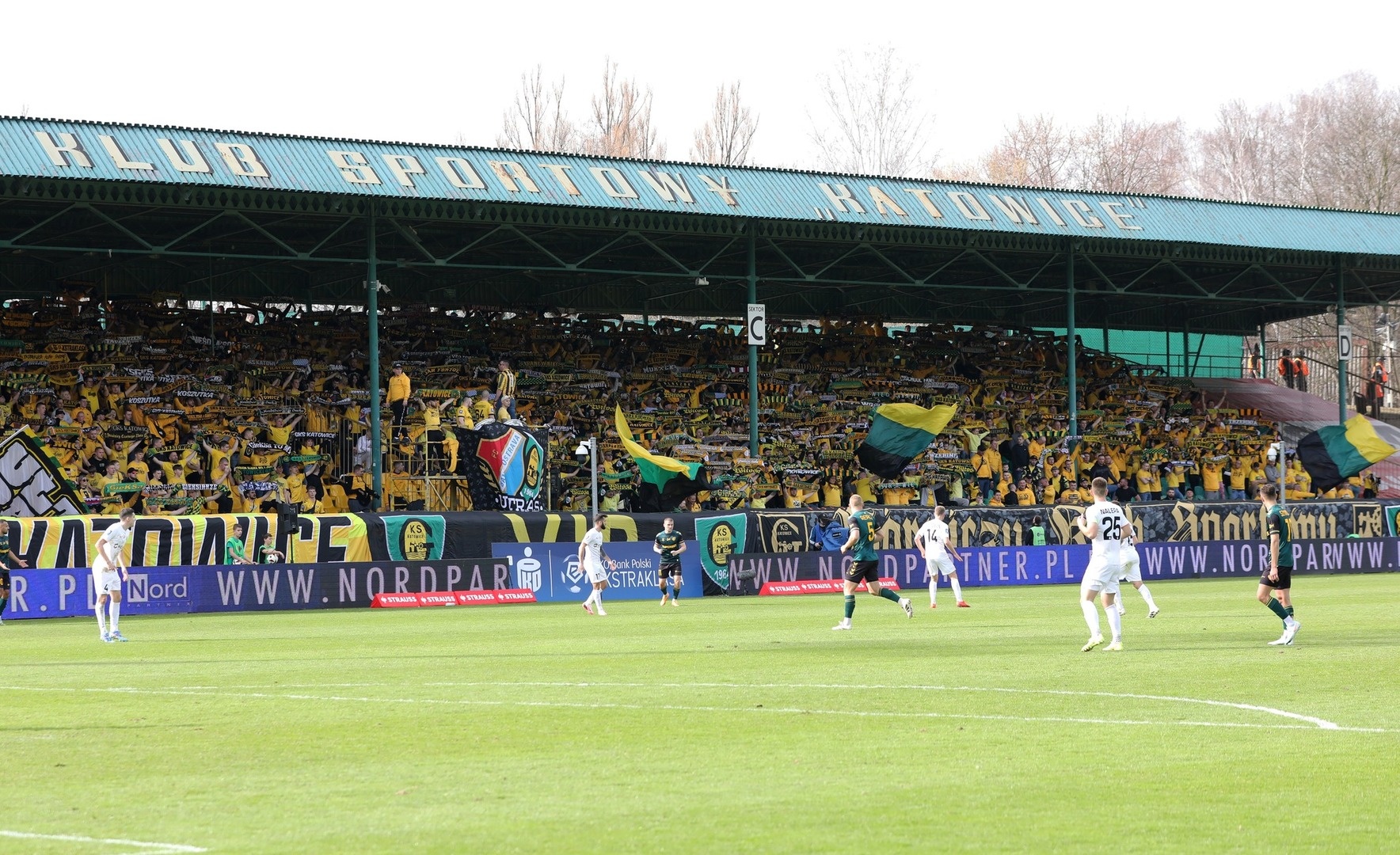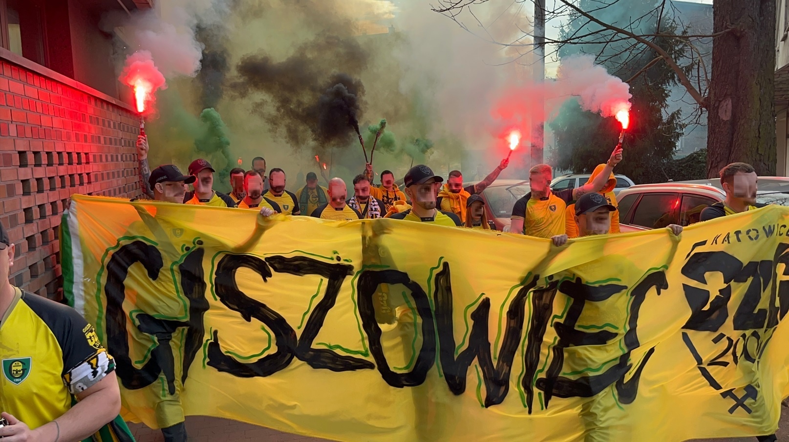 Oflagowanie: transparent MAŁOLACI TO WARIACI (S2), SZALEŃCY Z BUKOWEJ (S1), UZNANI GENTLEMANI, PERSONA NON GRATA, ANTY KOMUNA – GKS KATOWICE, ONE NINE SIX FOUR, JKS – GOOD NIGHT LEFT SIDE, DUMA ŚLĄSKA, CRAZY BOYS, ŚP. MUCHA, HANYSOWO, SILESIAN FAMILY, GKS KATOWICE, VIP, GÓRNICZY KLUB SPORTOWY, KSGKS, oraz na gnieździe ULTRAS FCB & GKS.