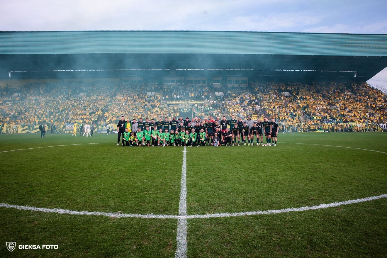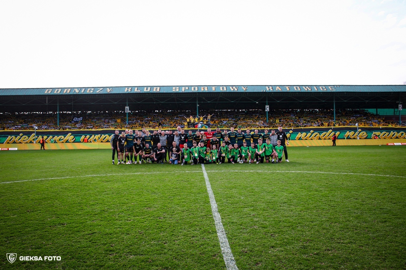 W tym sentymentalnym dniu dla wszystkich fanów i bywalców przy ulicy Bukowej piłkarze stanęli na wysokości zadania i pożegnali stadion zwycięstwem! Na długo przed spotkaniem kibice mogli odwiedzić liczne atrakcje, w tym spotkać się z legendami zespołu. Na trybuny wystrzelone zostały koszulki klubowe, a sami kibice przygotowali także fenomenalne oprawy. Spotkanie zaczął Arkadiusz Jędrych popisowym już wybiciem pod pole karne rywali. Poprawka tego zagrania po przechwycie zupełnie mu nie wyszła i Zagłębie ruszyło z groźną kontrą już na samym starcie. Po udanym pressingu Błąda GieKSa znów odzyskała posiadanie i tym razem cierpliwie konstruowała akcję, Filip Szymczak finalnie otrzymał piłkę na 1 na 1 z obrońcą i przegrał pojedynek fizyczny. W 5. minucie fatalnie podał Klemenz do Borjy Galana na skrzydle, na jego szczęście przyjezdni zamiast strzału wybili piłkę wysoko nad stadion. Hiszpański wahadłowy zanotował w kolejnej akcji bardzo dobre podanie na kilkadziesiąt metrów ziemią do Szymczaka, który miał olbrzymie kłopoty z przyjęciem. Powtórka z akcji nieco wyżej była ledwo chwilę później i znów napastnikowi piłka odbiła się od ochraniaczy. W 10. minucie Adrian Błąd z Bartoszem Nowakiem dosłownie przedarli się przez zasieki rywala, wywalczając rzut wolny w zdawało się straconej akcji. Po złym podaniu Repki do Kowalczyka Zagłębie Lubin na pełnej szybkości wpadło w pole karne GieKSy, piłka po główce minimalnie minęła bramkę bezradnego Kudły. W 17. minucie koronkową akcję Galana skrzydłem zepsuł Repka podaniem do nikogo, choć pomysł zagrania za linię obrony był niezły. W 21. minucie Alan Czerwiński poślizgnął się przy dośrodkowaniu, a niepilnowany przez niego zawodnik gości „zachował się fair” i uderzył niecelnie. Odpowiedział na to Borja Galan po świetnym wejściu z głębi pola Czerwińskiego, schodząc na prawą nogę i uderzając podobnie niecelnie. Dwie minuty później wahadłowy urwał się flanką i dograł na 6. metr do Szymczaka, obrońca z trudem zdołał wyblokować uderzenie, brakowało ułamka sekundy. Świetnym podaniem przez całą szerokość boiska popisał się Adrian Błąd, a Borja Galan dzięki niemu wywalczył wrzut z autu na wysokości pola karnego. Następne kilkanaście minut toczyło się w środku pola, ze sporadycznymi i nieudanymi próbami ataków z obu stron, najwięcej zagrożenia było po rzucie rożnym w okolice poprzeczki Bartosza Nowaka w 36. minucie. W 40. minucie Czerwiński niczym we wrestlingu wypchnął rywala aż za bandy reklamowe, potem po dżentelmeńsku pomagając mu wrócić na boisko. Drugą odsłonę rozpoczął Pieńsko minimalnie niecelnym strzałem z dystansu. Zagłębie mocno naciskało na GieKSę, która miała problem z wyprowadzeniem ataku. Dobra okazja do tego była w 50. minucie po wyprowadzeniu piłki przez Repkę na skrzydło, ale Alan Czerwiński bardzo niecelnie dośrodkował. W polu karnym trzy minuty później poczarował Wasielewski po doskonałym podaniu Błąda, ale nikt nie był chętny na finalizację jego podania. Odbita piłka w 55. minucie trafiła do Szymczaka, który z całej siły kopnął w obrońcę, a futbolówka szczęśliwie trafiła pod nogi Kowalczyka. Młodzieżowiec pognał lewym skrzydłem i w ostatniej chwili wybito mu piłkę spod nóg. W 57. minucie zawodnik gości popisał się błyskotliwym dośrodkowaniem do operatora kamery stojącego na wysięgniku za bramką. W 59. minucie po rzucie rożnym Bartosza Nowaka z woleja uderzał Arkadiusz Jędrych, Dominik Hładun z trudem sparował strzał. Minutę później nasz kapitan wrócił z dalekiej podróży, gdy źle obliczył tor lotu piłki i musiał ratować się ostrym wślizgiem, na szczęście trafił w piłkę. Katowiczanie z czasem odzyskali kontrolę gry, jednak nadal brakowało konkretów. W 70. minucie bardzo źle wybił Klemenz, wprost pod nogi rywala, Kudła musiał interweniować na przedpolu po wrzutce. W 76. minucie Bartosz Nowak bezpardonowo wszedł w rywala, zabrał piłkę i wypuścił Bergiera skrzydłem, który dośrodkował do nikogo. Niby nic z tej akcji nie było, a tu Adrian Błąd urwał się niepilnowany na flance i dograł na 5. metr do Sebastiana Bergiera, który wpakował piłkę do siatki! Kibice długo świętowali, na kilka minut pogrążając stadion w nieustającym głośnym dopingu. Aleks Ławniczak miał doskonałą sytuację na wyrównanie wyniku z rzutu rożnego, ale znacząco chybił. Kolejny rzut rożny zakończył się podobnie, Trójkolorowi nie potrafili odpowiednio pokryć przyjezdnych. Już w doliczonym czasie gry nagle starli się ze sobą Wdowiak i Bergier, niby jelenie siłując się czołami – zasłużenie obejrzeli po kartoniku. Rafał Górak w przypływie emocji kopnął blok reklamowy, niewątpliwie zwracając uwagę na markę znajdującą się na nim. Sędzia zagwizdał i…