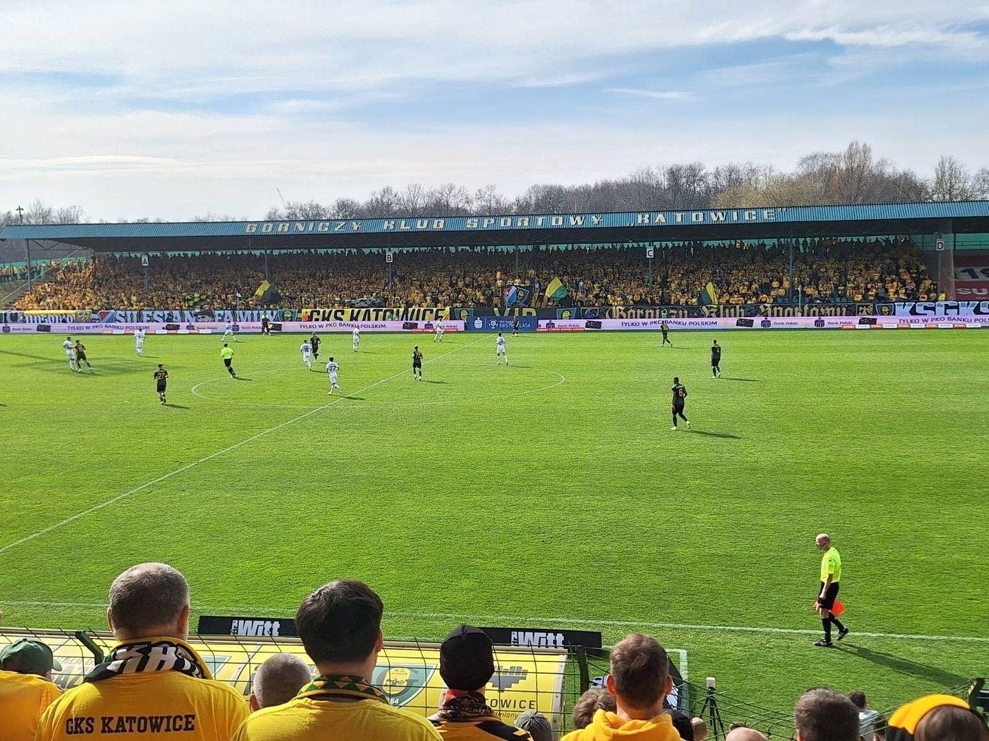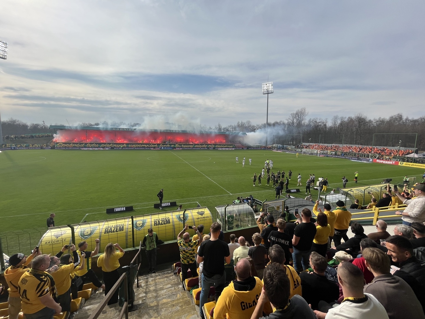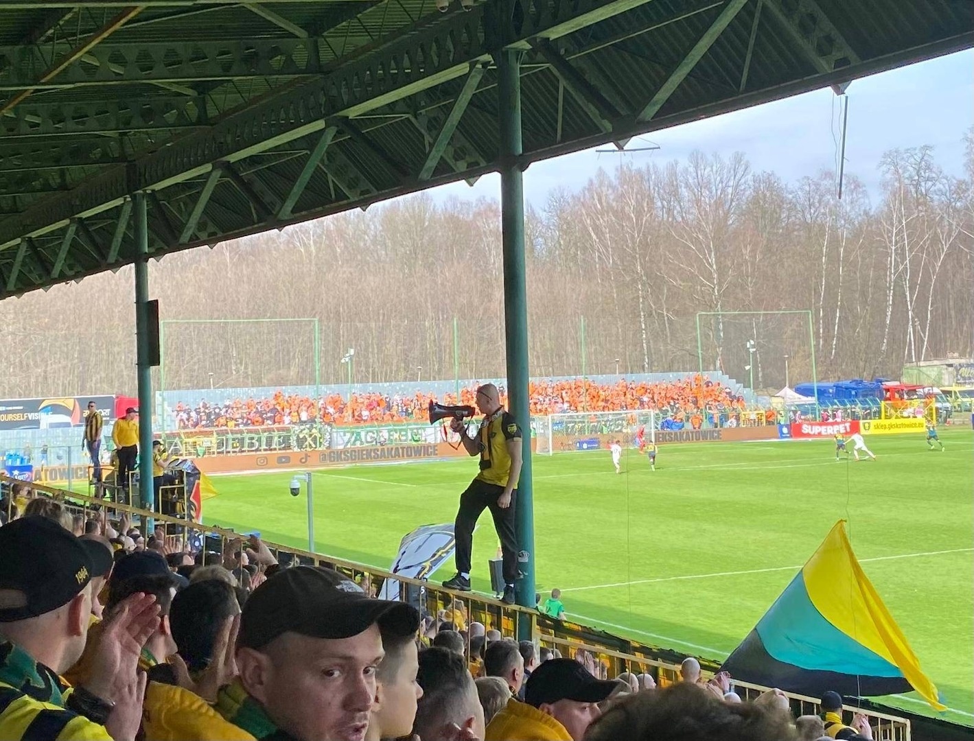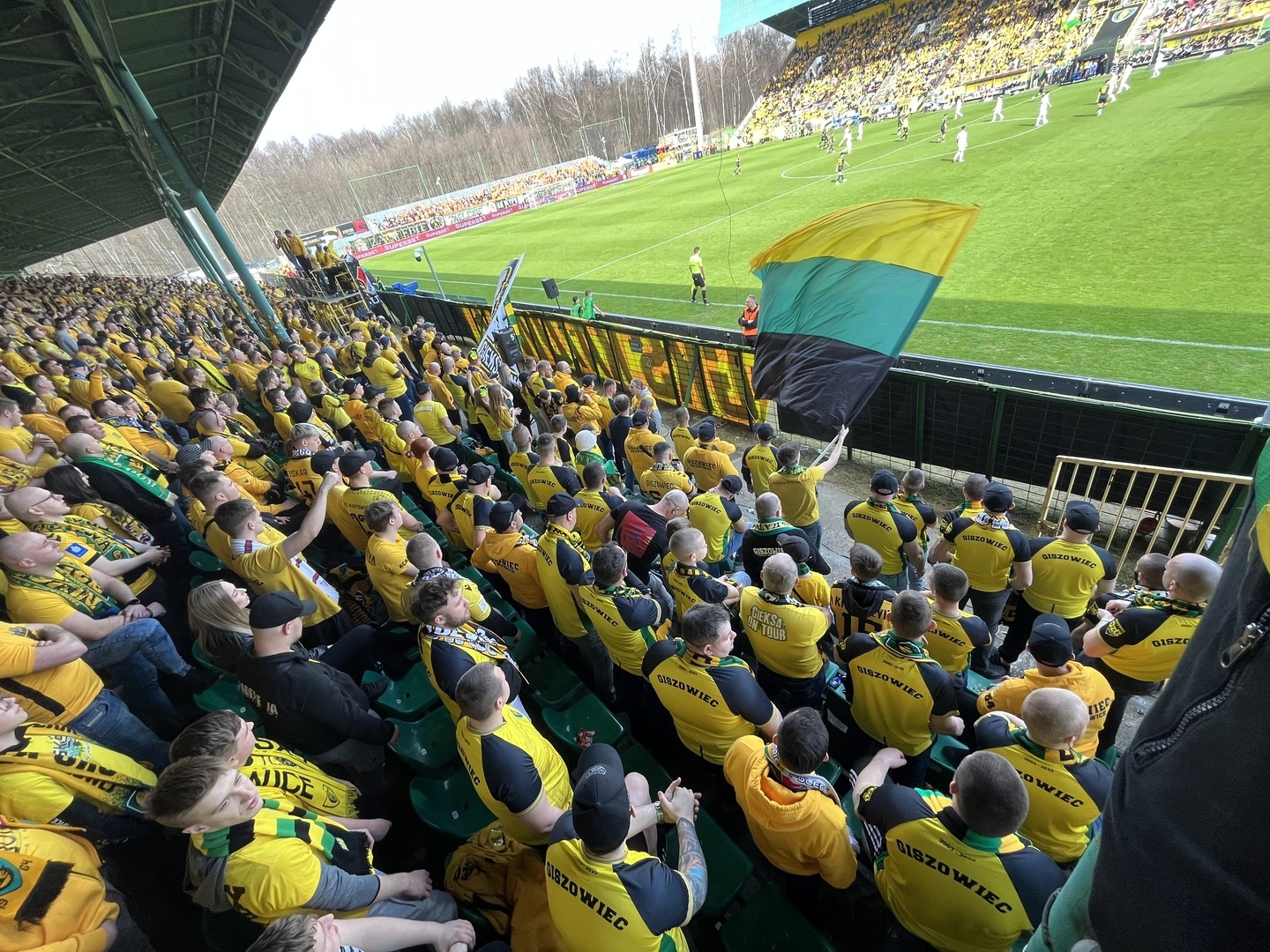 Potem już do końca pierwszej połowy skupiliśmy się tylko na wokalnym wsparciu, uzupełniając prezentacje ubranych na żółto fanatyków, poprzez pojawienie się 6 chorągwi.