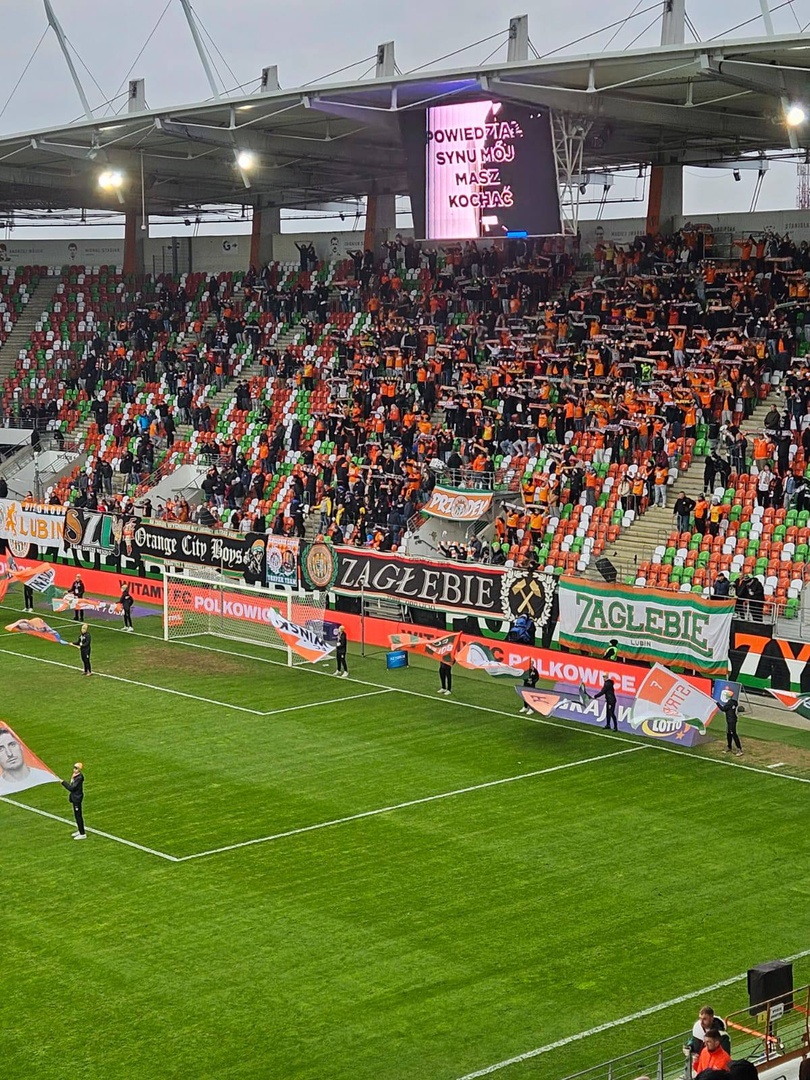 Na piątkową eskapadę Górnika do Lubina ruszamy z Zabrza niemal w samo południe, podróżując asfaltowym szlakiem. Nie obyło się bez postojów, lecz mimo to pod stadionem Krecików meldujemy się na godzinę przed startem piłkarskich zmagań. Wejście szybkie i sprawne, choć pies szkolony do wykrywania piro obwąchiwał cały asortyment zabrzańskich ultrasów (torby z flagami, bęben, megafony).