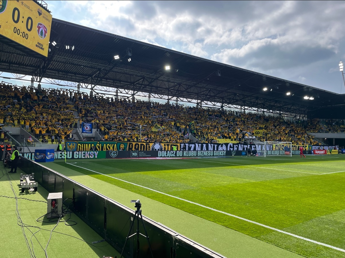 Choć wedle terminarza, drugi mecz na Nowej Bukowej z mało atrakcyjnym rywalem, miał być z cyklu tych, gdzie atmosfera zelżeje i pokaże nam, jak mogą wyglądać te najzwyklejsze spotkania na Arenie Katowice, to trzeba jednak pamiętać, że wciąż jest wielu kibiców, którzy nie załapali się na mecz otwarcia i spotkanie z Puszczą było dla nich tym pierwszym. Dzięki temu na stadionie pojawiło się ponad 12 tysięcy widzów, w tym 250-osobowa grupa Żubrów, z czego 80 osób z akademii Puszczy. Kibice z Niepołomic zasiedli w jednym z narożników, wywieszając flagi za swoimi plecami. Dopingowali, lecz nie cały mecz.