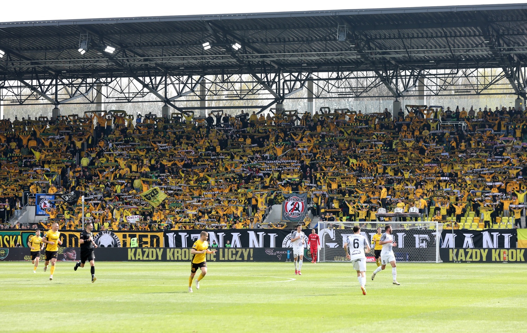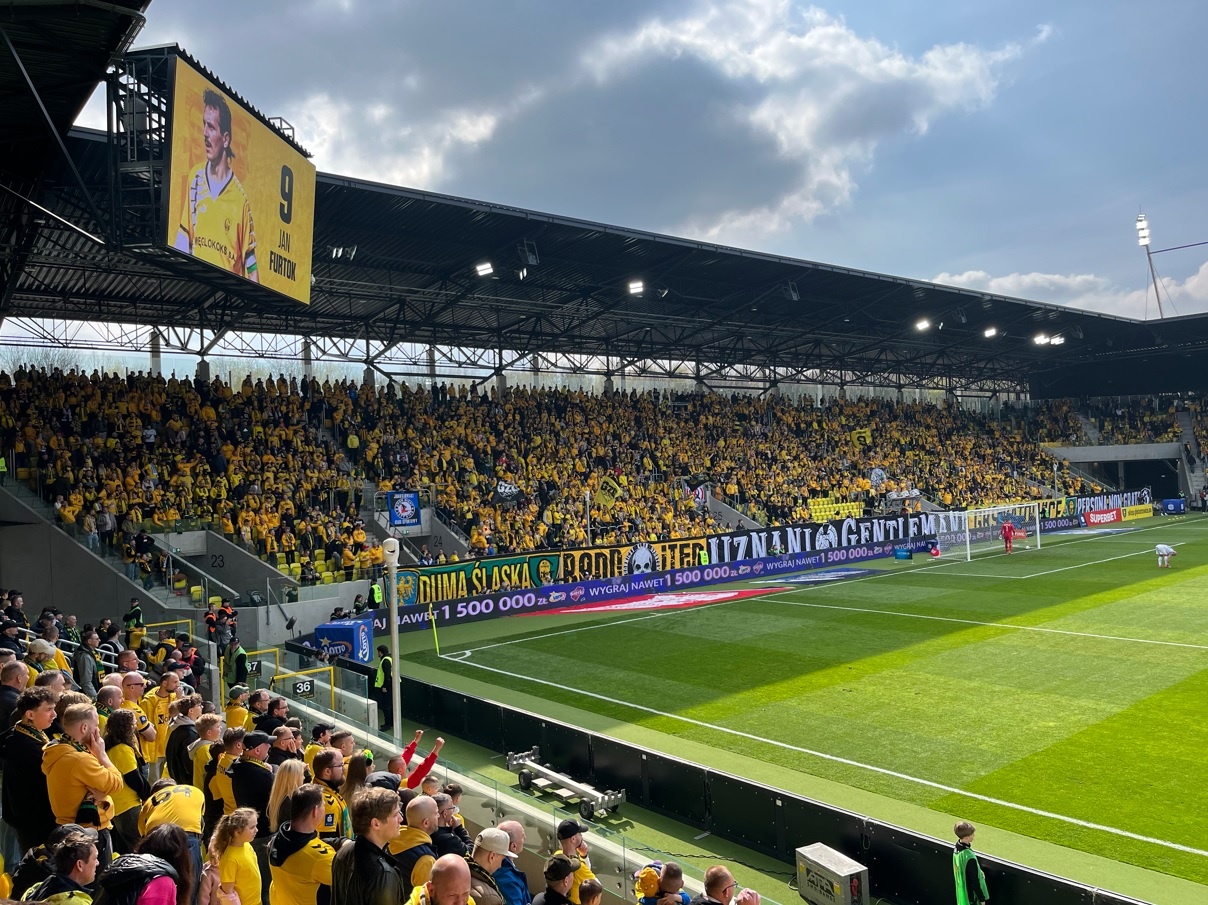 Z drugiej strony, pełny Blaszok przyozdobiło 8 flag i transparent z pozdrowieniami do więzienia dla kibica z Koszutki. Mecz jednak zaczynamy w ciszy, by uczcić w ten sposób pamięć Leo Beenhakkera — Holendra, który był trenerem reprezentacji Polski i zmarł 10 kwietnia. Potem gdy już piłka była w grze, chciałoby się napisać, że „nikt nie szczędził gardeł”, lecz tak nie było. Młynowi próbowali wykrzesać więcej decybeli, lecz stracona bramka w 10. minucie i gra katowiczan nie pomagała. Oczywiście doping nie był zły, ale jednak niegodny GieKSy! Wymagajmy od siebie więcej. Przynajmniej tego, na co mogli liczyć piłkarze w drugiej połowie. Mega uskrzydliła nas bramka kontaktowa, bo czuć było wiarę, że to nie ostatnie słowo GKS-u i było to słychać, tym bardziej że większość stadionu stała, przyłączając się do dopingu. Nagrodzono nam to i GieKSa ostatecznie wygrała 3:1, budując legendę Nowej Twierdzy.