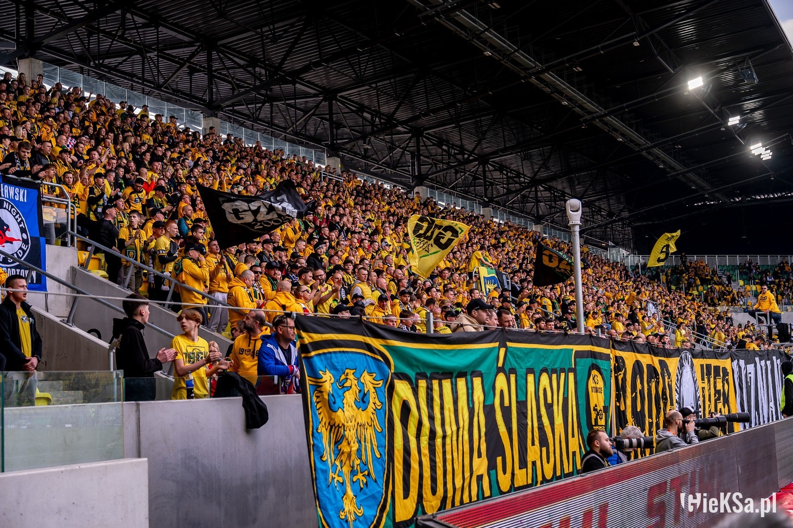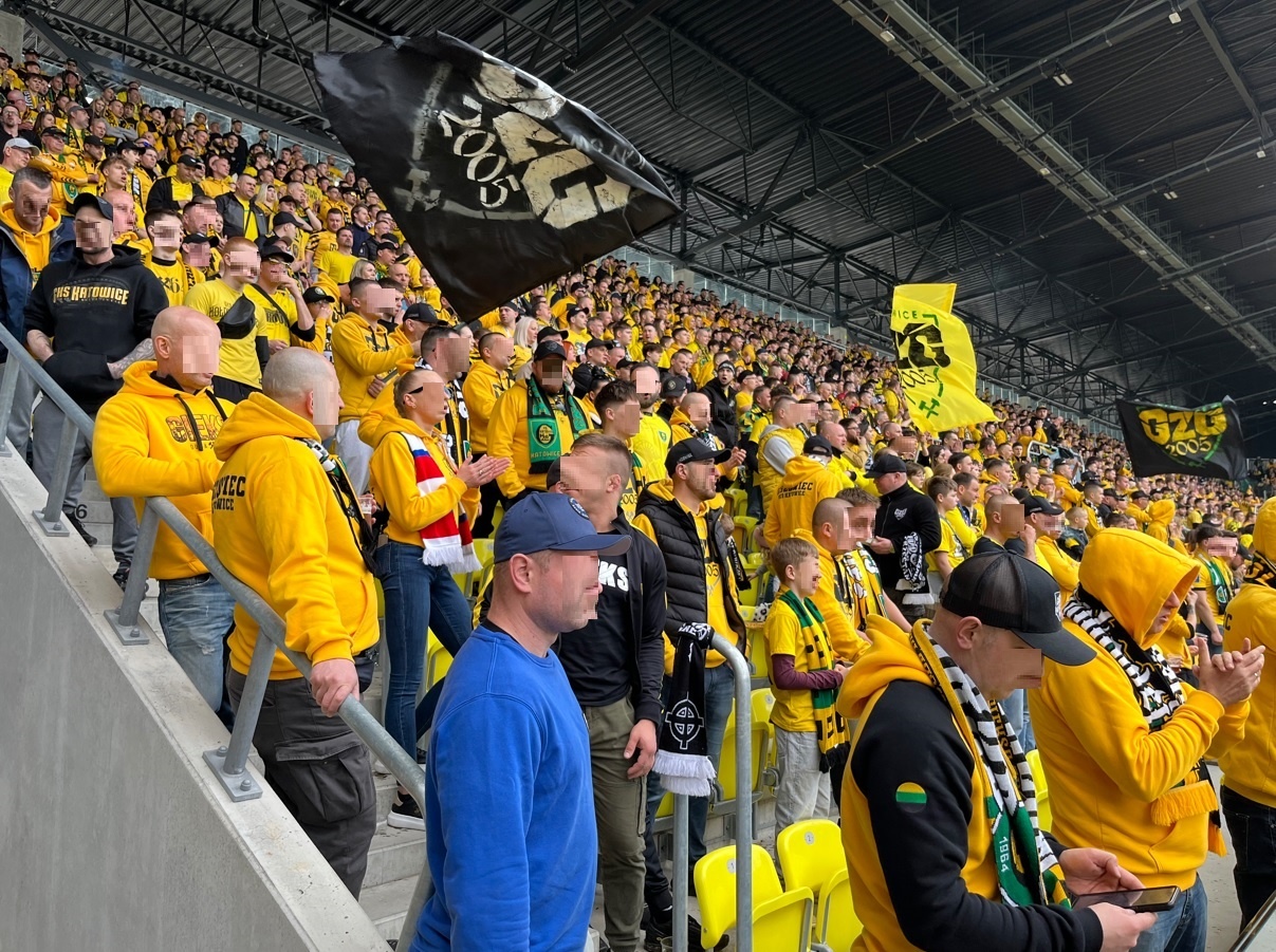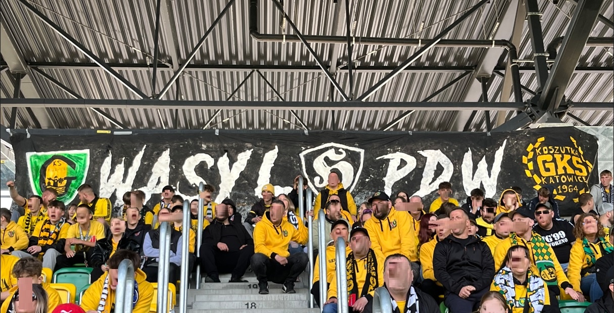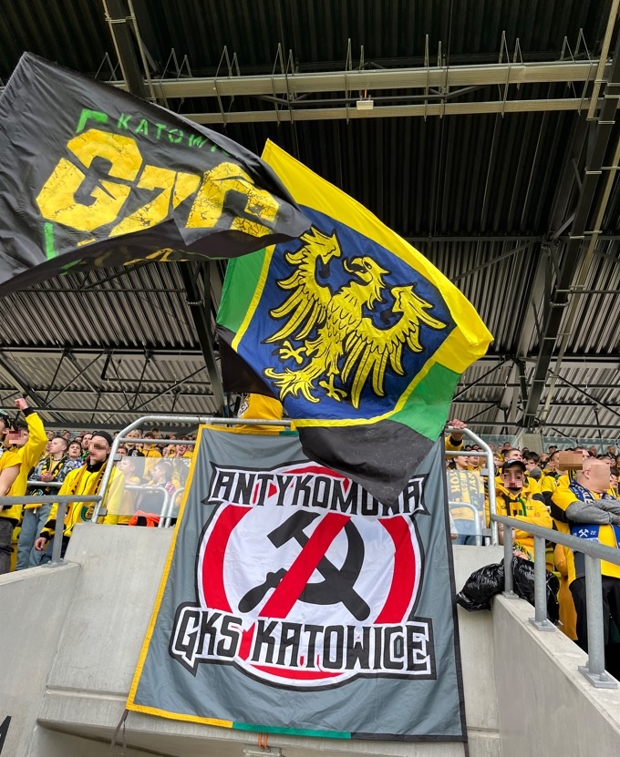 Oflagowanie: DUMA ŚLĄSKA, BANDITEN, UZNANI GENTLEMANI, GKS KATOWICE, PERSONA NON GRATA, JKS-GOOD NIGHT LEFT SIDE, ANTY KOMUNA – GKS KATOWICE, ONE NINE SIX FOUR, TRÓJKOLOROWA EMIGRACJA, transparent WASYL PDW oraz machajki GzG (3 sztuki), Górny Śląsk i FURTOK #9.