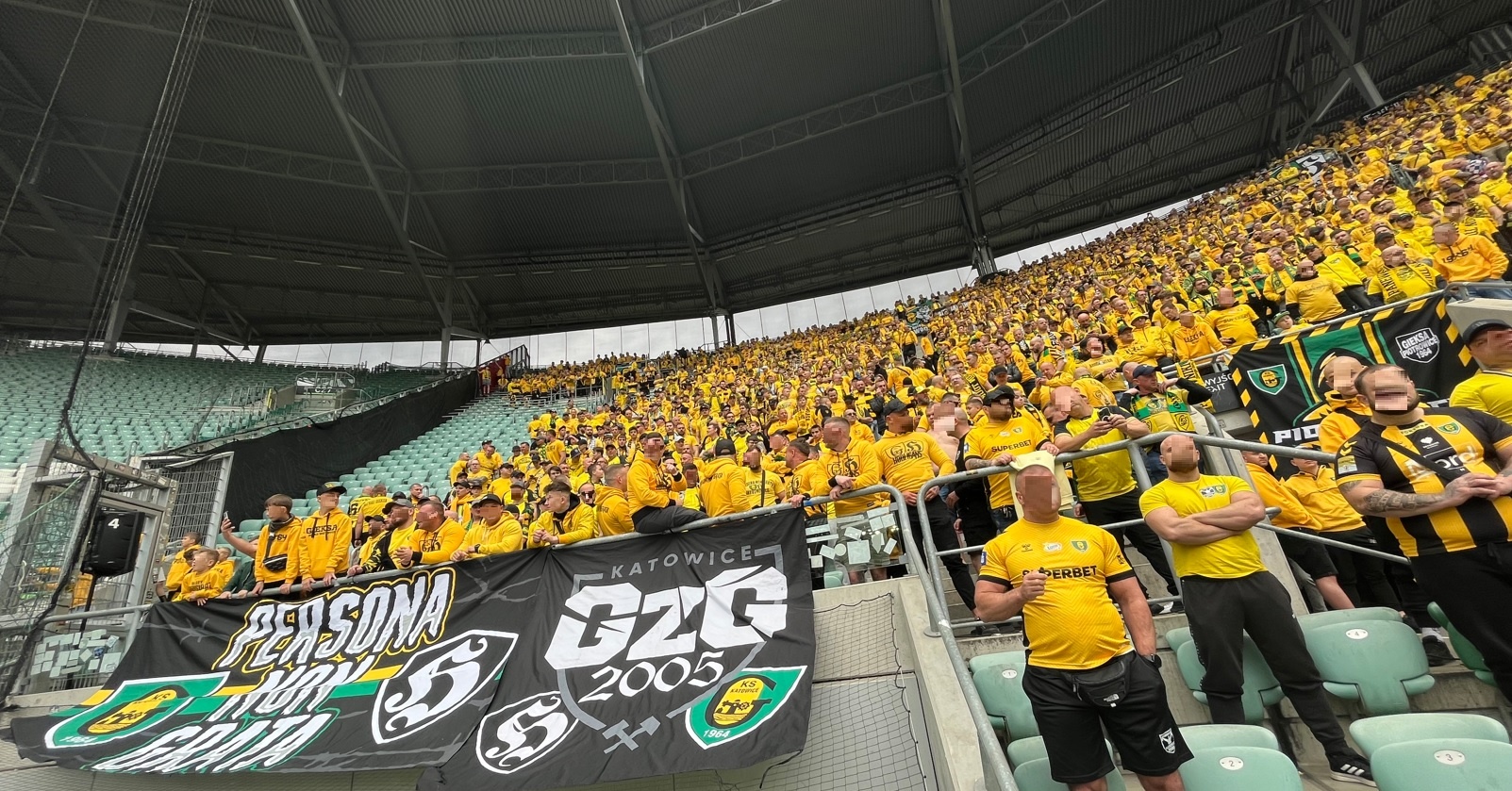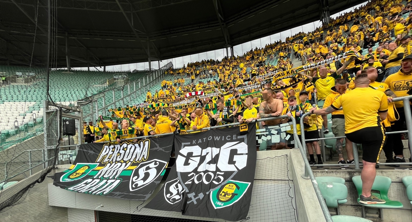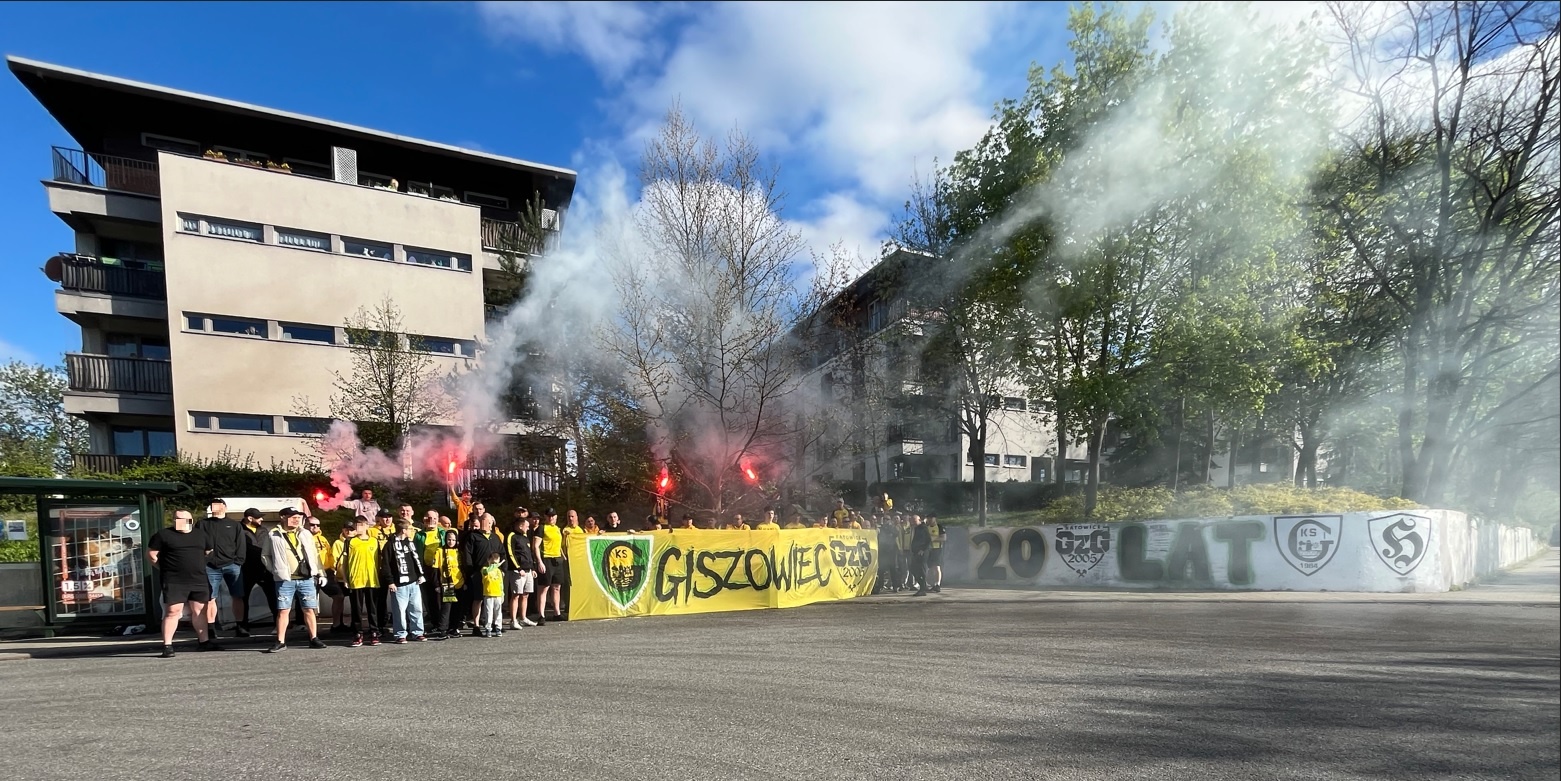 Oflagowanie: POLSKA GÓRNY ŚLĄSK – KATOWICE (narodowa, duża), GÓRNICZY KLUB SPORTOWY, SILESIAN FAMILY, PERSONA NON GRATA (mała), GzG’05, DUMA ŚLĄSKA, KSGKS, WŁADCY MYSŁOWIC (duża), LĘDZINY, JAWORZNO, PIOTROWICE, ŻORSKA GIEKSA (mała), TAUZEN, LIGOTA, BBZ-ZAWODZIE, SIEMIANOWICE ŚLĄSKIE, BBG-BOGUCICE, TRZEBINIA, WITOSA, transparent MAREK TOMEK RADZIU PDW, oraz chorągiew FURTOK #9.