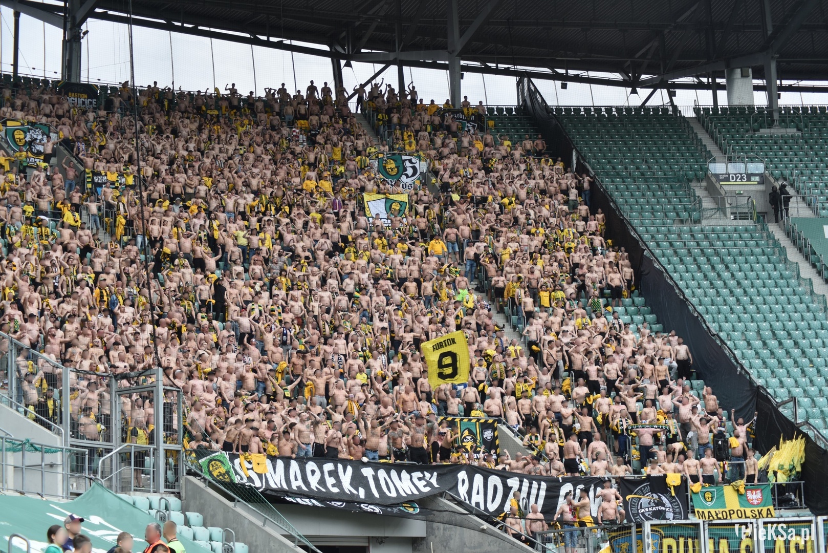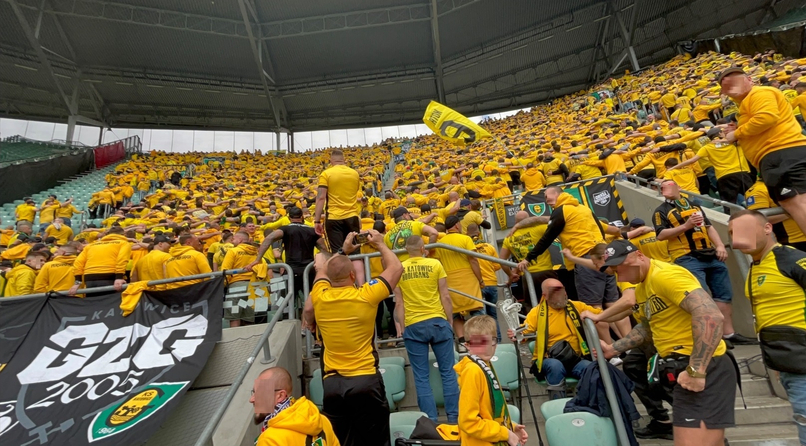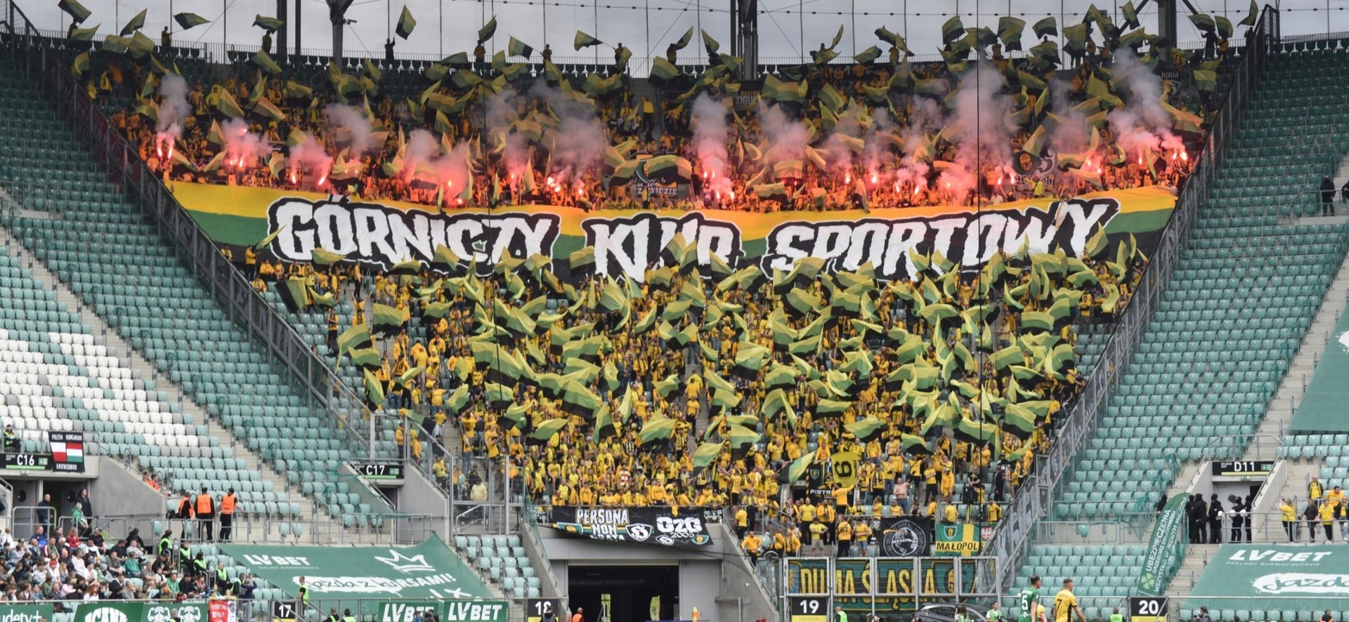 Oflagowanie: POLSKA GÓRNY ŚLĄSK – KATOWICE (narodowa, duża), GÓRNICZY KLUB SPORTOWY, SILESIAN FAMILY, PERSONA NON GRATA (mała), GzG’05, DUMA ŚLĄSKA, KSGKS, WŁADCY MYSŁOWIC (duża), LĘDZINY, JAWORZNO, PIOTROWICE, ŻORSKA GIEKSA (mała), TAUZEN, LIGOTA, BBZ-ZAWODZIE, SIEMIANOWICE ŚLĄSKIE, BBG-BOGUCICE, TRZEBINIA, WITOSA, transparent MAREK TOMEK RADZIU PDW, oraz chorągiew FURTOK #9.
