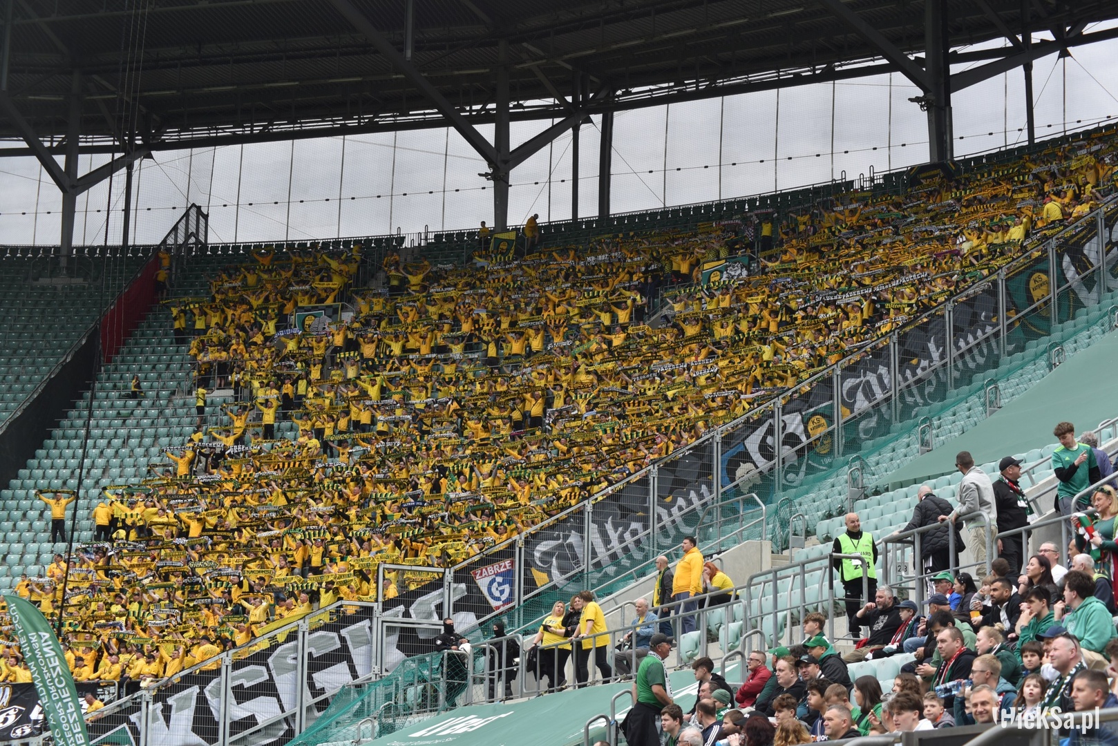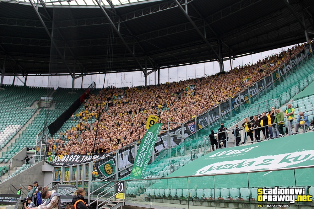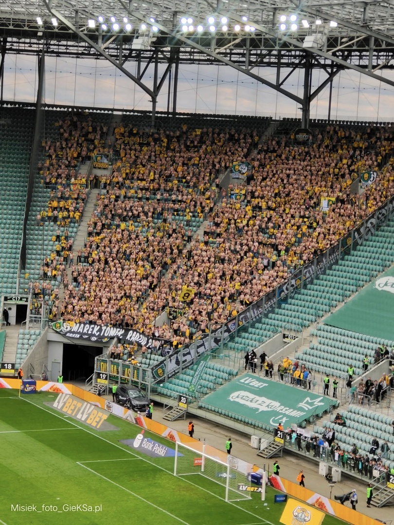 Do Wrocławia wjechaliśmy na około godzinę przed meczem, dzięki czemu na trasie wymieszaliśmy się z autami Wojskowych, co część z nas wykorzystuje w wiadomy sposób, zbierając kilka pamiątek po Malinowych Nosach. Im bliżej stadionu, tym więcej psiarni, co studzi wszelkie zapędy i nic się już nie dzieje, mimo iż musieliśmy wjechać pod „kabanosową arenę” tym samym zjazdem co miejscowi. Ogólnie długo się zjeżdżaliśmy, lecz dzięki sprawnemu wejściu, wszyscy meldujemy się przed rozpoczęciem meczu na największym sektorze gości w kraju. Nasza liczba to 1847 osób, w tym Górnik (22) i JKS (1) – dzięki za wsparcie! Dajemy głośno znać o sobie już na otwarciu meczu, gdzie piłkarze obu klubów wyszli na murawę w okazjonalnych koszulkach ze wsparciem dla kapitana WKS-u „Szwaniu wracaj do zdrowia”. Transparent dedykowany jemu rozciągnęli w trakcie meczu także wrocławianie w swoim młynie, który liczył tego dnia 6000 gardeł, skupionych pomiędzy dwoma ogromnymi zielono-biało-czerwonymi sektorówkami po bokach. Ogólnie to, co dzieje się ostatnio w szeregach kibiców Śląska, to patrząc na grę ich piłkarzy w tym sezonie, jest niesamowite. Jednak trzeba pamiętać, że mimo iż dziś walczą o utrzymanie, to nadal to aktualny wicemistrz kraju. Swoje flagi wywiesili w trzech rzędach, gdzie na tym przednim wisiały płótna w barwach ich przyjaciół. Nie bez powodu tego dnia największa wywieszona zgodowa flaga to ta chwaląca ich przyjaźń z Opawą, którą kilkakrotnie „pozdrawialiśmy”. Doping Śląska nie był u nas słyszalny, lecz w drugą stronę oni słyszeli nas doskonale, o czym świadczy masa ich wypowiedzi w sieci na nasz temat, gdzie okrzyknęli nas najlepszą ekipą, która odwiedziła ich sektor. Lepszą nawet niż te ekipy, które pojawiały się dużo liczniej! Od początku głośno wspieraliśmy reprezentację górnośląskiej stolicy, prezentując wielokrotnie ścianę naszych szali, których widok z dołu sektora zapierał dech w piersi. Ogólnie stroma, wysoka trybuna z jedną kondygnacją, robi wrażenie sama w sobie, a co dopiero gdy zasiądzie na niej horda fanatyków, nieszczędzących głosu dla swej drużyny. Wiadomo, wynik nam pomagał, ale mimo „masówki” wokal był na najwyższym poziomie.