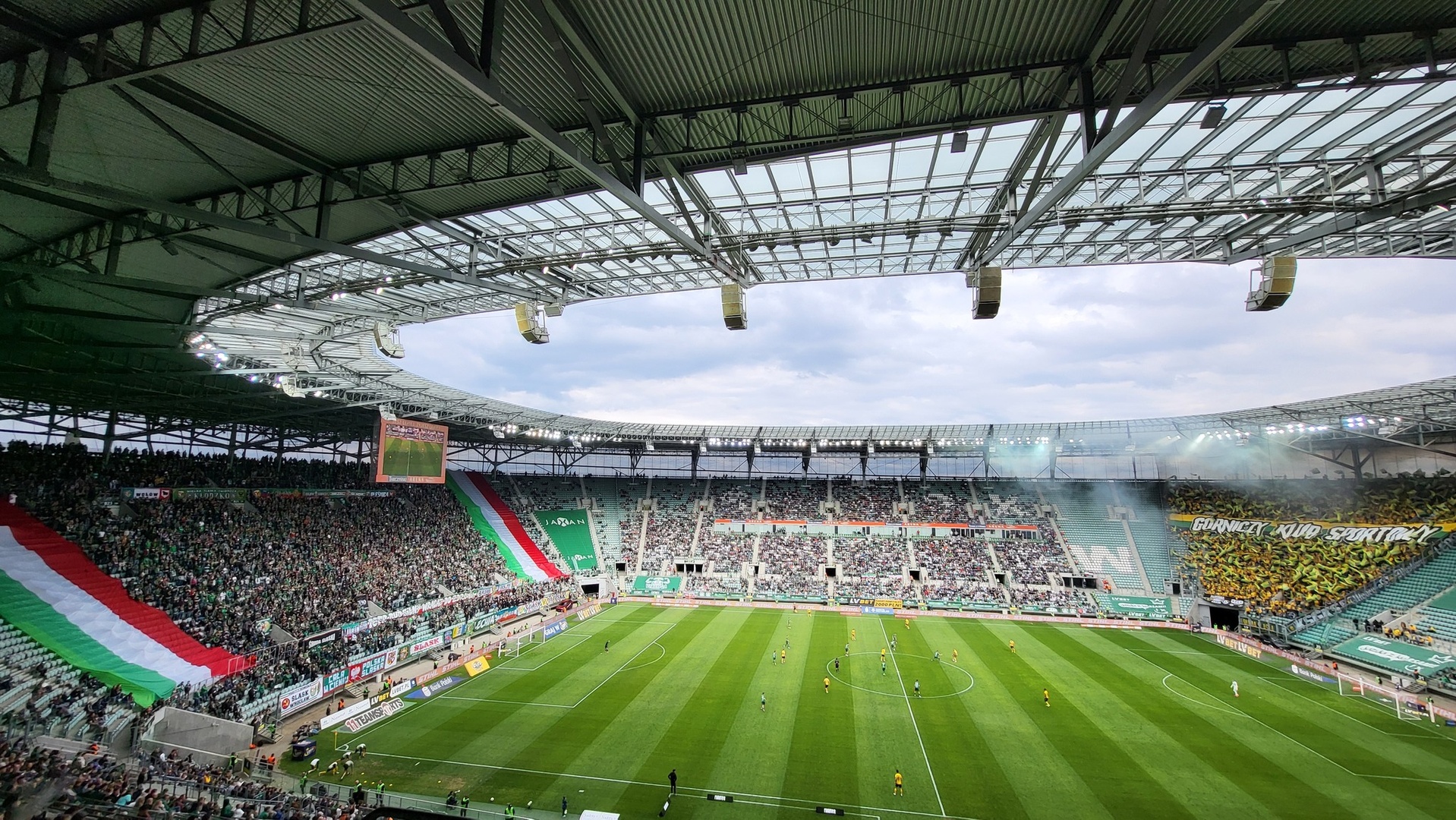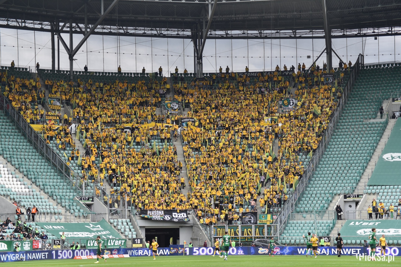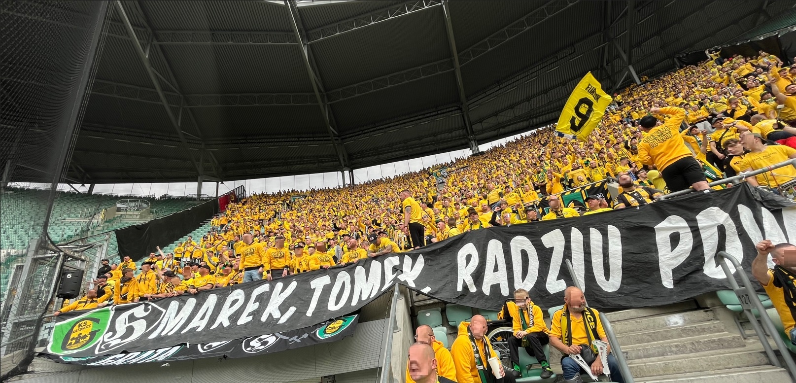 Do Wrocławia wjechaliśmy na około godzinę przed meczem, dzięki czemu na trasie wymieszaliśmy się z autami Wojskowych, co część z nas wykorzystuje w wiadomy sposób, zbierając kilka pamiątek po Malinowych Nosach. Im bliżej stadionu, tym więcej psiarni, co studzi wszelkie zapędy i nic się już nie dzieje, mimo iż musieliśmy wjechać pod „kabanosową arenę” tym samym zjazdem co miejscowi. Ogólnie długo się zjeżdżaliśmy, lecz dzięki sprawnemu wejściu, wszyscy meldujemy się przed rozpoczęciem meczu na największym sektorze gości w kraju. Nasza liczba to 1847 osób, w tym Górnik (22) i JKS (1) – dzięki za wsparcie! Dajemy głośno znać o sobie już na otwarciu meczu, gdzie piłkarze obu klubów wyszli na murawę w okazjonalnych koszulkach ze wsparciem dla kapitana WKS-u „Szwaniu wracaj do zdrowia”. Transparent dedykowany jemu rozciągnęli w trakcie meczu także wrocławianie w swoim młynie, który liczył tego dnia 6000 gardeł, skupionych pomiędzy dwoma ogromnymi zielono-biało-czerwonymi sektorówkami po bokach. Ogólnie to, co dzieje się ostatnio w szeregach kibiców Śląska, to patrząc na grę ich piłkarzy w tym sezonie, jest niesamowite. Jednak trzeba pamiętać, że mimo iż dziś walczą o utrzymanie, to nadal to aktualny wicemistrz kraju. Swoje flagi wywiesili w trzech rzędach, gdzie na tym przednim wisiały płótna w barwach ich przyjaciół. Nie bez powodu tego dnia największa wywieszona zgodowa flaga to ta chwaląca ich przyjaźń z Opawą, którą kilkakrotnie „pozdrawialiśmy”. Doping Śląska nie był u nas słyszalny, lecz w drugą stronę oni słyszeli nas doskonale, o czym świadczy masa ich wypowiedzi w sieci na nasz temat, gdzie okrzyknęli nas najlepszą ekipą, która odwiedziła ich sektor. Lepszą nawet niż te ekipy, które pojawiały się dużo liczniej! Od początku głośno wspieraliśmy reprezentację górnośląskiej stolicy, prezentując wielokrotnie ścianę naszych szali, których widok z dołu sektora zapierał dech w piersi. Ogólnie stroma, wysoka trybuna z jedną kondygnacją, robi wrażenie sama w sobie, a co dopiero gdy zasiądzie na niej horda fanatyków, nieszczędzących głosu dla swej drużyny. Wiadomo, wynik nam pomagał, ale mimo „masówki” wokal był na najwyższym poziomie.
