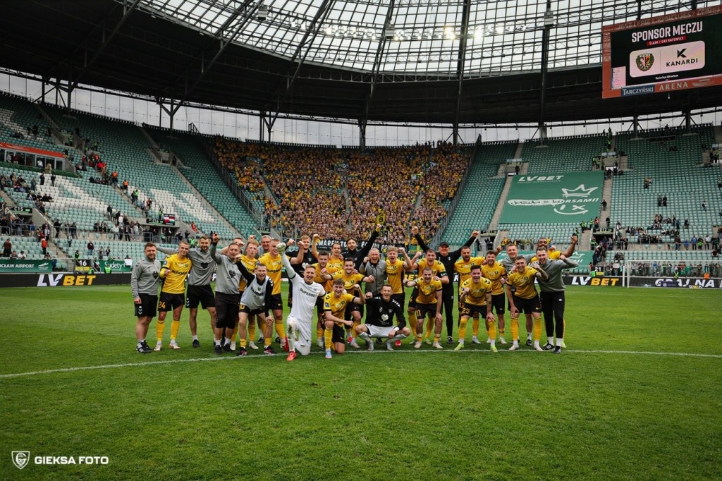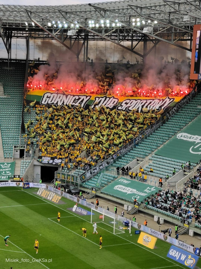 W sobotę wielkanocną zaplanowano cztery ekstraklasowe spotkania w tym mecz Śląska Wrocław z GKS-em Katowice. Katowiczanie w tym sezonie mają pewne utrzymanie natomiast gospodarze walczą o pozostanie w najwyższej klasie rozgrywkowej. Mimo że podczas przerwy zimowej wszyscy skazywali Śląsk na spadek, ponieważ miał na swoim koncie zaledwie 10 punktów i tyle samo do bezpiecznej pozycji to w 20025 roku uzbierali ich już 15 i utrzymanie jest coraz bardziej realne. Pierwszą połowę zaczęli zawodnicy GieKSy, ale szybko oddali piłkę gospodarzą. Do pierwszego przewinienia doszło już w drugiej minucie, gdy Baluta sfaulował Bergiera, niestety Bartosz Nowak bardzo słabo wykonał rzut wolny. W pierwszych minutach GieKSa grała to, do czego nas przyzwyczaiła, czyli wysoki pressing i dużo rabanu pod polem karnym gospodarzy. W kolejnych minutach obraz gry się trochę wyrównał. W 16. minucie Wasielewski mocno dośrodkował w pole karne, jednak piłkę przeciął Petkov wybijając piłkę na rzut rożny, chociaż blisko było samobója. Można by rzec, że co się odwlecze to nie uciecze i trzy minuty później Petkov chcą wybić piłkę spod nogi Lukasa Klemenza wpakował ją do własnej bramki. W 23. minucie Sebastian Bergier pokusił się o strzał z ostrego kąta, ale Leszczyński nie dał się zaskoczyć. Chwilę później zrobiło się groźnie pod bramką Kudły, i Petkov mógł odkupić swoje winy, ale jego strzał zatrzymał się na koledze z drużyny i z szybką kontrą ruszyli goście. Sebastian Bergier ruszył lewą stroną boiska, a w polu karnym był już Kowalczyk, Nowak i Wasielewski, niestety zagrał piłkę dosłownie do nikogo. W dalszej części mecz Śląsk Wrocław starał się odrobić straty i wychodził większą ilością zawodników, co GieKSa próbowała wykorzysta na swoją korzyść szybko wychodząc z piłką ze swojej połowy. W 36. minucie zawodnicy z Katowic pograli sobie w dziadka na połowie rywala i w pewnym momencie Sebastian Bergier oddał strzał zza pola karnego czym zaskoczył bramkarza, ale Leszczyński zdołał piłkę wypiąstkować. Chwilę później Nowak, widząc, że bramkarz jest niepewny uderzył z 20. metrów w środek bramki. Strzał ten sprawił sporo problemów i Leszczyński wypluł piłkę przed siebie, jednak Sebastian Bergier nie był w stanie jej dobić. W 43. minucie Bartosz Nowak dośrodkował z rzutu rożnego wprost na głowę Oskara Repki, który strzałem na dalszy słupek pokonał bramkarza. W końcówce pierwszej połowy Śląsk mógł zdobyć bramkę kontaktową, gdy zrobiło się zamieszanie w polu karnym Kudły, ale strzał Ortiza z pięciu metrów poszedł obok słupka. Na drugą połowę oba zespoły wyszły w takich samych składach, ale gospodarze trochę bardziej zdeterminowani do odrabiania strat. Pierwsze minuty należały do Śląska i to oni częściej utrzymywali się przy piłce i kreowali sytuacje bramkowe, ale zawsze brakowało wykończenia. W 55. minucie Sebastian Bergier zobaczył żółtą kartkę za uderzenie zawodnika w twarz, w momencie jak on chciał zabrać mu piłkę, żeby szybko wznowić grę. Następnie ciężar gry przeniósł się w środkową strefę boiska. GieKSa w drugiej połowie postanowiła oddać piłkę gospodarzom i cofnąć się na swoja połowę, mając korzystny wynik. W 72. minucie Nowak dostrzegł wychodzącego na czysta pozycje Drachala, ale ten nie zdołał oddać strzału. Chwilę później Petkov zagrał do niepilnowanego Ortiza, ale znów zabrakło celności, ponieważ okazja była idealna na bramkę kontaktową. W kolejnych minutach gra zrobiła się bardzo rwana i wkradło się sporo niedokładności, a Dawid Kudła za opóźnienie zobaczył żółtą kartkę. Dziesięć minut przed końcem spotkania Udahl przewrócił się w polu karnym GieKSy i gdy fani Śląska myśleli, że będzie jedenastka to sędzia liniowy podniósł chorągiewkę i odgwizdał spalonego. W 85. minucie Mateusz Kowalczyk próbował się wedrzeć w ple karne gospodarzy, ale stracił piłkę w ostatnim momencie. W 87. minucie Żukowski dostał piłkę na głowę, ale jego strzał z bliskiej odległości zdołał wybronić Kudła. Chwilę później Jakub Jezierski był bliski zdobycia bramki honorowej, ale znów brakło celności. GieKSa zasłużenie wygrała ze Śląskiem Wrocław i spotkanie mogło się podobać.
