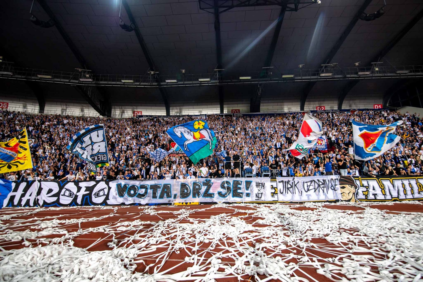 We wtorkowy wieczór drużyna Banika podejmowała w ramach MOL CUP Sigmę Ołomuniec. Na trybunach zjawiło się ponad 12 tysięcy widzów, którzy liczyli na utrzymanie formy i zwycięstwo faworyta jakim był Banik. Fanatycy biało-niebieskich urozmaicili spotkanie wyrzucając serpentyny i wymachując dużymi flagami na kiju. Przed młynem wywieszono tez płótno ze wsparciem dla fanatyka Banika, który uległ poważnemu wypadkowi przez wybuch pirotechniki, podczas ostatniego przemarszu na domowy mecz „VOJTA DRŽ SE!”. Kibice przeprowadzili też zbiórkę pieniędzy na pomoc koledze i inne akcje wspierające go, do których dołączyli się kibice z całego obozu związanego z Ostrawą.