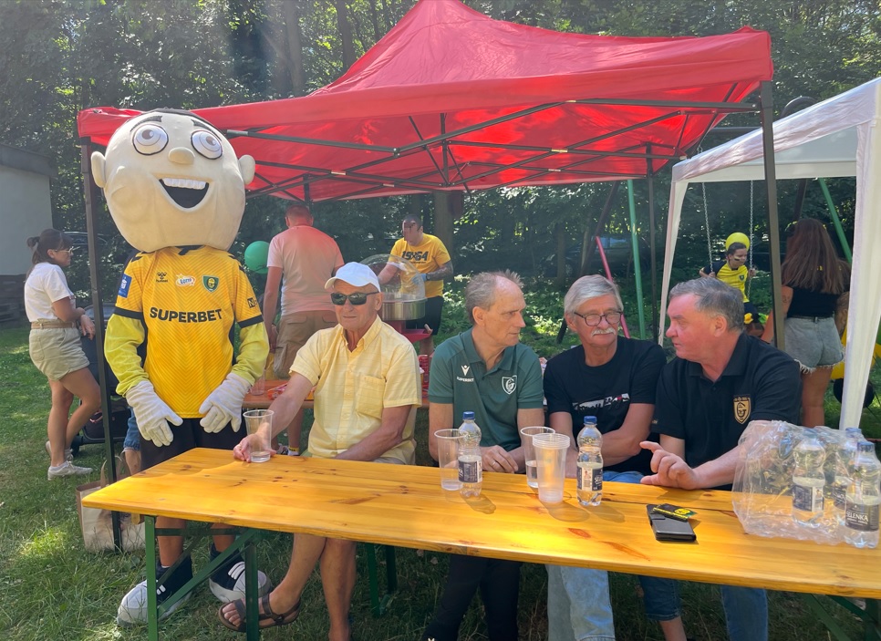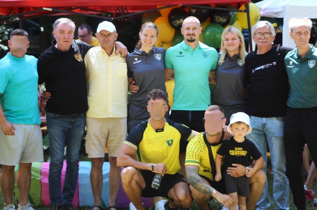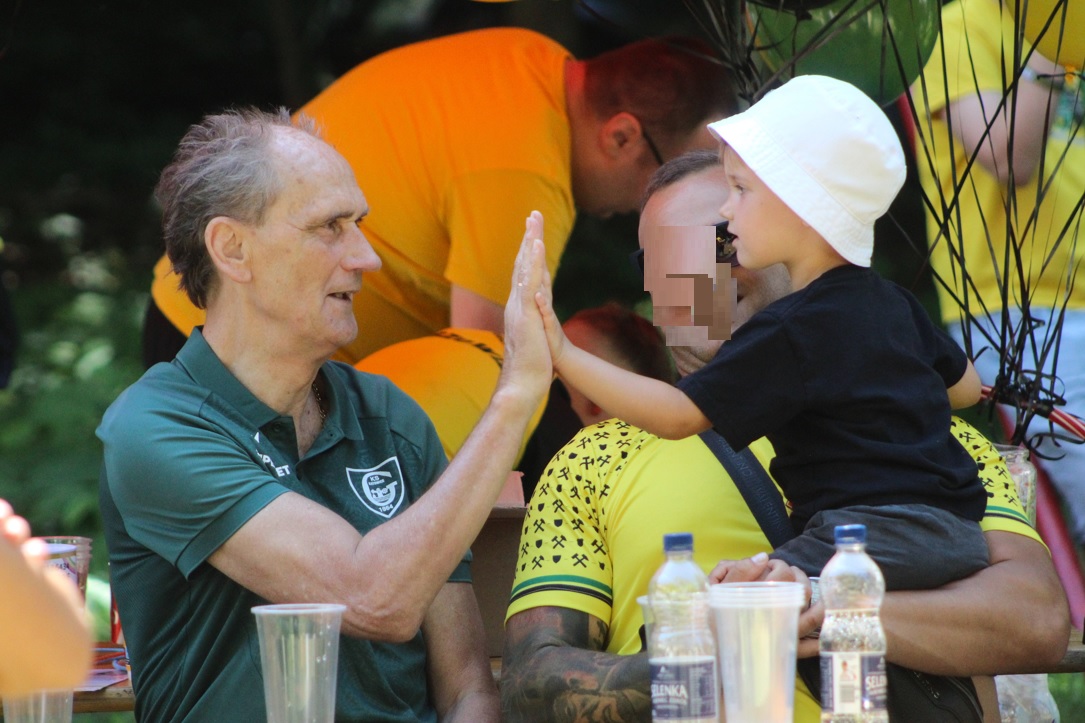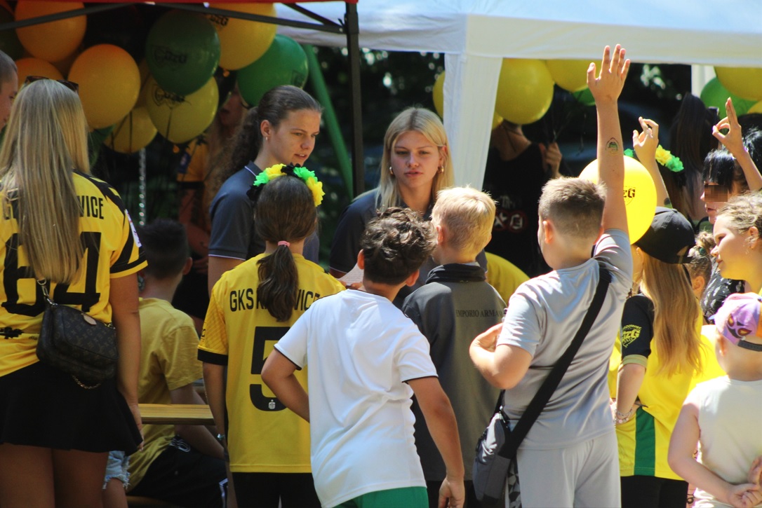 Jakby tego było mało to ok. 11:00 zaszczyciła nas delegacja GKS-u w osobie Adama Zrel’áka oraz mistrzyń Polski: Alicji Wojas i Julii Langosz. Razem z nimi pojawił się GieKSik i legendy GieKSy: Marek Koniarek, Franciszek Sput, Czesław Mika i Jerzy Wijas. Wszystkich głośno przywitaliśmy, robiąc sobie pamiątkowe zdjęcie, przy którym o odpowiednie oświetlenia zadbali sami zawodnicy. Takich zdjęć, autografów, rozmów i wspomnień nie było końca, tym bardziej że nasi goście pamiętali również o najmłodszych, przywożąc im upominki i robiąc konkurs wiedzy.