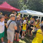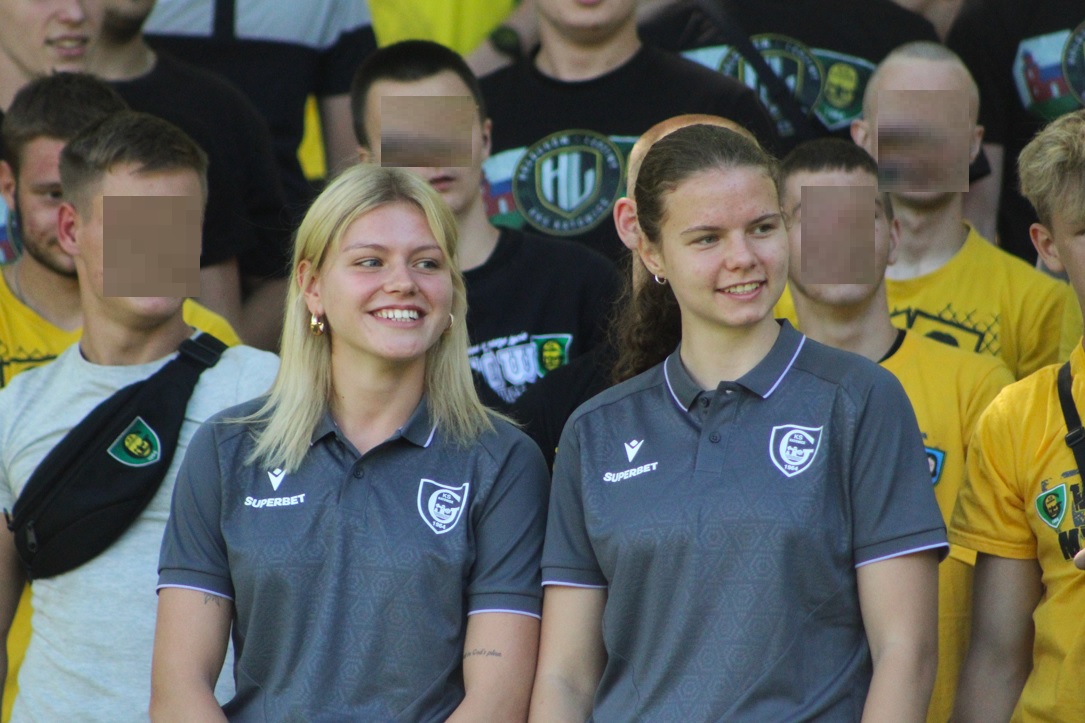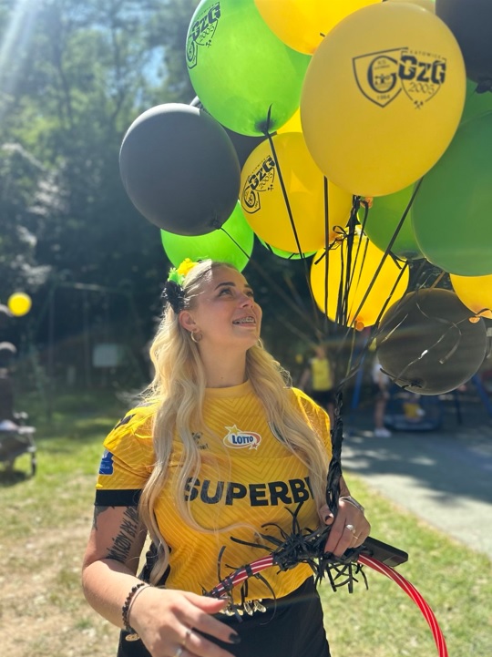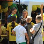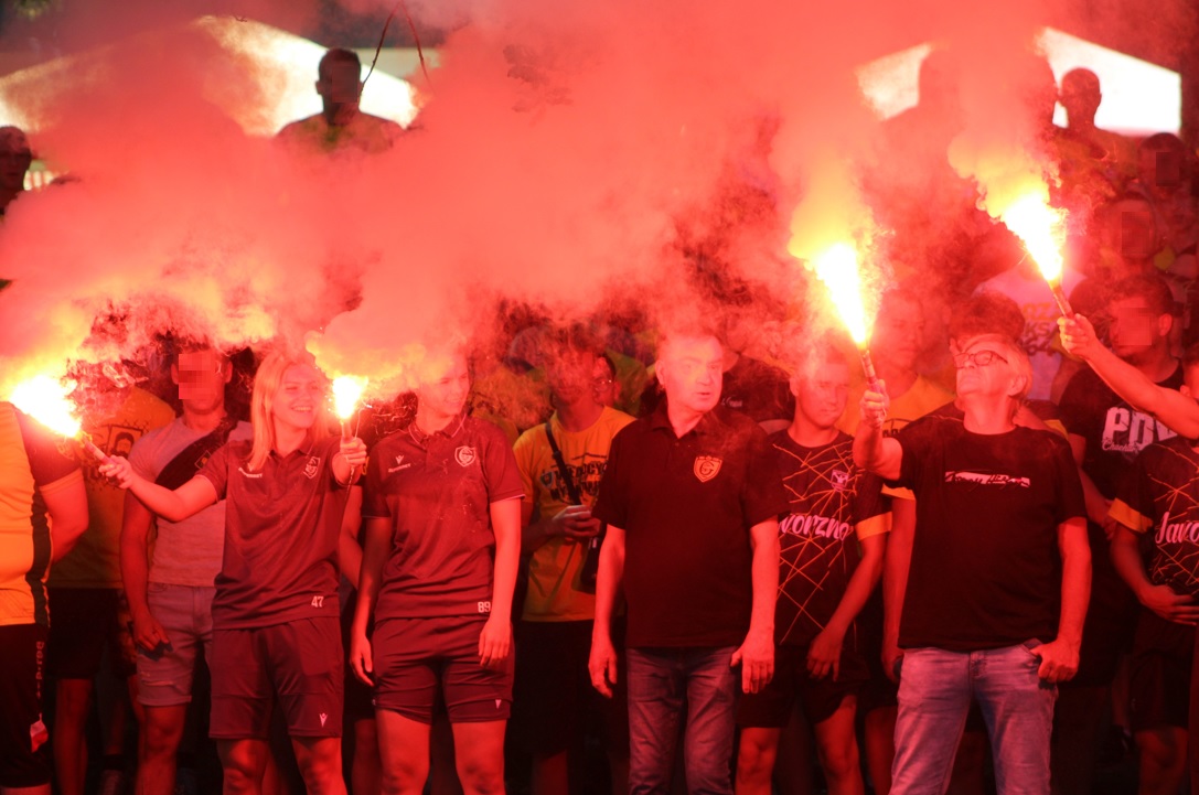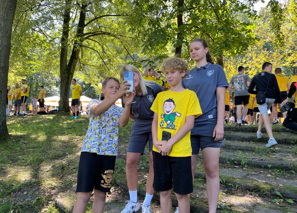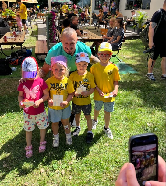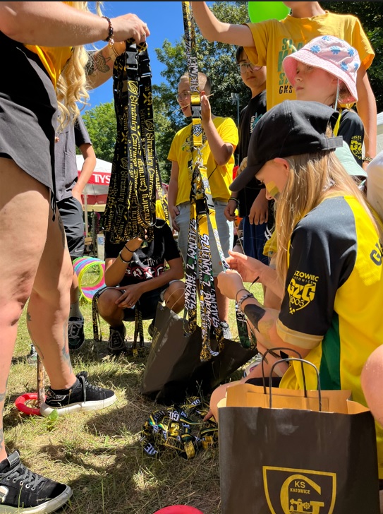 Jakby tego było mało to ok. 11:00 zaszczyciła nas delegacja GKS-u w osobie Adama Zrel’áka oraz mistrzyń Polski: Alicji Wojas i Julii Langosz. Razem z nimi pojawił się GieKSik i legendy GieKSy: Marek Koniarek, Franciszek Sput, Czesław Mika i Jerzy Wijas. Wszystkich głośno przywitaliśmy, robiąc sobie pamiątkowe zdjęcie, przy którym o odpowiednie oświetlenia zadbali sami zawodnicy. Takich zdjęć, autografów, rozmów i wspomnień nie było końca, tym bardziej że nasi goście pamiętali również o najmłodszych, przywożąc im upominki i robiąc konkurs wiedzy.