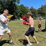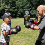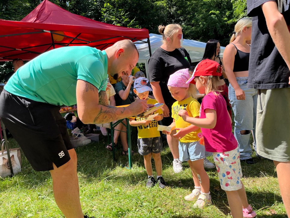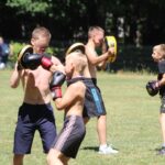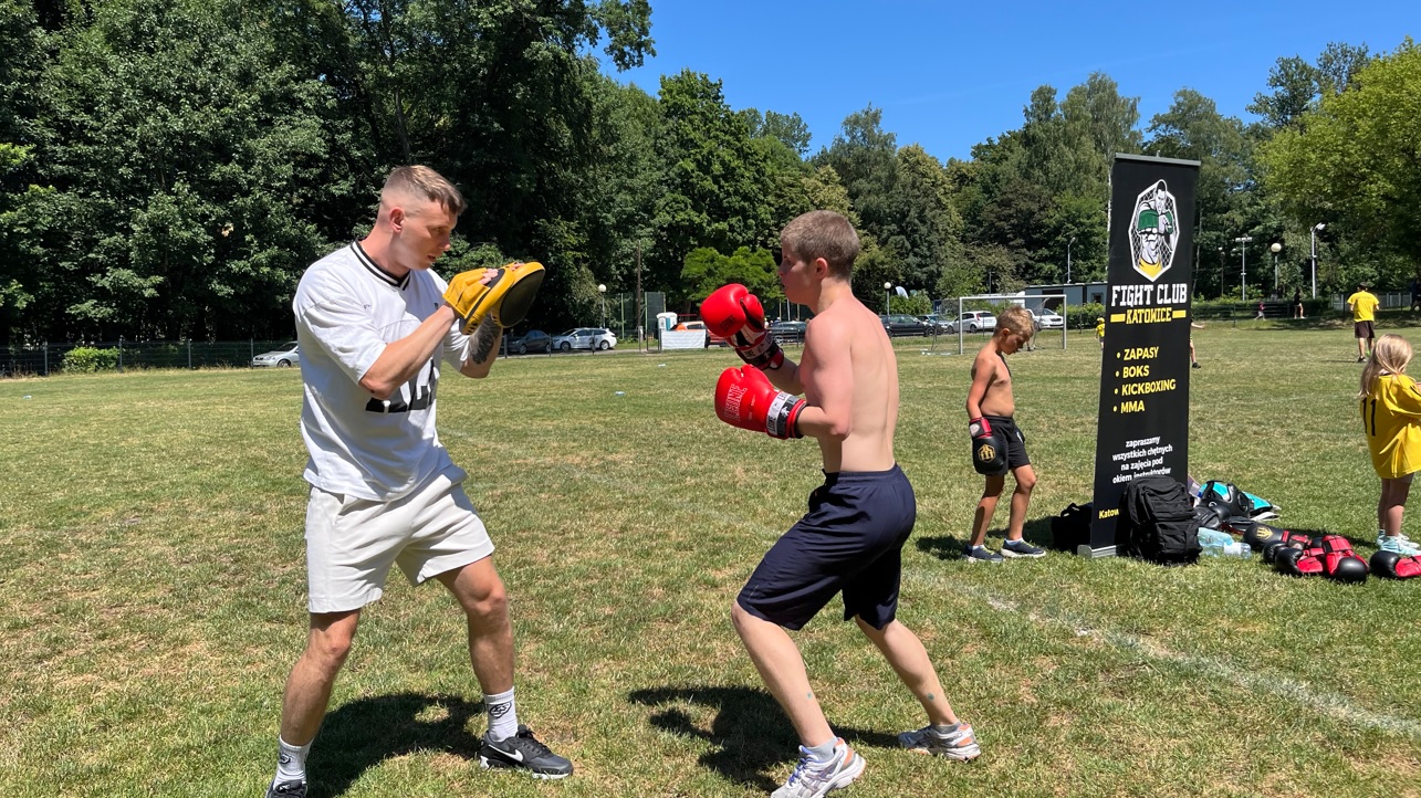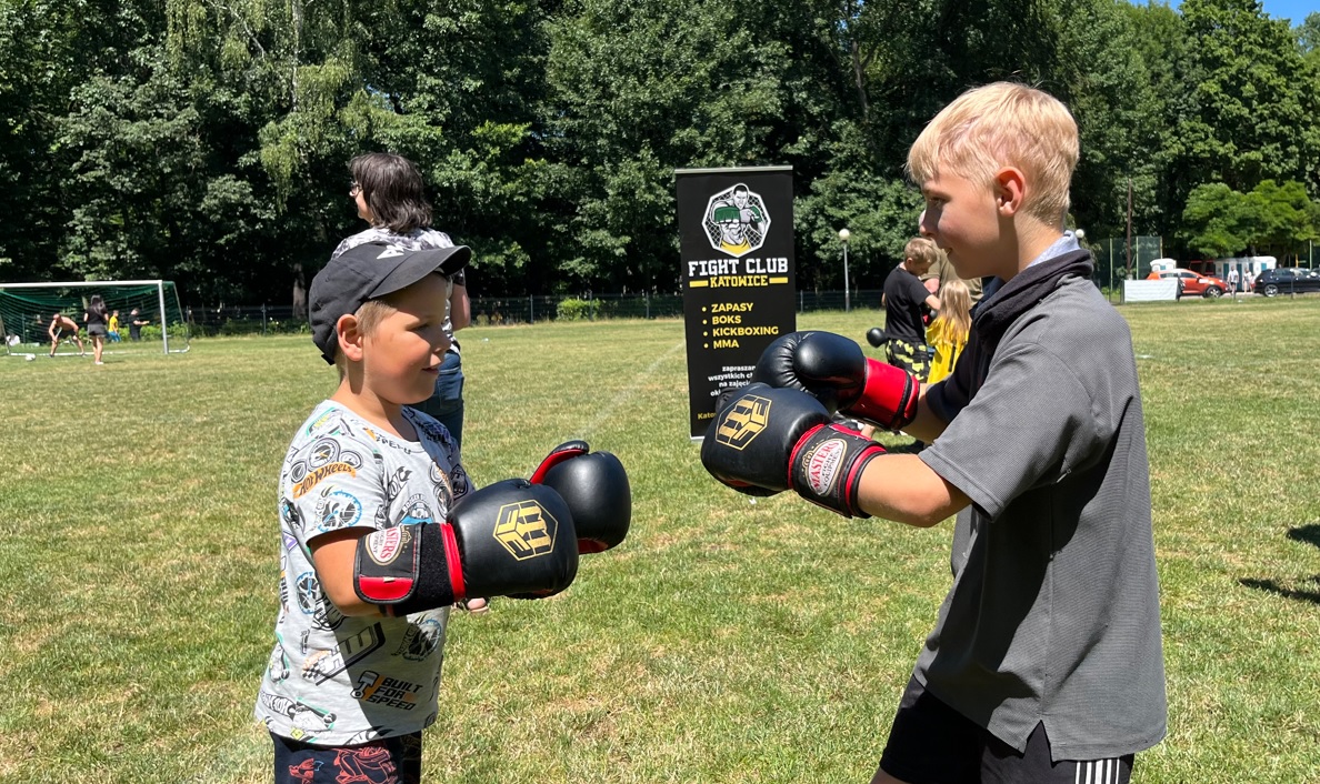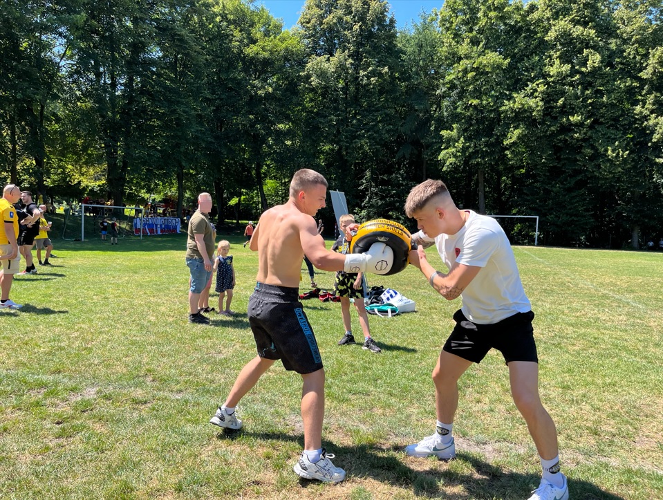 Po fazie grupowej turnieju piłkarskiego, na murawie odbył się pokaz sztuk walki w wykonaniu młodych adeptów Fight Club Katowice, którzy na tarczach pokazali nam próbkę swoich umiejętności. Dodatkowo każdy chętny również mógł ubrać rękawicę i spróbować swoich sił na tarczach, czego dzieciaki nie odpuściły i ochoczo wyprowadzały ciosy.
