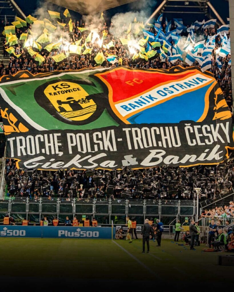Na początku spotkania Ultrasi Banika prezentują zgodową oprawę, rozciągając sektorówkę z herbami i treścią „Trochę polski – trochu česky, GieKSa & Baník”. Choreografie u dołu uzupełnili czarnymi foliami, a u góry wyciągnięto machajki w barwach naszych klubów, które podświetlono pirotechnikom. Następnie wszyscy ściągali koszulki, by niedługo potem przywdziać identyczne niebieskie trykoty. W tym momencie pojawiły się też flagi w sektorze gości.