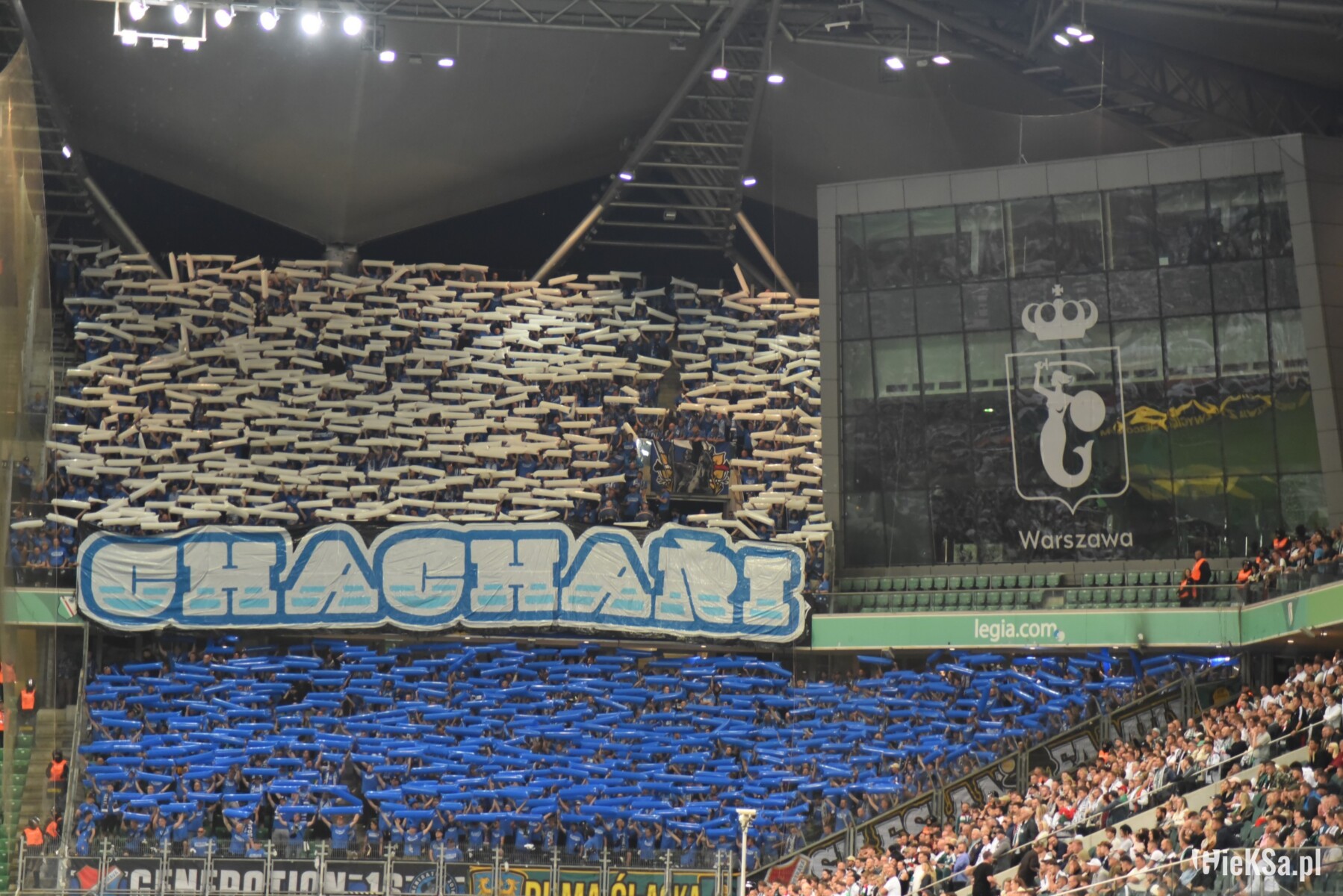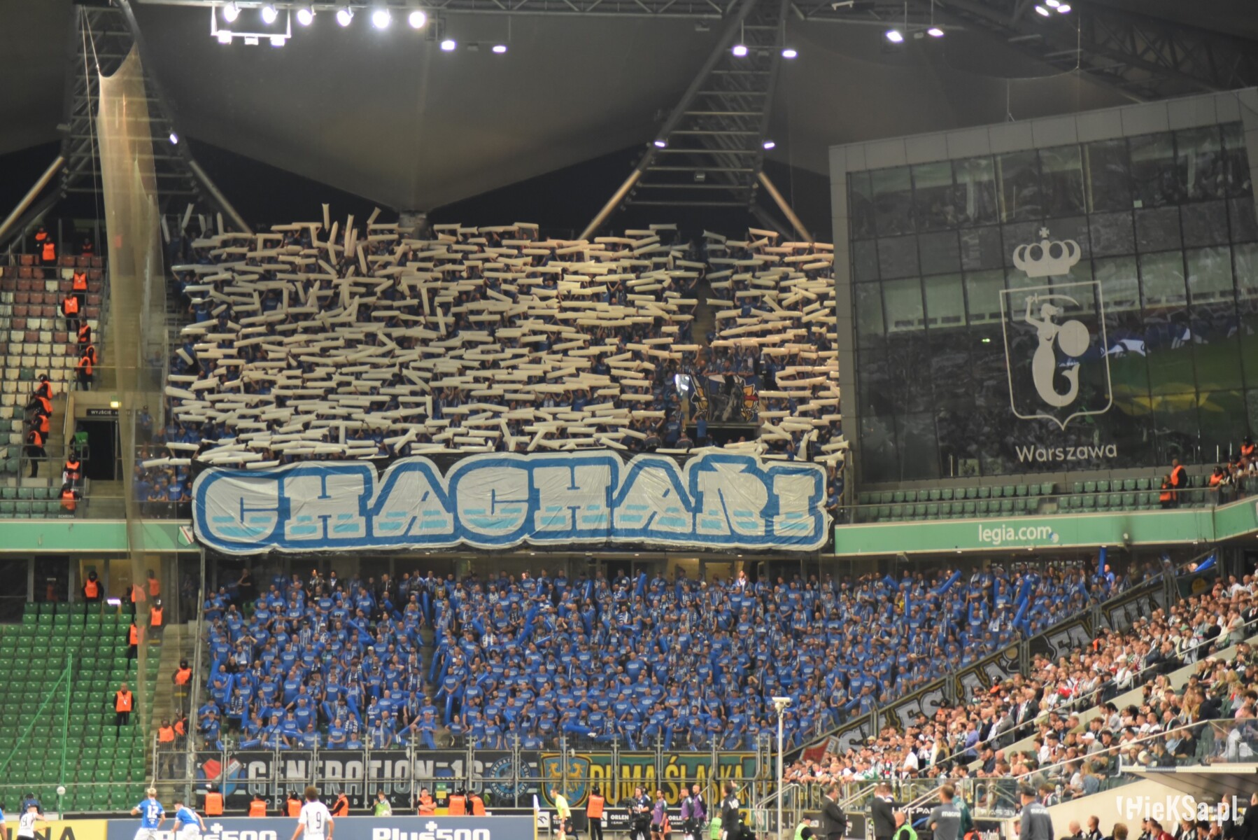 W drugiej części nasi bracia również nie próżnowali. Na balustradzie powieszono transparent „Chachaři”, a sektory wypełniły w górnej części białe, a w dolnej niebieskie, podłużne tuby wypełnione powietrzem. Kibice Banika bawili się nimi, prezentując je raz w pozycji pionowej, a raz w poziomej, co dało ciekawy efekt.