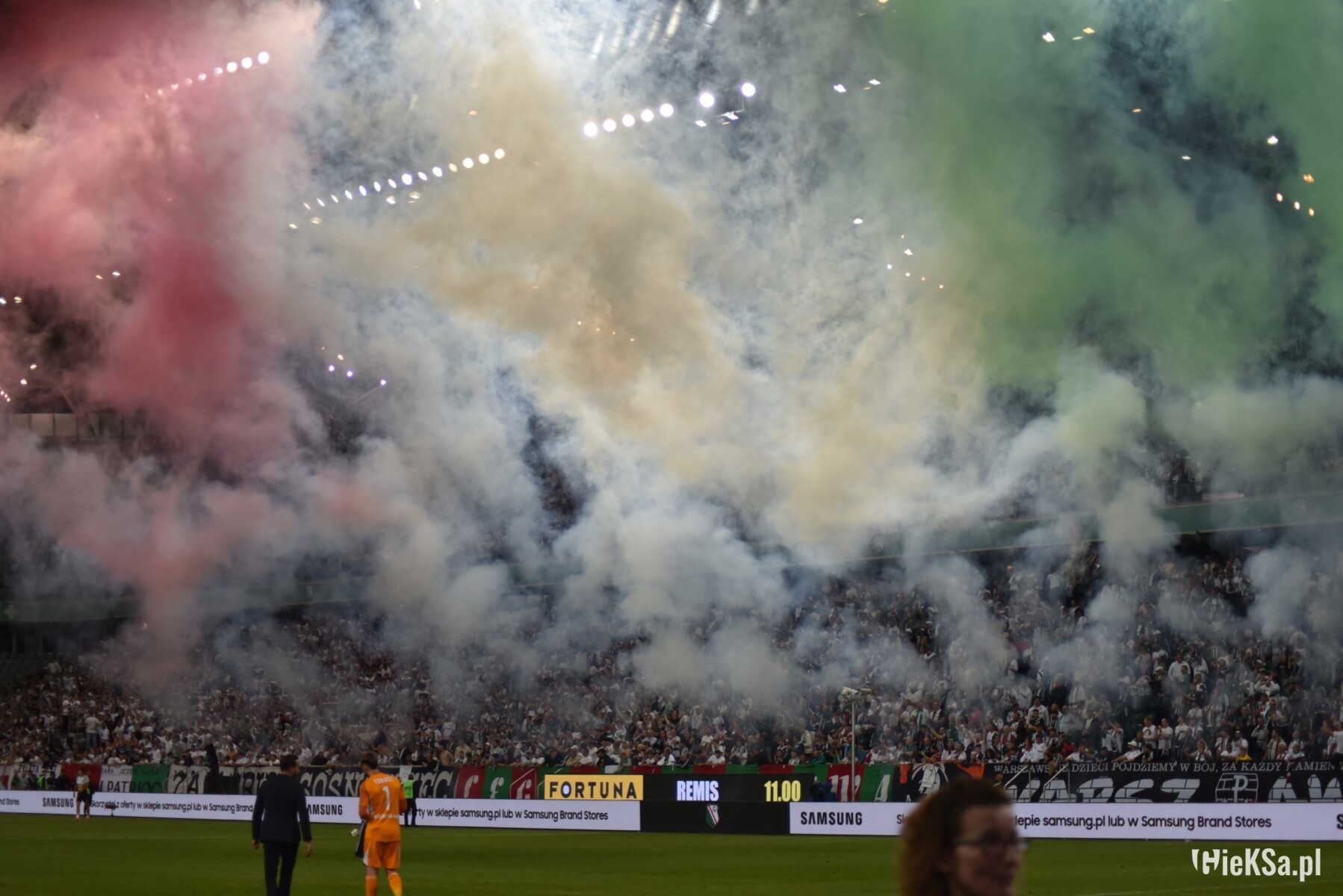 Nie zamierzaliśmy się jednak przesadnie skupiać na przyjezdnych, jako że należało wesprzeć „Wojskowych” w drodze do zwycięstwa. „Do boju, Legio, marsz!” – zachęcaliśmy naszych piłkarzy, by ci pokazali się z możliwie jak najlepszej strony. No i trzeba im oddać, że od początku potyczki wzięli się ostro do roboty, raz po raz atakując bramkę Baníka. Ich wysiłki szybko odniosły spodziewany skutek, bo rozkręcający się strzelecko z meczu na mecz Jean-Pierre Nsame pięknym trafieniem pokonał golkipera rywali. A przynajmniej tak się wydawało. Stadion wpadł w euforię, która jednak bardzo szybko została ostudzona przez serbskiego sędziego, który stwierdził, że nasz napastnik znalazł się na spalonym. Ta decyzja tylko nas rozjuszyła, co paradoksalnie bardzo pozytywnie wpłynęło na nasz doping. Jeszcze donośniej – z istną petardą – uskutecznialiśmy wspomniany wyżej hit, a następnie „Legioooo!” z kręceniem szalikami i przysiadaniem.