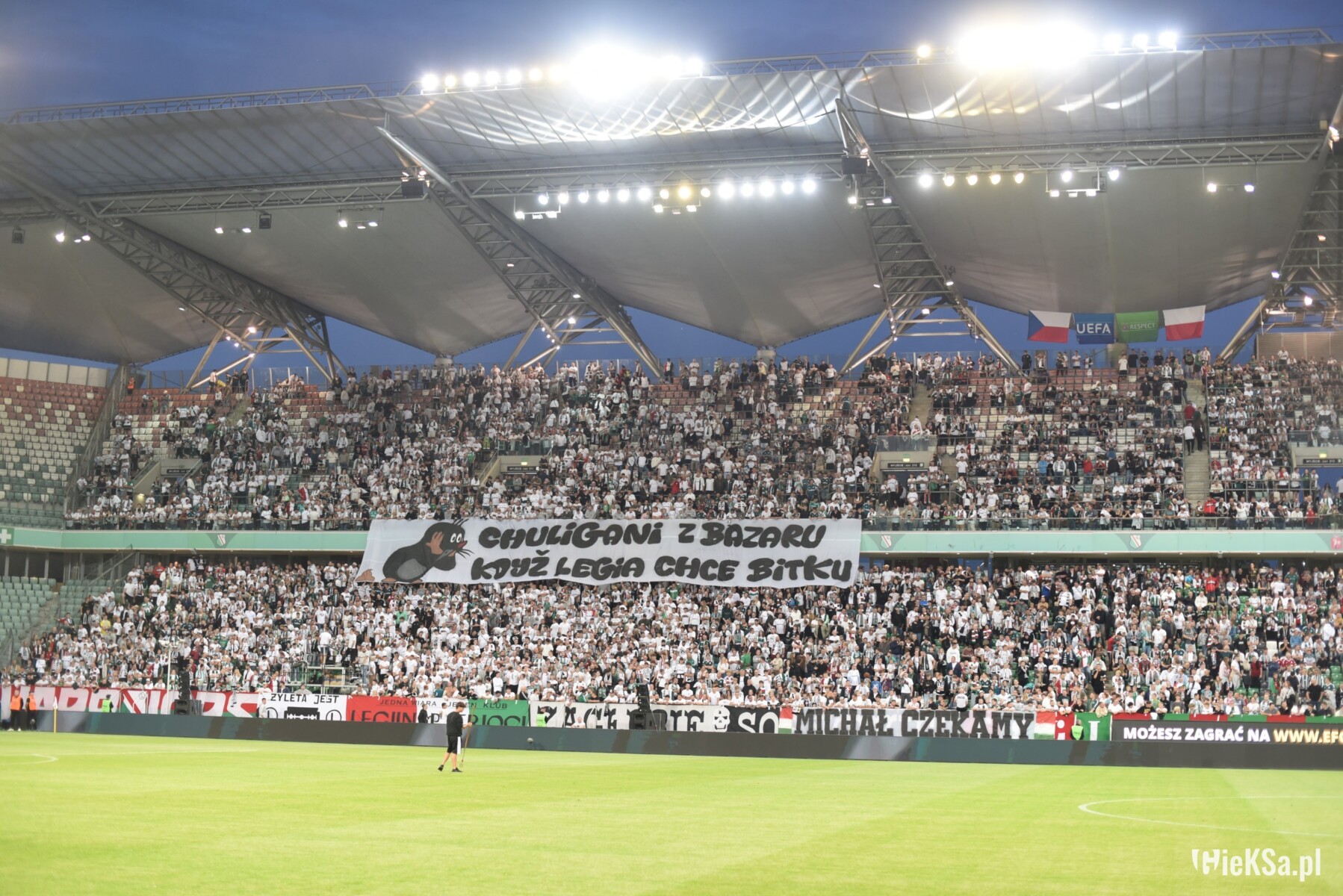 Chwilę później – z racji potyczki w europejskich pucharach – odśpiewaliśmy hymn narodowy. W jego trakcie stało się jednak coś, co zjeżyło nam włosy na głowie – sędzia przyznał Czechom rzut karny, który zweryfikował jeszcze za pomocą VAR. Nie mogło być inaczej – najpierw głośno okazywaliśmy wsparcie Kacprowi Tobiaszowi, a następnie porcją przenikliwych gwizdów próbowaliśmy rozproszyć piłkarza Baníka. Nasze ogłuszające buczenie musiało tak wystraszyć biednego grajka, że ten… nie trafił do bramki. „Taki ch**!” – darliśmy się w kierunku sektora gości.