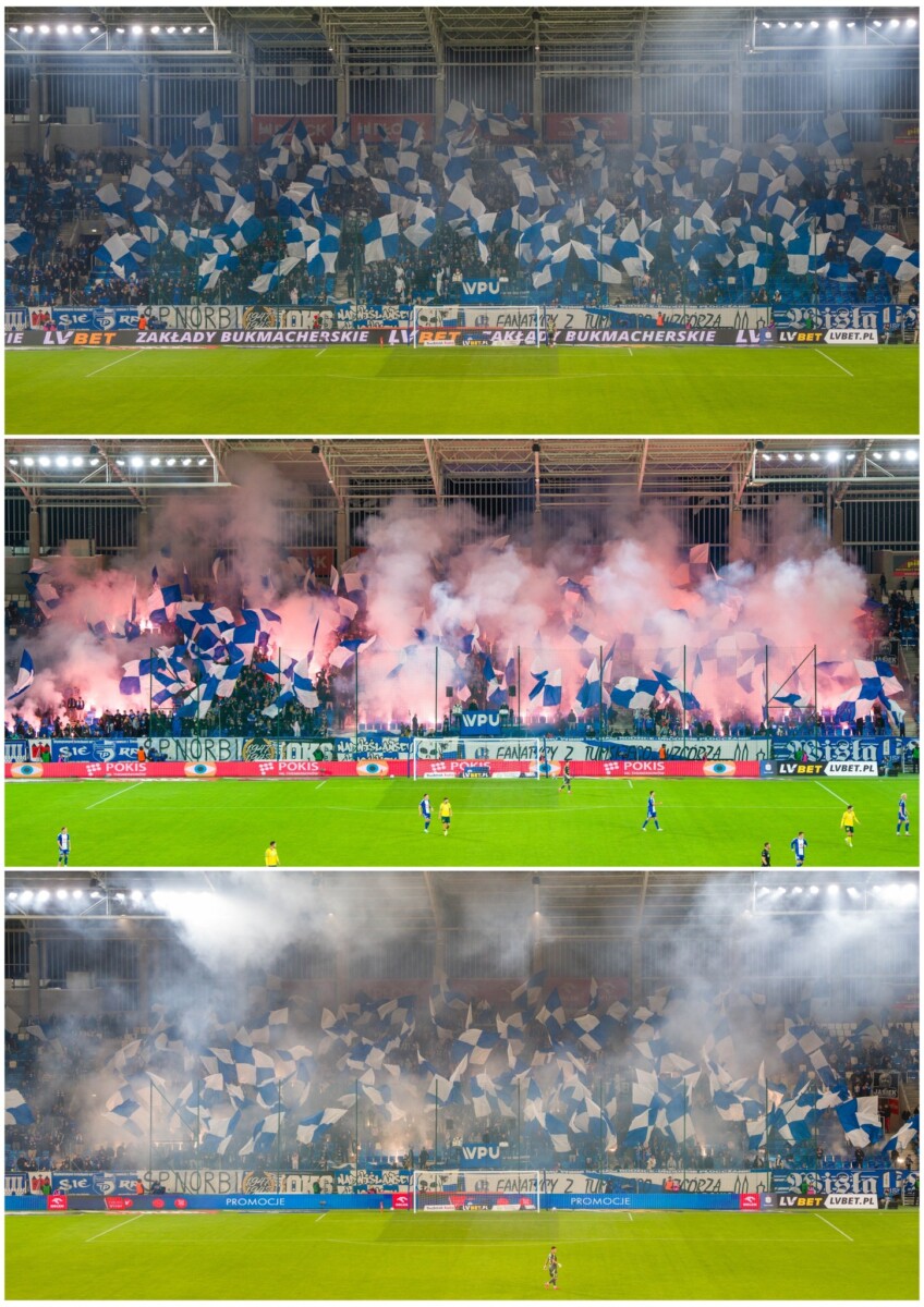 Nafciarze przed meczem uczcili minutą ciszy pamięć kolegi z trybun śp. Norberta Kikolskiego z FC Sierpca. Wywiesili też dla niego transparent „ŚP. NORBI”. W drugiej połowie zawisły jeszcze dwa inne transparenty, w tym jeden skierowany do nas „GIEKSA dzięki za pomoc”. Prezentacja fanatyków spod znaku „Petki”, jednak nie kończy się na tym i ich wokalu. Najpierw za bramką rozciągnęli klasyczną sektorówkę niebiesko-biało-niebieskich, by po chwili wypełnić sektory kwadratowymi machajkami (3x3m) ze wzorem niebiesko-białej szachownicy. Całość została uświęcona ogniami wrocławskimi i stroboskopami, co skradło show na kilka minut.