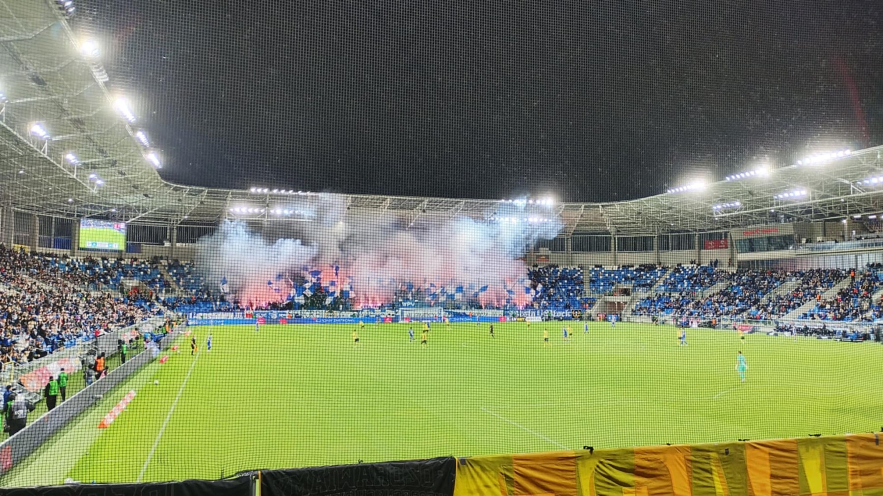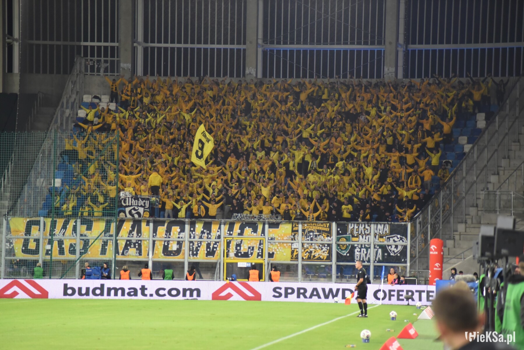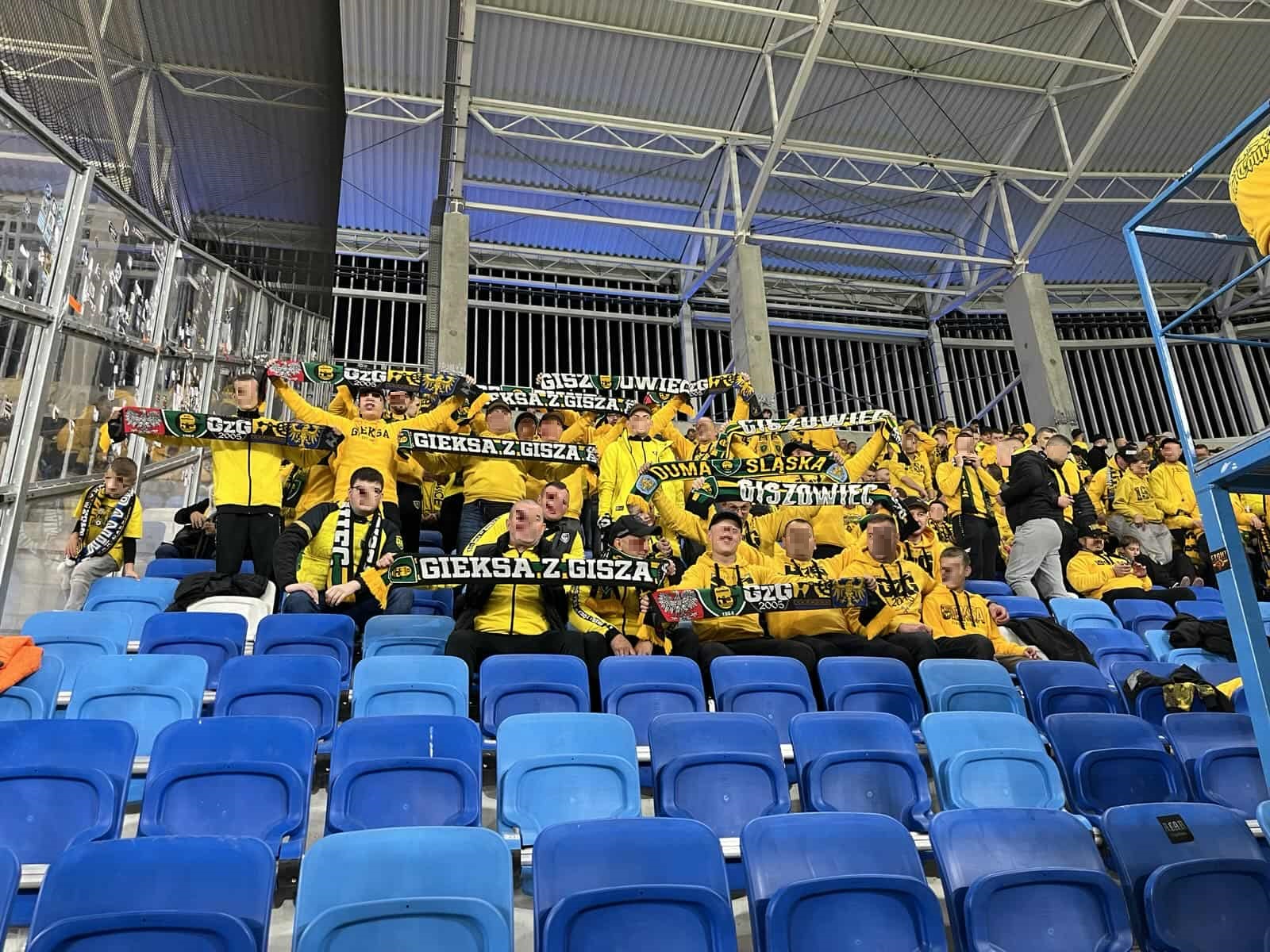 Kolejny piątek no i kolejny mecz GieKSy. Tym razem przyszło nam jechać do Płocka, gdzie odbywał się finał dwumeczu tego tygodnia, spowodowany Pucharem Polski sprzed kilku dni. Na tę eskapadę ruszyliśmy o 15:30 drogą asfaltową, tak by wielu z nas zdążyło po rannej zmianie. Dodatkowo musieliśmy ograniczyć postoje, dzięki czemu finalnie pod stadion im. Kazimierza Górskiego, docieramy praktycznie na pierwszy gwizdek. Choć ten usłyszało tak naprawdę tylko kilku z nas, którzy weszli pierwsi na sektor. Cała reszta dzięki ekspresowej kontroli, weszła dosłownie w kwadrans, co zaznaczyliśmy rozpoczęciem dopingu. W większości ubrani jesteśmy na żółto, kilkakrotnie prezentując ścianę szali. Nasza liczba to 582 osoby, w tym Banik (12) i Górnik (4) – dzięki! Nasz wokal tego dnia to nieskromnie akustyczny majstersztyk! Dzięki temu do naszych uszu nawet na moment nie doszedł dźwięk z licznie tego dnia zgromadzonego młyna fanatyków z Tumskiego wzgórza. Na pewno na duży plus gniazdo dla prowadzących doping w sektorze gości, którego nie było jeszcze podczas naszej ostatniej wizyty, a które sprawi też, że nadgorliwa płocka palanteria nie będzie szukać dziury w całym, chcąc ukarać osoby z megafonem — CHWDP.