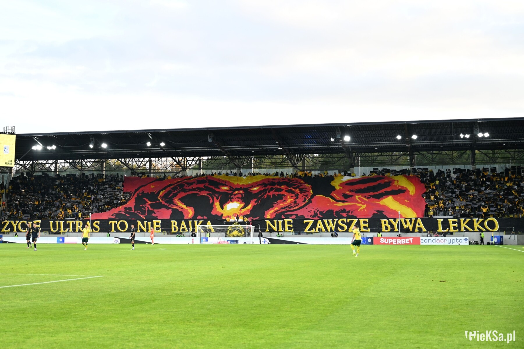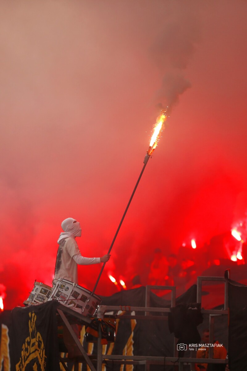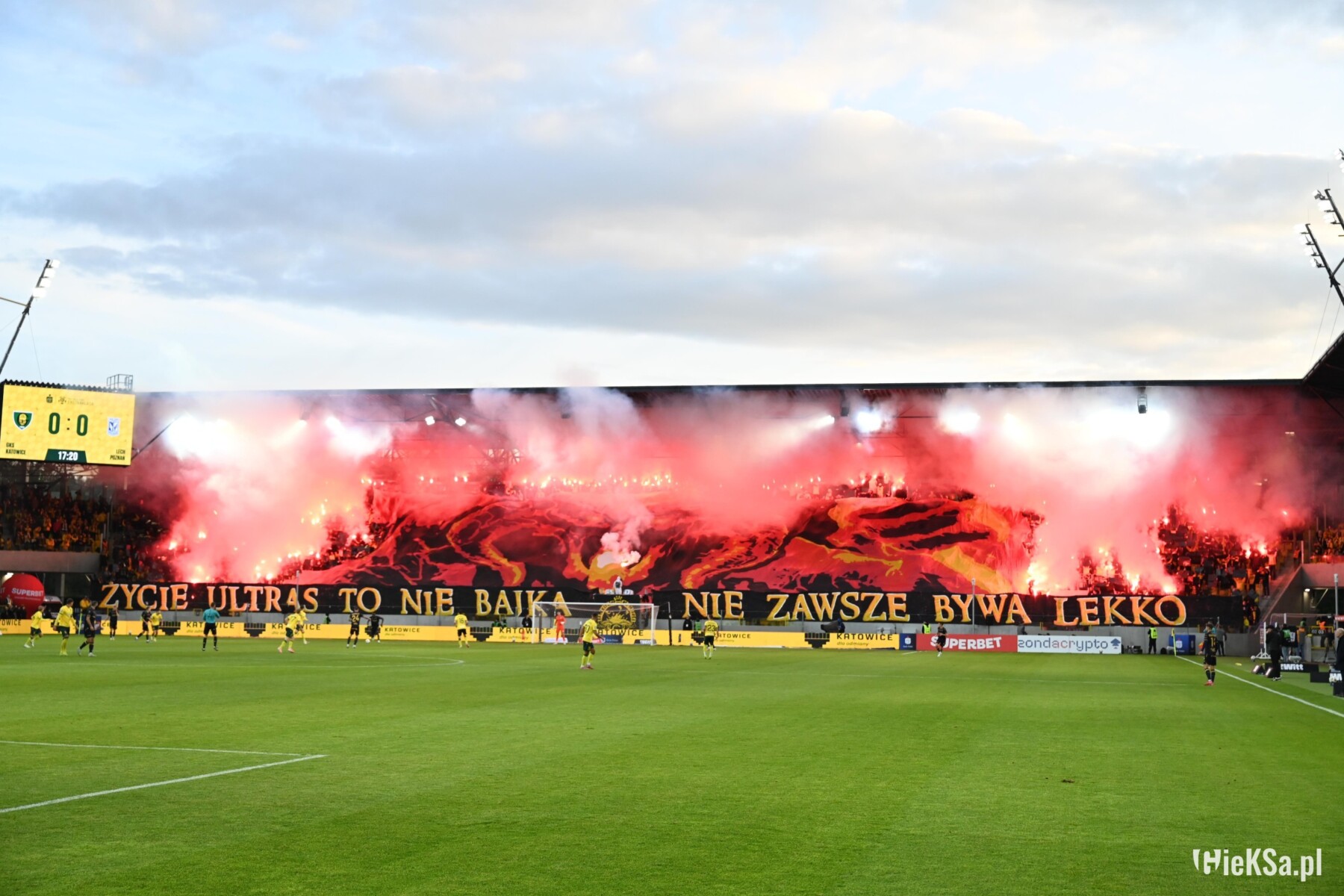 Chwilę później można było już usłyszeć doping, który rozpoczęto od „GKS młody Śląski klub…”. Było głośno, a widownia nie tylko na Blaszoku stała, nie szczędząc gardeł. Czuć było w tonie głosów ambicję i wiarę, że na boisku uda się zatrzymać poznańską lokomotywę. W międzyczasie za kuluarami Ultrasi przygotowywali się do spektaklu, który rozpoczął się około 15 minuty meczu. Trybuny przysłoniła postać Balroga, ognistego demona znanego z mitologii śródziemia J. R. R. Tolkiena, w towarzystwie czarnych kartoników, co zostało opisane hasłem zaprezentowanym w dwóch etapach „ŻYCIE ULTRAS TO NIE BAJKA, NIE ZAWSZE BYWA LEKKO – ŻEBY DOSTRZEC PIĘKNO MUSISZ PRZEJŚĆ PRZEZ PIEKŁO”. Całość zobrazowała walka stylizowana na pojedynku Gandalfa z Balrogiem z trylogii „Władcy Pierścieni”, gdzie na gnieździe znalazł się Ultras, poskramiający jasnym blaskiem na kiju, ogień demona, który zapłoną dzięki czerwonym racom. Gdy udało się go powstrzymać i ugasić, gęsty dym spowił boisko, gdzie przerwano grę. Po chwili zawodnicy szykowali się na ponowne wejście, Ultrasi jednak udowodnili, że duch ognia nie jest im straszny i na znak zwycięstwa ponownie odpalili pirotechnikę, co w sumie przerwano mecz na 13 minut. Podczas tej prezentacji użyto w dwóch turach m.in. 400 rac! Piękny popis UG’03 zapadnie nam na długo!
