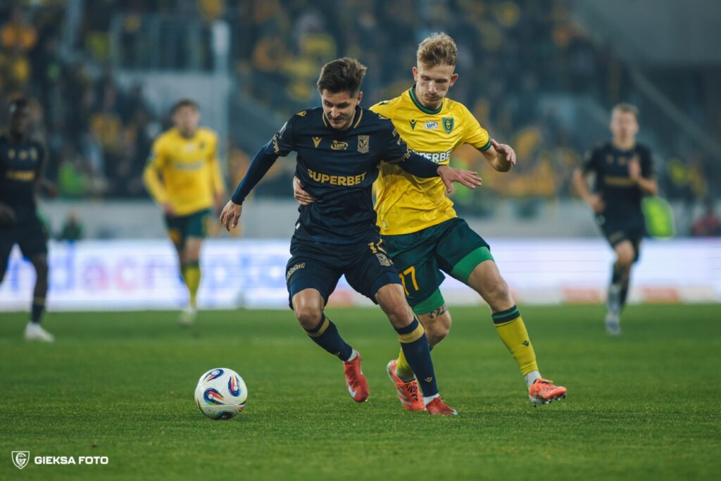 Lech Poznań wykorzystał nasz najsłabszy okres w meczach, jakim jest końcówka każdej połowy i mimo dobrych momentów nie udało się GieKSie urwać choćby punktu. GieKSa z przytupem rozpoczęła to spotkanie, gdy Bartosz Nowak skierował trudną piłkę w światło bramki. W 2. minucie Lech próbował stworzyć przewagę na lewym skrzydle, wtedy Mateusz Kowalczyk popisał się wślizgiem i dał gospodarzom kolejne sekundy posiadania piłki. Po pięciu minutach udało się to przekuć w akcję, gdy Marković z Wasielewskim przedarli się przez tercję środkową, podanie tego ostatniego za plecy obrońców było jednak zbyt mocne. Sztuka ta udała mu się w 11. minucie, jednak tym razem Marković przecenił zdolności motoryczne Szkurina przy zgraniu głową. Kolejne dwie minuty należały do przyjezdnych, choć nie byli w stanie przejść Arkadiusza Jędrycha. W 17. minucie Arkadiusz Jędrych zastosował znany z polskich boisk manewr „laga”, dzięki której po walce Wasielewskiego na skrzydle okazje mieli Kowalczyk i Szkurin – Mrozek był górą. W 32. minucie niefortunna próba przejęcia przez Bartosza Nowaka mogła się zemścić, lecz Marcin Wasielewski zdołał powstrzymać akcję na drugim słupku. Trzy minuty później Lukas Klemenz powstrzymał pędzącego Fiabemę tuż pod naszą bramką, obaj zawodnicy przypłacili to groźnym zderzeniem pod bandą reklamową. W 38. minucie Bartosz Nowak dla kontrastu zanotował przechwyt doskonały na połowie rywala, za to późniejsze podanie zupełnie odebrało pozytywy z tej akcji. Szybko zrehabilitował się wykonaniem rzutu wolnego z połowy boiska, gdy Mrozek zaliczył przelot na całkiem sporą odległość przy piąstkowaniu. 45. minuta, jak to już mamy w zwyczaju, przyniosła straconą bramkę – nikt nie pomógł Kowalczykowi w powstrzymaniu Filipa Jagiełły, który wyłożył Fiabemie piłkę jak na tacy. Kolejną dobrą okazję mógł mieć Bengtsson, w kontrataku przeszkodził mu niezawodny Wasyl. Lech wyraźnie przejął inicjatywę, w kolejnych minutach nasza linia defensywna miała sporo pracy, a cały zespół był zamknięty w tercji obronnej. Dobrą okazję w 11. minucie doliczonego czasu miał Milić po rzucie rożnym, jego zgranie piętką na szczęście rozczytał Arkadiusz Jędrych. Druga połowa zaczęła się przechwytem Wasyla i akcją na obieg z Markoviciem, zakończoną zbyt mocnym odegraniem. W 52. minucie strzały po stałym fragmencie Bartosza Nowaka oddali obaj nasi wahadłowi: Wasielewski został wyblokowany, a Galan… Trafił nieopodal chorągiewki. Trzy minuty później Marković posłał finezyjne zagranie w poprzek boiska za linią obrońców, defensywa Lecha musiała ratować się wybiciem na rzut rożny, po którym zbyt lekko główkował Szkurin. W 58. minucie poprzeczkę Bartosza Mrozka obił Borja Galan – GieKSa znów lepiej prezentowała się w pierwszym kwadransie połowy, choć ponownie była bez dogodniejszych sytuacji. W 63. minucie Bosch dobrze rozprowadził akcję do wybiegającego skrzydłem Czerwińskiego, ten jednak wybrał wysoką centrę na Bartosza Nowaka i nasz rozgrywający nie był już w stanie nic z tej sytuacji wykrzesać, a dodatkowo wspierający go Szkurin był na pozycji spalonej. Tuż po wejściu plasowany strzał zaprezentował Marcel Wędrychowski, gdyby nie wyblok Mrozek miałby naprawdę trudne zadanie. W 73. minucie skrupulatnie budowany atak zapoczątkowany skokiem pressingowym Rosołka zaprzepaścił fatalnym podaniem Alan Czerwiński, trybuny skwitowały to zagranie jękiem zawodu. Minutę później niepilnowany na długim słupku uderzał Bengtsson, Rafał Strączek mógł jednak z ulgą odetchnąć po jego kiksie. Odpowiedział Galan mierzonym strzałem, który po drodze odbił jeszcze Mateusz Skrzypczak i przysporzył sporo kłopotów swojemu golkiperowi. W 78. minucie Lukas Klemenz otrzymał miękkie dośrodkowanie od Nowaka z rzutu rożnego, główkował znacząco nad poprzeczką. Kolejne 60 sekund to był prawdziwy rollercoaster: błąd Milewskiego, wślizg Klemenza w polu karnym i niemal zagranie ręką, efektowny rajd Nowaka i dwukrotnie wielka szansa Galana po wrzutce Wędrychowskiego. Po drodze jeszcze ujrzeliśmy próbę przewrotki w wykonaniu Macieja Rosołka, a ataki GieKSy trwały w najlepsze jeszcze przez kilka minut. Odpowiedzieć chciał Ismaheel po wykorzystaniu złego ustawienia Klemenza, ten jednak naprawił swój błąd odbijając piłkę wprost w Rafała Strączka. W 89. minucie Sebastian Milewski zdołał wygrać pojedynek biegowy z Yannickiem Agnero, który wychodziłby na sytuację 1 na 1. W doliczonym czasie gry znów byliśmy świadkami rozszczelnienia defensywy, tym razem jednak udało się zamurować bramkę i dwukrotnie wyjść ze, zdawało się, beznadziejnych sytuacji. Trójkolorowi mieli swoje okazje i grali futbol znacznie bliższy swojemu, jednak nadal prześladuje ich klątwa końcowych minut. Widać pozytywy, jednak do utrzymania potrzeba punktów.