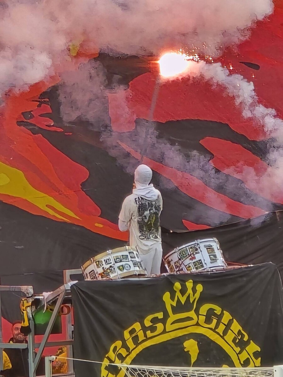 Niestety tuż przed przerwą bramkę zdobył Kolejorz, ku uciesze 1065 kibiców w sektorze gości. Dobrze się oflagowali i przez cały czas w użyciu mieli 6 tematycznych machajek. Słyszalnie jednak byli jedynie przed i po meczu, gdyż GKS tego dnia wspierał swym wokalem niemal cały stadion. Razem z nami tego dnia Banik (6), Górnik i ROW (4) – dzięki! Po meczu wielu z nas wybrało się do Zabrza, by tam wspierać KSG.