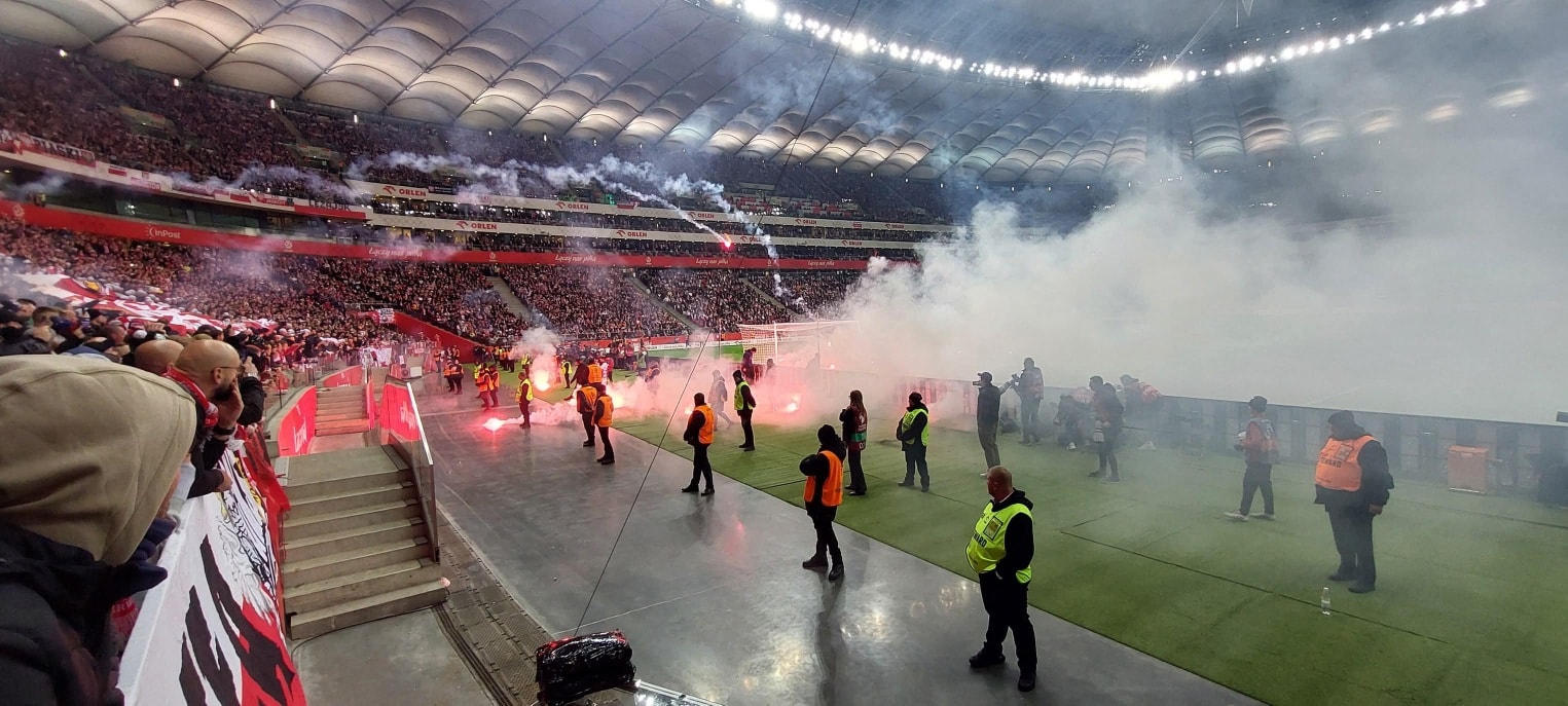 W pierwszej połowie meczu kibice prowadzili doping, w którym, choć nie brakowało przerw z uwagą dla winowajców tego zdarzenia, to pokazano, jak głośno może być wspierana biało-czerwona reprezentacja, gdyby tylko kibicom nie przeszkadzano. Niestety ani władza, ani PZPN, mimo interwencji Prezydenta, nie poszli po rozum do głowy i w drugiej połowie, około 58. minuty, kibice wrzucili race na płytę boiska, skandując „Miała ku*wa być oprawa, teraz pali się murawa”, co przerwało mecz na 5 minut. Po tym opuścili stadion, dając w ten sposób wyraz sprzeciwu i protestu przeciwko oszukiwaniu kibiców. W ten sposób po 60 minucie wszystkie ekipy solidarnie wyszły, ale trzeba zaznaczyć, że już wcześniej pokazali jedność, gdy ochrona próbowała ściągnąć flagę KSZO, a na pomoc ostrowianom przyszła m.in. ekipa Korony Kielce – brawo! Oliwy do ognia dodatkowo dolano dwa dni później, gdzie grała reprezentacja Ukrainy, której kibicom nikt nie przeszkadzał w zaprezentowaniu oprawy i wniesieniu sektorówki… POLAK W POLSCE GOSPODARZEM!