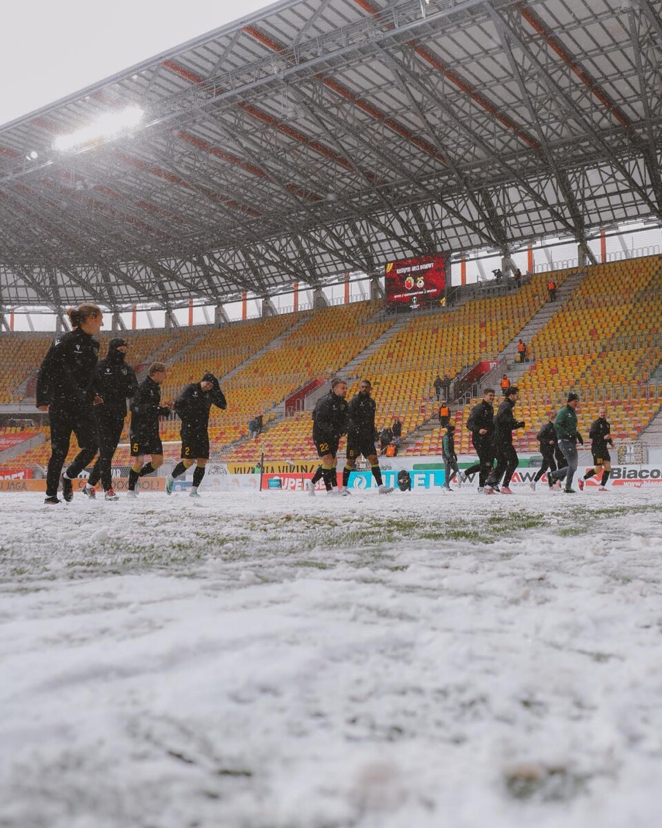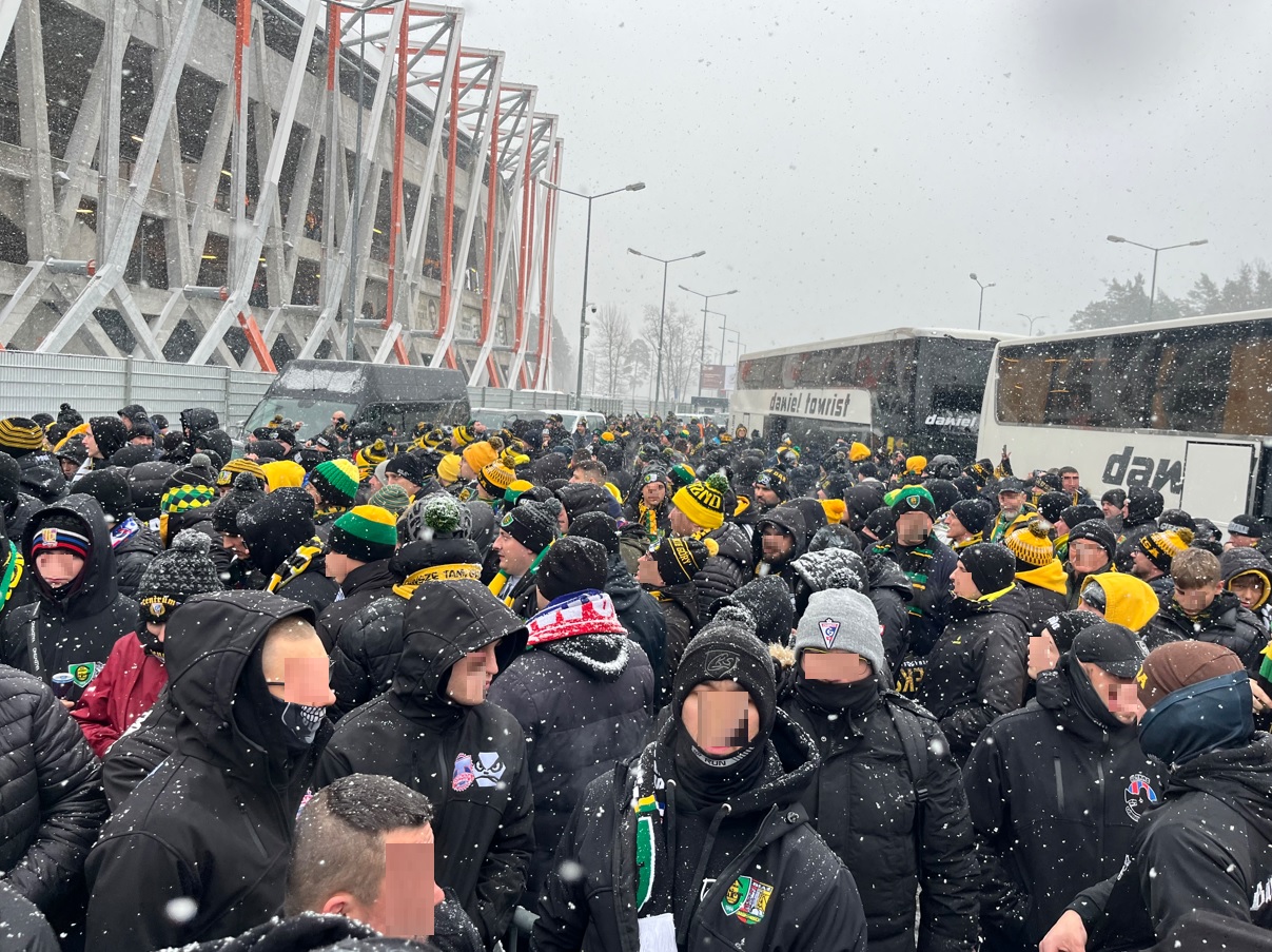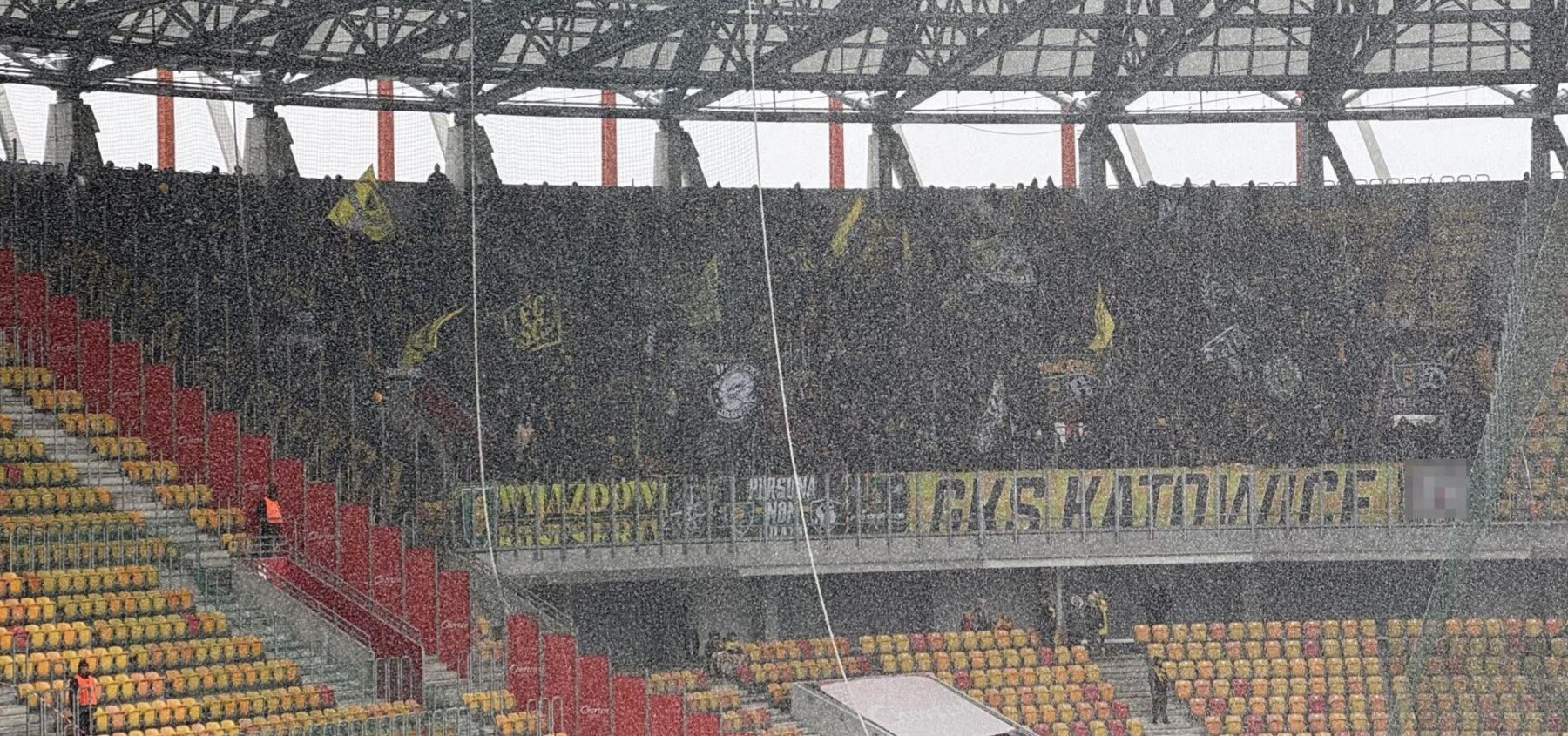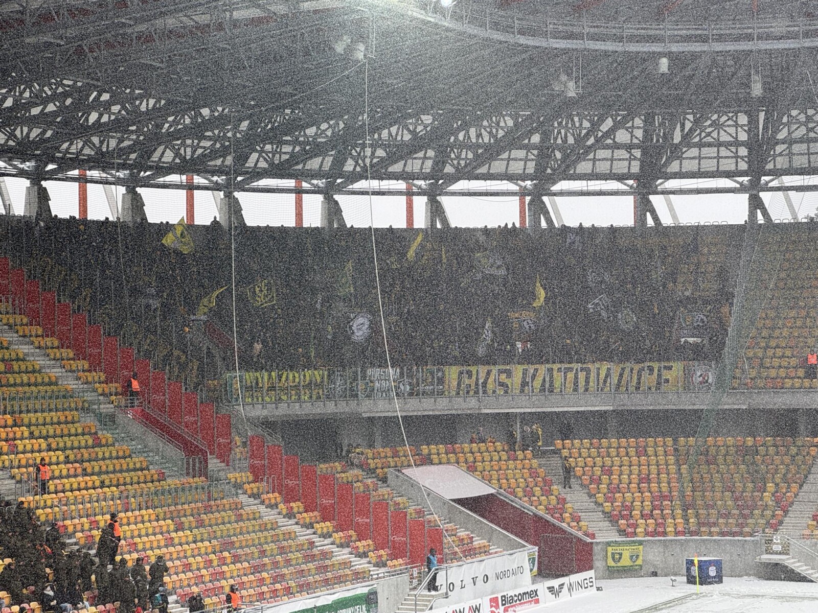 Pod Chorten Arenę zajechaliśmy na pół godziny przed rozpoczęciem meczu. Martwiliśmy się więc, by każdy zdążył wejść. Naprędce rozwieszamy flagi oraz cały nasz inwentarz, szykując się do dopingu. Było nas dokładnie 1022 osoby, w tym Banik (6) i Górnik (10) – dzięki! W tym czasie Jagiellończycy już śpiewali, zagrzewając swoich piłkarzy do gry. Po chwili i my ruszyliśmy z wokalem, śpiewając „jesteśmy zawsze tam…”. Dochodziły już do nas negatywne sygnały o możliwości odwołania meczu. Kwitujemy to głośno „kurwa mać, chcemy grać”, jasno deklarując nasze stanowisko. Śpiewamy też „piłka nożna dla kibiców”, bo nie po to przejechaliśmy taki kawał, by odwołali mecz z powodu centymetra śniegu, do którego odśnieżania nikt się nie kwapił. Zarząd Jagiellonii na spodziewaną śnieżycę przygotował aż 3 łopaty, którymi leniwie odśnieżono tylko linie na boisku. Nikt poza tym nawet nie kiwnął palcem, licząc, że te szybko zasypie. Lecz śnieg tylko prószył i nic już nie przysłonił. Kibice po obu stronach jasno dawali znać, że gra ma się odbyć, lecz sędzia stwierdził, że w tych warunkach jest to zbyt ryzykowne dla zdrowia piłkarzy. Szkoda, że w tym samym czasie na boisku bocznym rozgrywał się mecz juniorów z Akademii Jagiellonii i tu nie było nadmiernego zagrożenia dla dzieci. Cały stadion śpiewał „jebać PZPN”, a piłkarze dziękowali pod młynami kibicom za przybycie. Do naszego sektora, który wypełniony był dzielnicowymi i fanclubowymi chorągwiami, weszli kapitan GKS-u Arkadiusz Jędrych, Adrian Błąd i Dawid Kudła, dziękując za liczny przyjazd i ofiarując koszulki całej drużyny, które powędrowały do najmłodszych uczestników wyjazdu. Mega gest, tym bardziej że cała sytuacja zupełnie nie była zależna od nich, w przeciwieństwie do gospodarzy. Ci nie podołali zimowej aurze, która pojawiła się w Białymstoku na maksymalnie dwie godziny przed meczem i to w delikatnej formie. W sieci momentalnie pojawiły się zdjęcia muraw, które przygotowano do gry w ten weekend, mimo większych opadów śniegu na południu kraju i to na stadionach w niższych ligach, łącznie z A-klasą. Prawda jest taka, że taki obrót sprawy był na rękę drużynie Jagi, która ma tak napięty grafik przez grę w Lidze Konferencji i inne przełożone mecze, że ma ich do rozegrania jeszcze 7 w tym roku! Zresztą wspomniał też o tym ich trener w wywiadzie.
