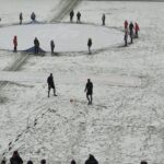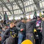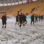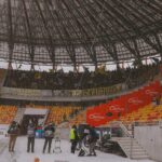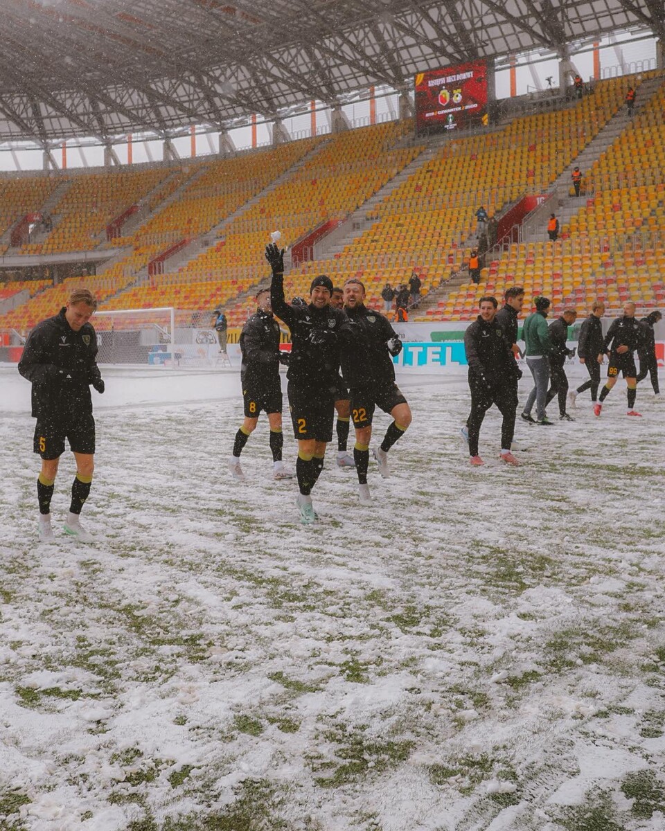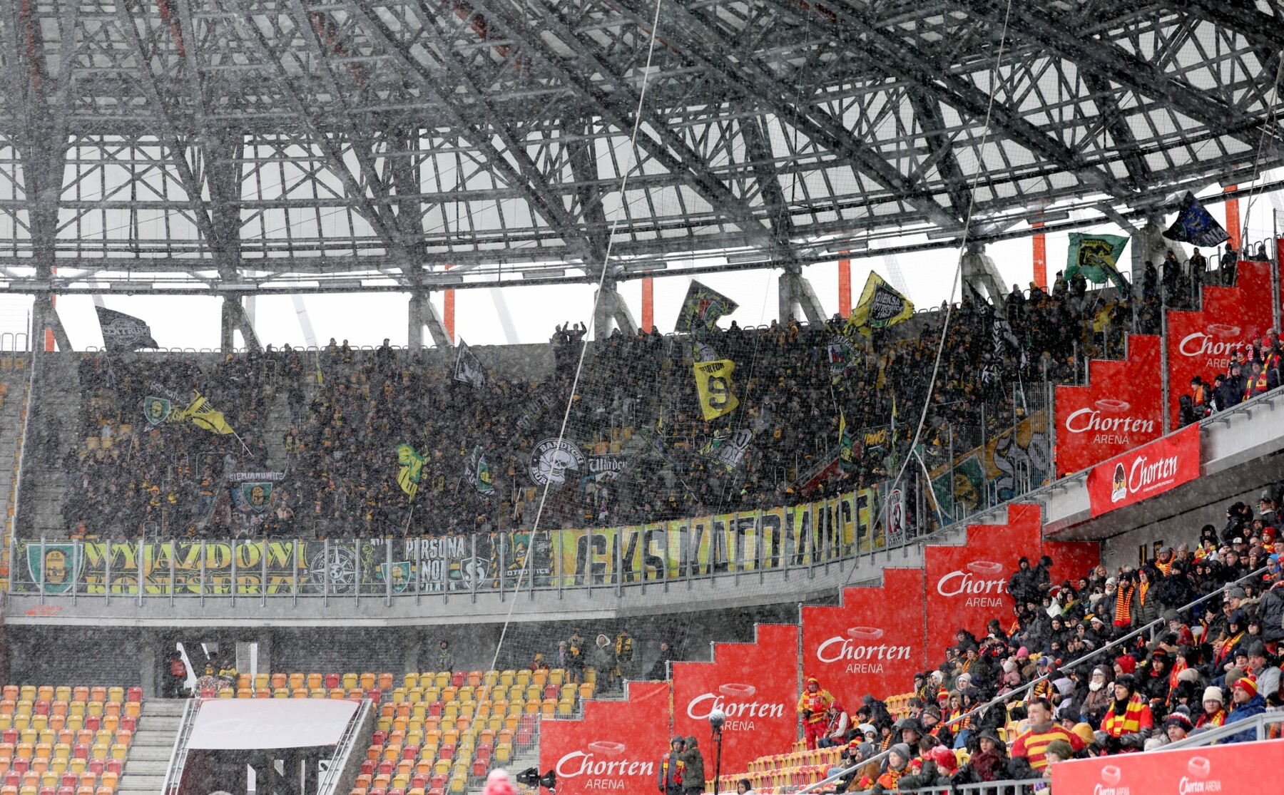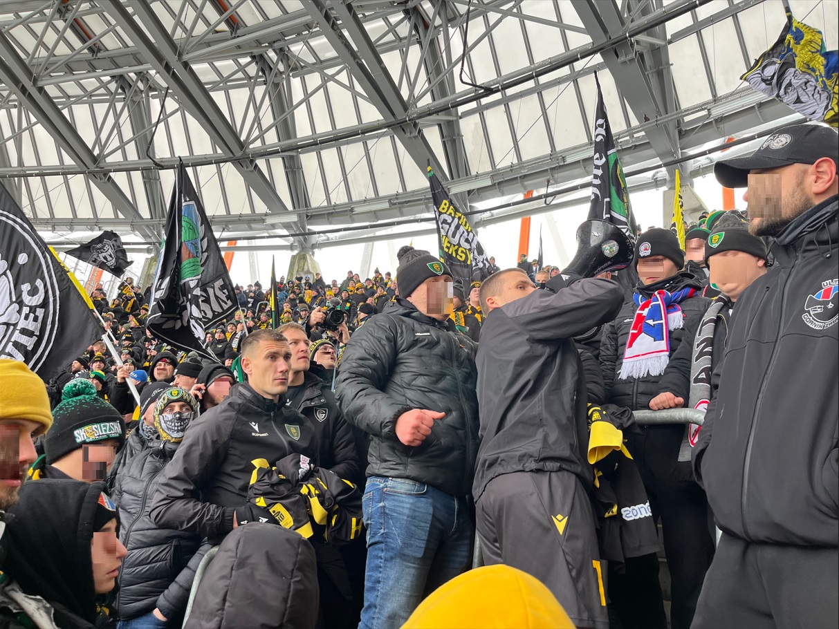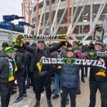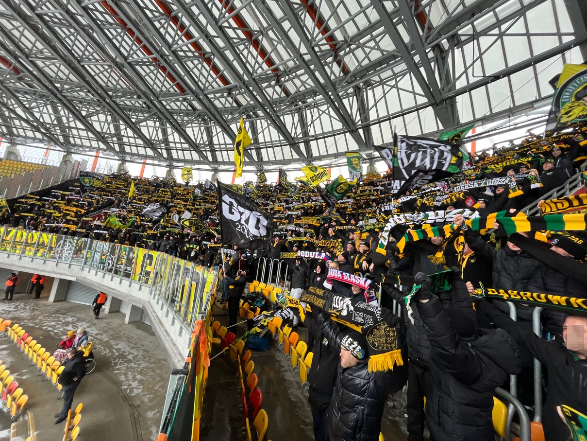 Pod Chorten Arenę zajechaliśmy na pół godziny przed rozpoczęciem meczu. Martwiliśmy się więc, by każdy zdążył wejść. Naprędce rozwieszamy flagi oraz cały nasz inwentarz, szykując się do dopingu. Było nas dokładnie 1022 osoby, w tym Banik (6) i Górnik (10) – dzięki! W tym czasie Jagiellończycy już śpiewali, zagrzewając swoich piłkarzy do gry. Po chwili i my ruszyliśmy z wokalem, śpiewając „jesteśmy zawsze tam…”. Dochodziły już do nas negatywne sygnały o możliwości odwołania meczu. Kwitujemy to głośno „kurwa mać, chcemy grać”, jasno deklarując nasze stanowisko. Śpiewamy też „piłka nożna dla kibiców”, bo nie po to przejechaliśmy taki kawał, by odwołali mecz z powodu centymetra śniegu, do którego odśnieżania nikt się nie kwapił. Zarząd Jagiellonii na spodziewaną śnieżycę przygotował aż 3 łopaty, którymi leniwie odśnieżono tylko linie na boisku. Nikt poza tym nawet nie kiwnął palcem, licząc, że te szybko zasypie. Lecz śnieg tylko prószył i nic już nie przysłonił. Kibice po obu stronach jasno dawali znać, że gra ma się odbyć, lecz sędzia stwierdził, że w tych warunkach jest to zbyt ryzykowne dla zdrowia piłkarzy. Szkoda, że w tym samym czasie na boisku bocznym rozgrywał się mecz juniorów z Akademii Jagiellonii i tu nie było nadmiernego zagrożenia dla dzieci. Cały stadion śpiewał „jebać PZPN”, a piłkarze dziękowali pod młynami kibicom za przybycie. Do naszego sektora, który wypełniony był dzielnicowymi i fanclubowymi chorągwiami, weszli kapitan GKS-u Arkadiusz Jędrych, Adrian Błąd i Dawid Kudła, dziękując za liczny przyjazd i ofiarując koszulki całej drużyny, które powędrowały do najmłodszych uczestników wyjazdu. Mega gest, tym bardziej że cała sytuacja zupełnie nie była zależna od nich, w przeciwieństwie do gospodarzy. Ci nie podołali zimowej aurze, która pojawiła się w Białymstoku na maksymalnie dwie godziny przed meczem i to w delikatnej formie. W sieci momentalnie pojawiły się zdjęcia muraw, które przygotowano do gry w ten weekend, mimo większych opadów śniegu na południu kraju i to na stadionach w niższych ligach, łącznie z A-klasą. Prawda jest taka, że taki obrót sprawy był na rękę drużynie Jagi, która ma tak napięty grafik przez grę w Lidze Konferencji i inne przełożone mecze, że ma ich do rozegrania jeszcze 7 w tym roku! Zresztą wspomniał też o tym ich trener w wywiadzie.