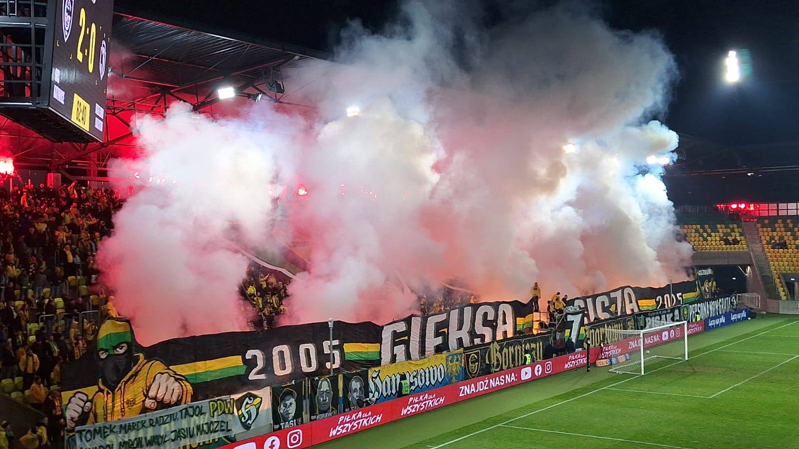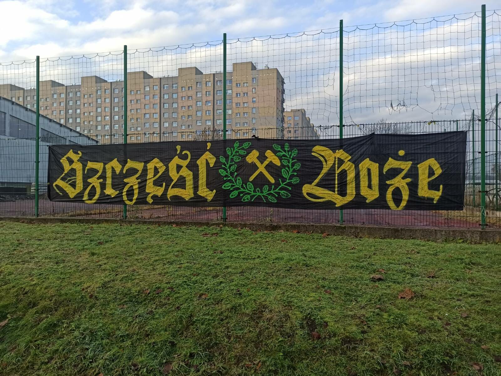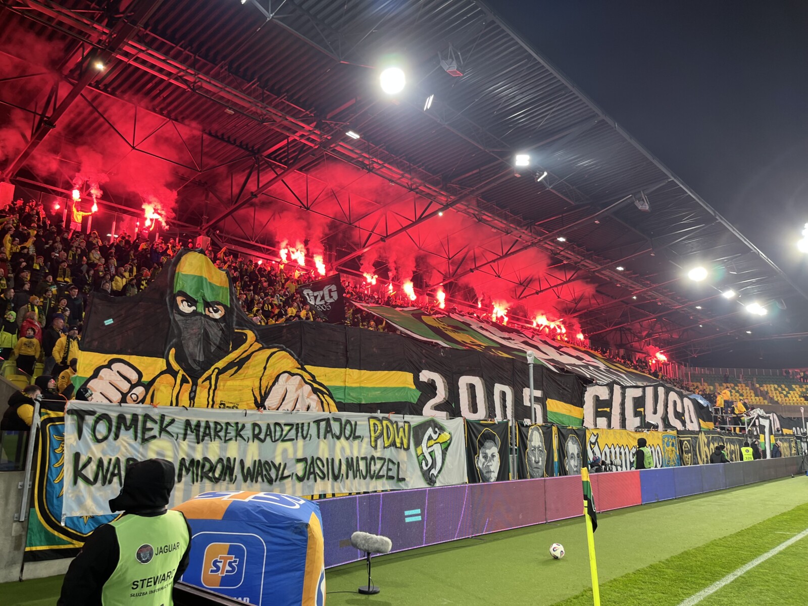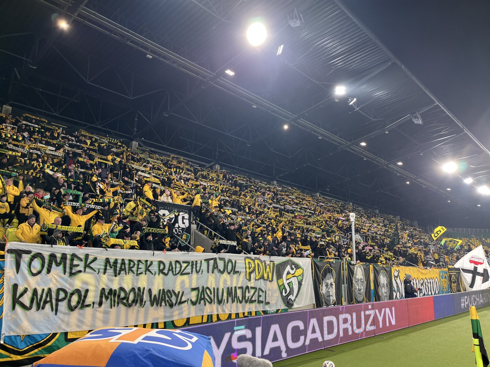 Na płocie zawisło 13 flag, 2 transparenty oraz powiewało 7 chorągwi. Pamiętaliśmy tu o braciach za kratami, w sektorze niebo, górniczych tradycjach oraz grudniowej pacyfikacji strajkujących górników KWK Wujek w 1981 roku. Można powiedzieć, że nasze oflagowanie było zwierciadłem naszej tożsamości i braterskiej więzi.