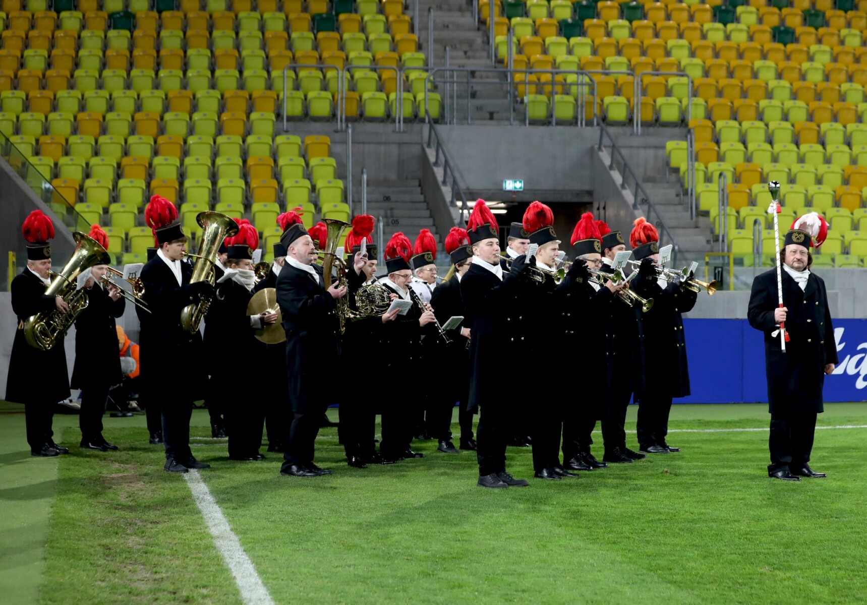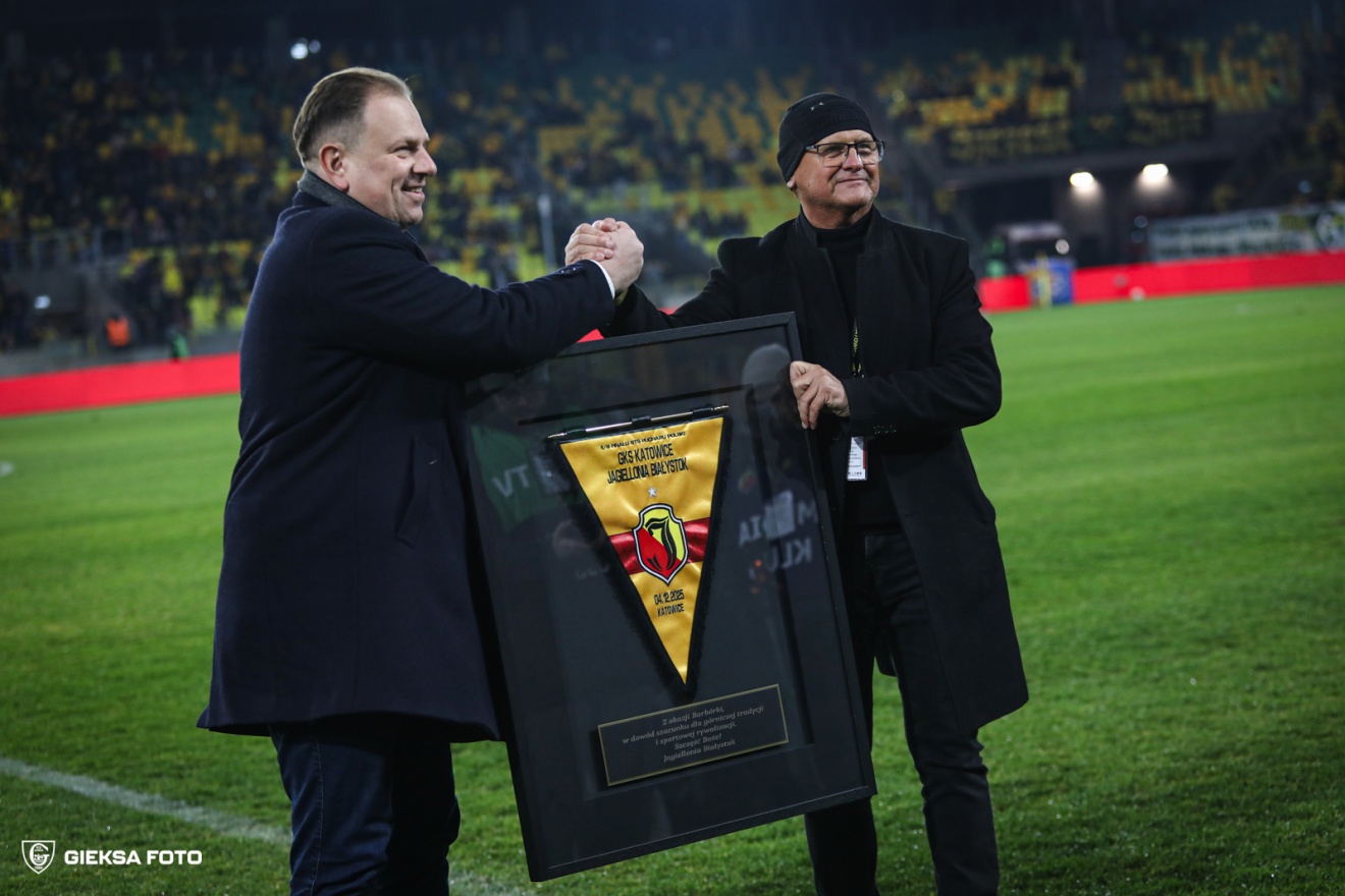 Chwilę później, piłkarzy wyprowadziła eskorta utworzona z naszych kolegów i górników w mundurach górniczych, w rytmie przygrywanym przez kopalnianą orkiestrę. Na telebimie wyświetlono piłkarzy w dołowym ubiorze na tle czarnego złota. Nie brakowało tam też życzeń dla górniczej braci oraz dla GieKSy z Gisza. Swoje życzenia także przekazał w imieniu swojego klubu prezes Jagiellonii, który w przerwie wręczył prezesowi Sławomirowi Witkowi, specjalny proporzec z okazji Barbórki „w dowód szacunku dla górniczej tradycji i sportowej rywalizacji”.