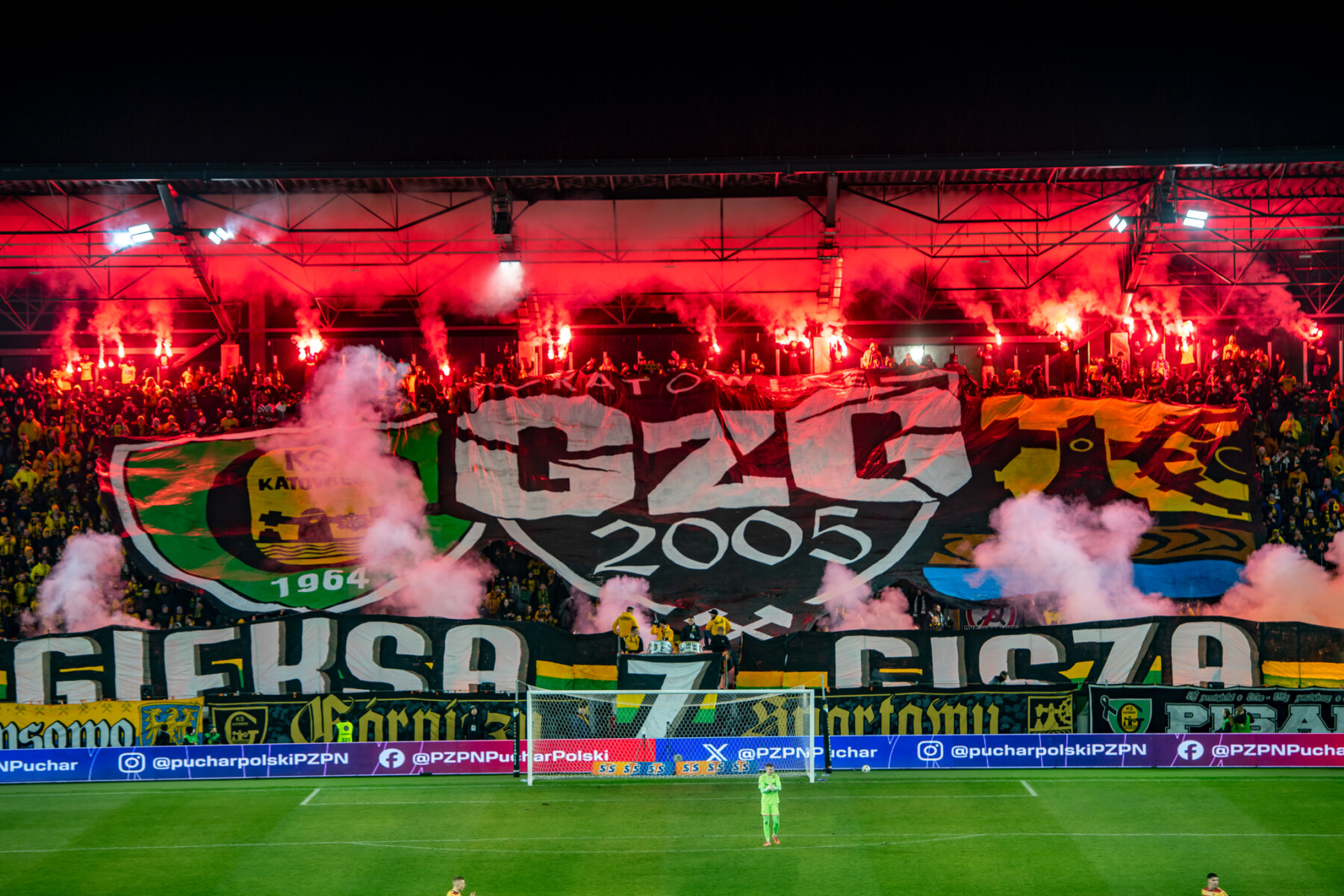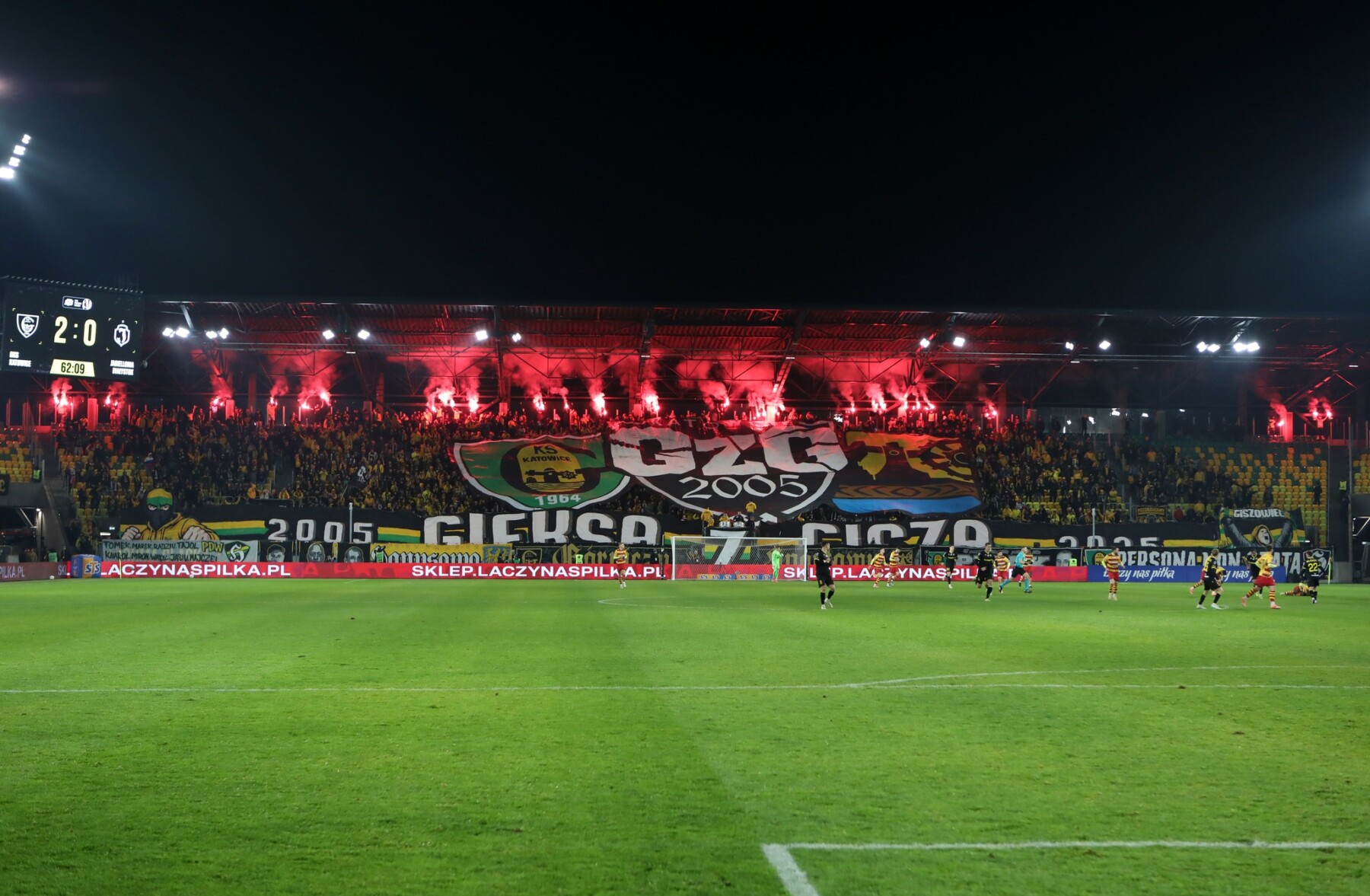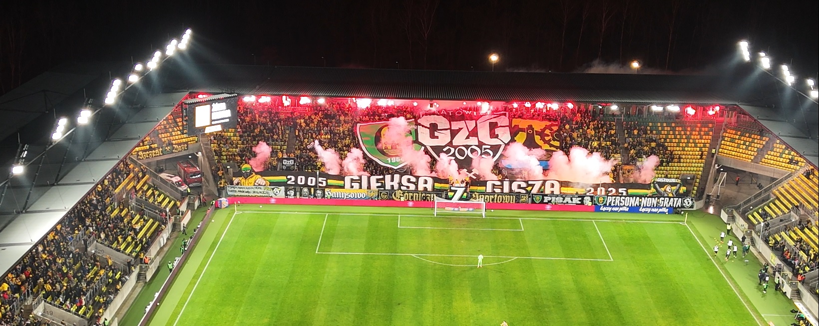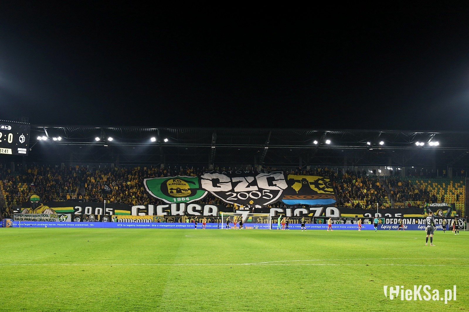 W drugiej połowie przyszedł czas na główny pokaz, który miał miejsce symbolicznie w 64. minucie. Nad głowami rozciągnięto wycinaną sektorówkę z logo GzG umieszczonym między herbami GieKSy i Katowic o wymiarach 38×18 metrów, a z boków Blaszoka wyłoniły się transparenty tworzące napis „2005 GIEKSA Z GISZA 2025”, na których końcach widniały dwie postacie kibiców. Jeden w trójkolorowej kominiarce i uniesioną gardą oraz drugi z okrzykiem na ustach i wzniesionym szalem. Po chwili wszystko zostało oświetlone i zadymione rzędem 50 czerwonych rac u góry oraz rzędem 60 ogni wrocławskich u dołu. Całość wyszła dobrze, choć transparent mógłby być lepiej widoczny.