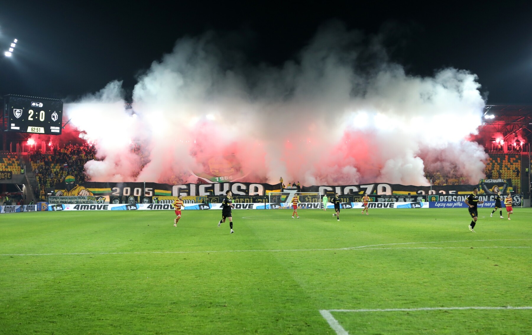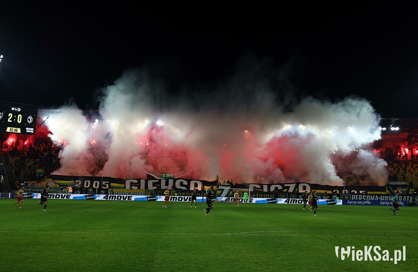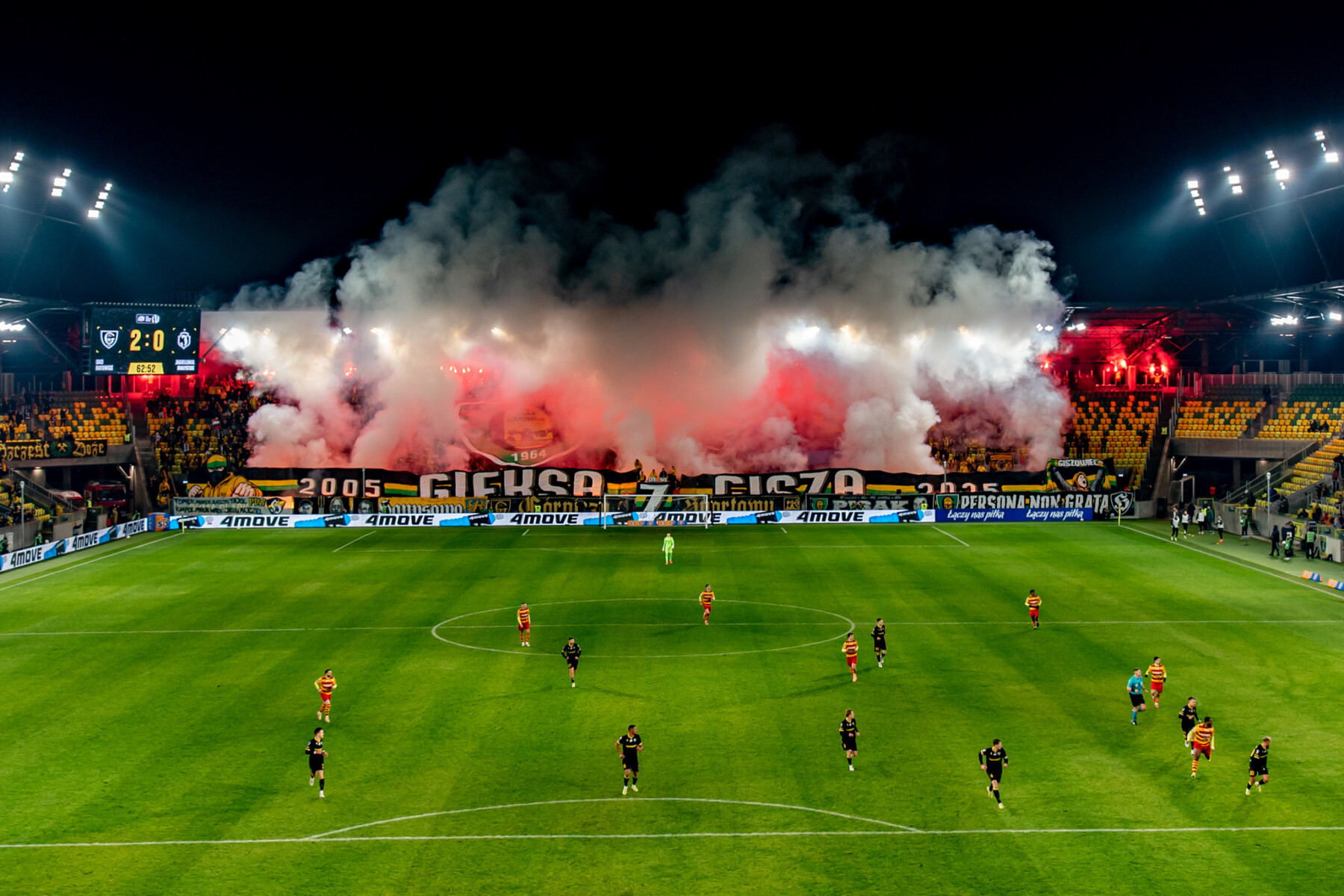 W drugiej połowie przyszedł czas na główny pokaz, który miał miejsce symbolicznie w 64. minucie. Nad głowami rozciągnięto wycinaną sektorówkę z logo GzG umieszczonym między herbami GieKSy i Katowic o wymiarach 38×18 metrów, a z boków Blaszoka wyłoniły się transparenty tworzące napis „2005 GIEKSA Z GISZA 2025”, na których końcach widniały dwie postacie kibiców. Jeden w trójkolorowej kominiarce i uniesioną gardą oraz drugi z okrzykiem na ustach i wzniesionym szalem. Po chwili wszystko zostało oświetlone i zadymione rzędem 50 czerwonych rac u góry oraz rzędem 60 ogni wrocławskich u dołu. Całość wyszła dobrze, choć transparent mógłby być lepiej widoczny.