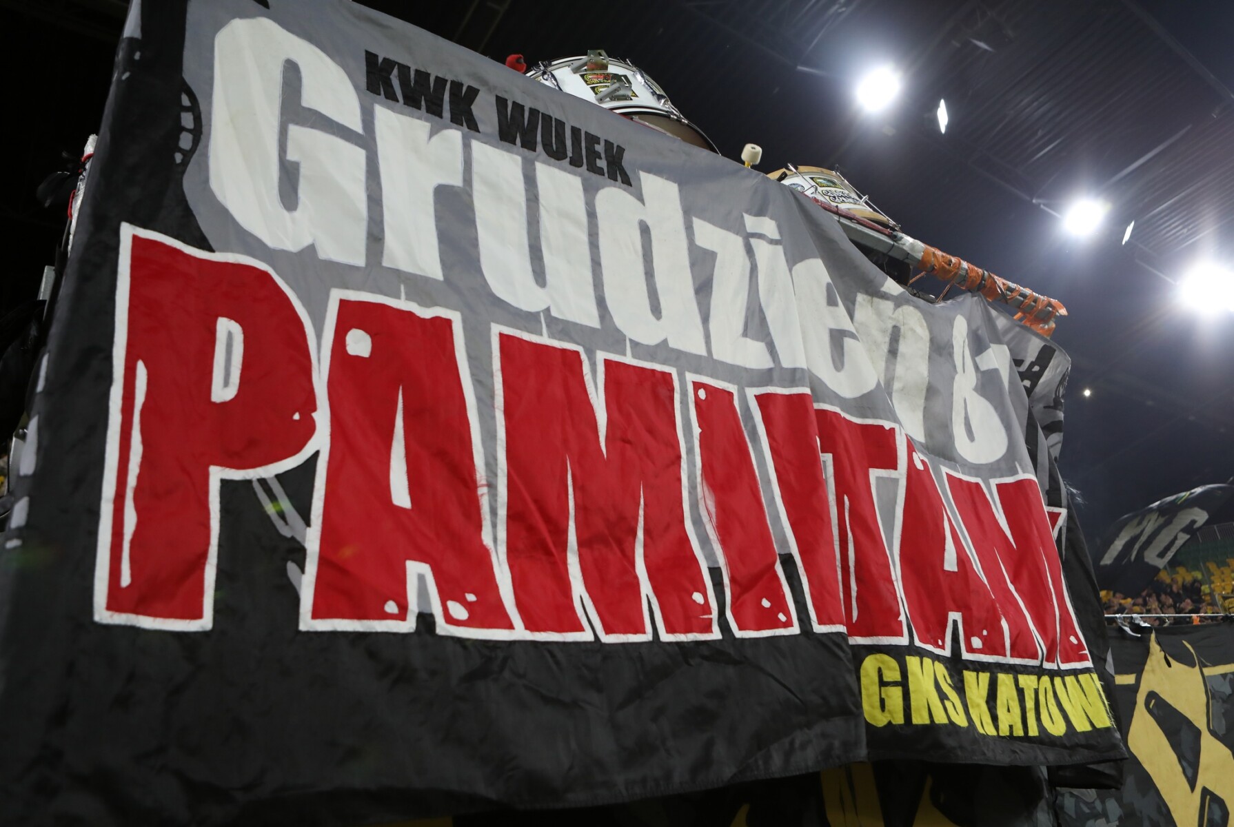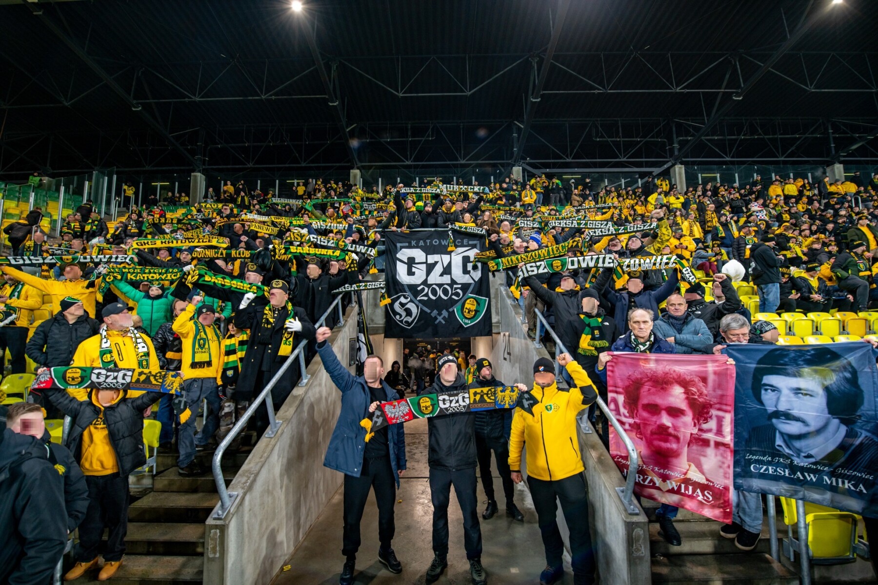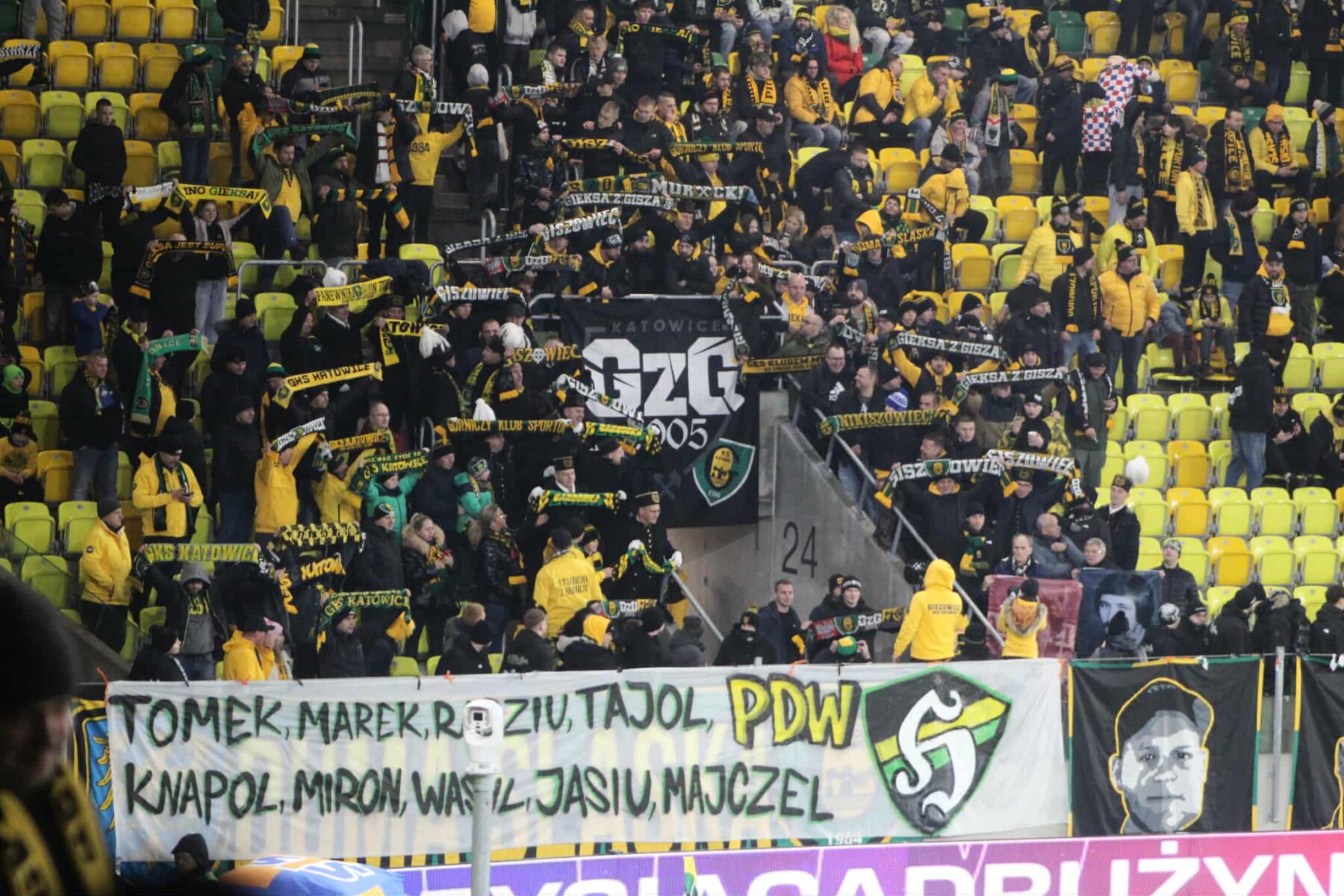 Oflagowanie: transparent SZCZĘŚĆ BOŻE, DUMA ŚLASKA, transparent TOMEK, MAREK, RADZIU, TAJOL, KNAPOL, MIRON, WASYL, JASIU, MAJCZEL PDW, ŚP. TASI, ŚP. MORAW, ŚP. EMI, HANYSOWO, GÓRNICZY KLUB SPORTOWY, ŚP. PISAK, PERSONA NON GRATA, GzG’05, ONE NINE SIX FOUR, ANTYKOMUNA-GKS KATOWICE, POZDRAWIAMY NIEOBECNYCH GIEKSIARZY – PNG PDW, GRUDZIEŃ’81 PAMIĘTEMY oraz chorągwie GzG, FURTOK, GÓRNY ŚLĄSK (herb), POLSKA (herb), GODŁO GÓRNICZE, PNG i KWK WUJEK (symbol pamięci pacyfikacji KWK Wujek).