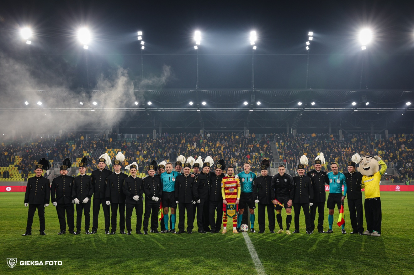 Trójkolorowi pewnie pokonali Jagiellonię Białystok w pucharowym starciu, a pierwsze skrzypce ponownie grał niezastąpiony Bartosz Nowak. W związku z Barbórką piłkarzy na mecz wyprowadzili górnicy, obecna była także orkiestra górnicza. Oba zespoły postawiły na otwarte rozpoczęcie meczu, ostatecznie to GieKSa mogła pochwalić się nieco lepszym początkiem po dwóch zejściach Szkurina na prawe skrzydło. Pierwszy rajd należał, nie mogło być inaczej, do Bartosza Nowaka, jednak na jakikolwiek strzał kibice czekali dobrych kilka minut. W 9. minucie uderzenie oddał Dimitris Rallis, jednak był on mocno sytuacyjny i zupełnie nieudany. Groźnie było także po dośrodkowaniu Wojtuszka w nasze pole bramkowe, tam na szczęście czekał Arkadiusz Jędrych i bezceremonialnie oddalił zagrożenie. Poprawił jego centrę Jesus Imaz, jedynie muskając głowy swoich partnerów piłką. W 16. minucie Jesus Imaz był niesamowicie blisko pięknej bramki piętką – Rafał Strączek tylko bezradnie spoglądał, jak Marcin Wasielewski w ostatniej chwili ekspediował futbolówkę. W 19. minucie w ślady zastępującego go Rajovicia poszedł Ilja Szkurin: doskonały przerzut Borjy Galana zgrał Wasielewski głową do Wędrychowksiego, a ten wystawił mu piłkę na szerokości dalszego słupka. Nie była to wcale łatwa sytuacja, jednak i napastnik nie jest to przecież przeciętny – można od niego oczekiwać skutecznej finalizacji takich akcji. Równie udanie odpowiedziała Jaga, ale próba technicznego strzału z dystansu minęła bramkę Rafała Strączka w bezpiecznej odległości. Działo się w drugim kwadransie naprawdę sporo. Galan wywalczył corner, a po nim na oślep uderzali w piłkę zawodnicy obu drużyn i aż sam Piekutowski nie był pewien, czy składać się do interwencji. W 28. minucie Jesse Bosch dobrze podał na skrzydło i ruszył w szesnastkę, gdzie z pomocą przypadku zdołał się przedrzeć i dośrodkować. Znów piłka zatańczyła pomiędzy zawodnikami obu zespołów, ponownie wylatując w stronę naszej bramki. Dominacja GieKSy zdawało się, że zostanie przerwana w najsmutniejszy możliwy sposób. Kontrę Jóźwiaka powstrzymaliśmy na szczęście pułapką ofsajdową, a dla pewności Lukas Klemenz zdołał jeszcze wyjaśnić sytuację dość widowiskową interwencją. Szybki atak Czerwińskiego w 36. minucie przerodził się w kontrę Rallisa po nieudanym podaniu i pechowym pressingu Wędrychowskiego, znów interweniować musiał Klemenz. W 42. minucie do parady zmusił Strączka Polak, jednak takimi strzałami nie wyrządzi krzywdy żadnemu golkiperowi. Była to i tak najlepsza próba ze wszystkich trzech Jagiellonii w okolicach 40. minuty, co nie świadczyło dobrze o stanie ich poczynań ofensywnych. Co zrobił Piekutowski w doliczonym czasie? Zapraszamy do zostawienia odpowiedzi w komentarzach. Bramkarz gości wpadł na Wędrychowskiego, który momentalnie się otrzepał i oddał piłkę Bartoszowi Nowakowi, a nasz pomocnik po profesorsku umieścił piłkę w siatce. Drugą połowę mogliśmy rozpocząć z przytupem po doskoku Marcina Wasielewskiego w szesnastce, jednak Ilja Szkurin nie był przekonany co do oddania strzału i akcja spełzła na niczym. Kontrę gości powstrzymał Klemenz do spółki z Wasielewskim: pierwszy utrudnił centrę, a drugi dał się sfaulować Jóźwiakowi. Chwilę później z dystansu uderzał Bartosz Mazurek, na raty interweniował Rafał Strączek. Niezdecydowanie Szkurina… przyniosło nam trafienie w 52. minucie! Zgrał piłkę do Nowaka i zupełnie przypadkowo zablokował jego przerzut, czym otworzył sobie drogę do bramki, pośród zaskoczonej defensywy gości. W 54. minucie Bartosz Nowak przemierzył całe boisko, pokazując się Czerwińskiemu przy rzucie wolnym, ale kiedy nie otrzymał piłki, to wyładował frustrację kilkoma podskokami. W 60. minucie kolejny udany skok pressingowy Wędrychowskiego przyniósł nam kontratak ze strony Wasyla, tym razem goście zdołali odbudować swoje zasieki obronne. Podobnie zakończyła się centra samego Wędrychowskiego, która była jednak o centymetry od znalezienia nogi Lukasa Klemenza. Po drugiej stronie kąśliwą wrzutkę posłał Bernardo Vital, Rafał Strączek musiał wykazać się sporym zasięgiem wyskoku w przód. W okolicach 60. minuty kilka kluczowych interwencji zanotował Jesse Bosch, bez niego różnie mógłby wyglądać wynik w obliczu obiecujących akcji Jagi. W 70. minucie Szkurin ewidentnie był trzymany za gardło podczas walki o górną piłkę, niezauważenie tego to duży błąd sędziego i skończył się groźnym kontratakiem przyjezdnych. Osiem minut później szczęścia próbował Eman Marković mocnym uderzeniem z dystansu, jednak do interwencji zmusił jedynie kibica na trybunach. Odpowiedział Afimico Pululu kopiując pudło Szkurina z pierwszej części gry, wcześniej udało się Wdowikowi przebić dośrodkowaniem przez nasze zasieki obronne. Jak trwoga w ostatniej tercji meczu to do Boscha – w 83. minucie wyczyścił Pululu w naszej szesnastce. W 85. minucie Strączek zamiast piłki wypiąstkował głowę napastnika, a jedenastkę pewnie wykorzystał Afimico Pululu. Już chwilę później Imaz chciał zaskoczyć golkipera finezyjnym strzałem, ten stanął na wysokości zadania. W doliczonym czasie gry Pietuszewski popisał się błyskiem swojego talentu w naszej szesnastce, Trójkolorowi pracą zespołową wyjaśnili sytuację w ostatnim dopiero momencie. Strączek wybił piłkę, Szkurin odnalazł ostatnie pokłady energii na skok pressingowy, a tuż przy słupku z dystansu przymierzył Bartosz Nowak – tak padła bramka na 3:1. Na trybunach jeszcze przed końcowym gwizdkiem rozległo się „Puchar Polski znowu będzie nasz” i „Jestem gotowy pojechać na Narodowy”. Kto wie? Nikt nie zabroni marzyć, a piłkarze dają nam ku temu powody…