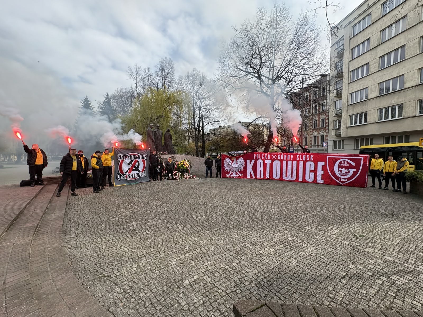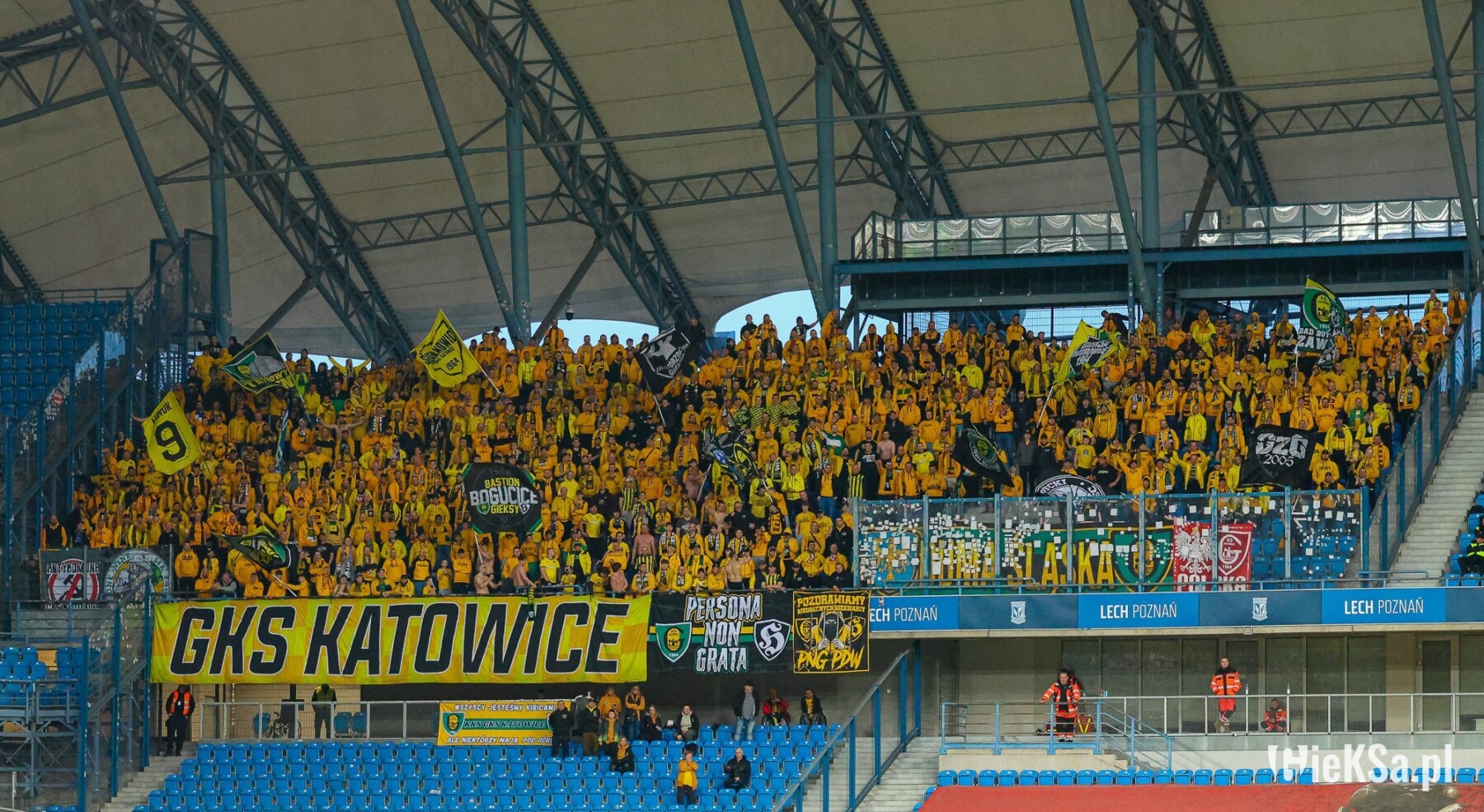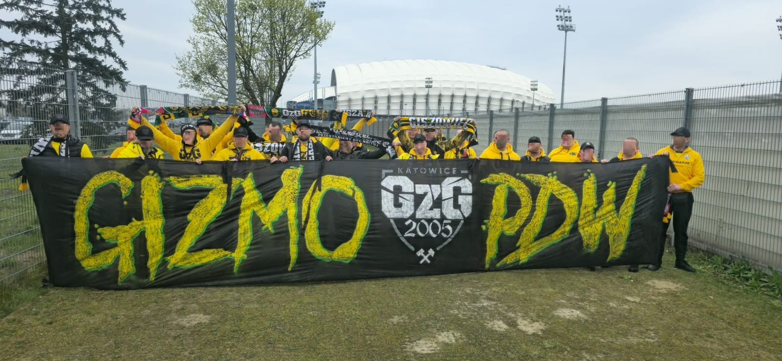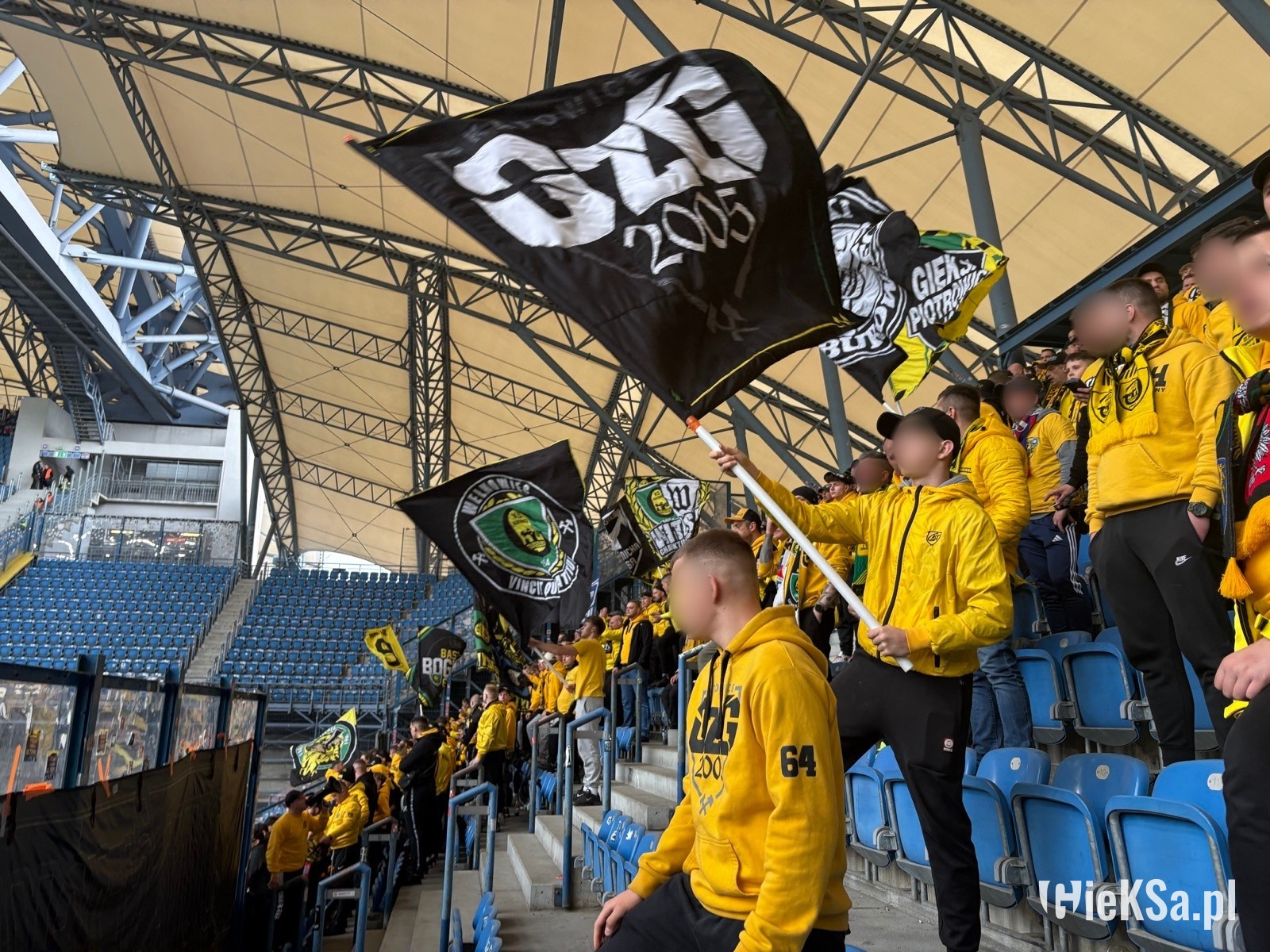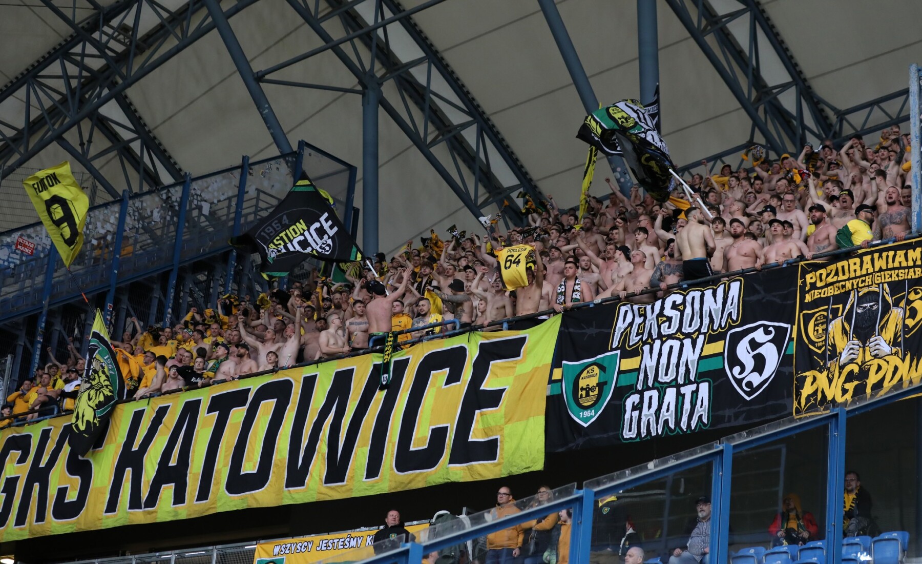 Oflagowanie: ANTYKOMUNA – GKS KATOWICE, ONE NINE SIX FOUR, GKS KATOWICE, PERSONA NON GRATA (mała), POZDRAWIAMY NIEOBECNYCH GIEKSIARZY – PNG PDW, DUMA ŚLĄSKA, POLSKA (kadrówka mała) oraz chorągwie GzG, WITOSA, PIOTROWICE, TAUZEN, WEŁNOWIEC, BUROWIEC, MYSŁOWICE, JAWORZNO, ZAWODZIE, SIEMIANOWICE ŚLĄSKIE, BOGUCICE, FURTOK #9, 30 YEARS GKS & FCB.