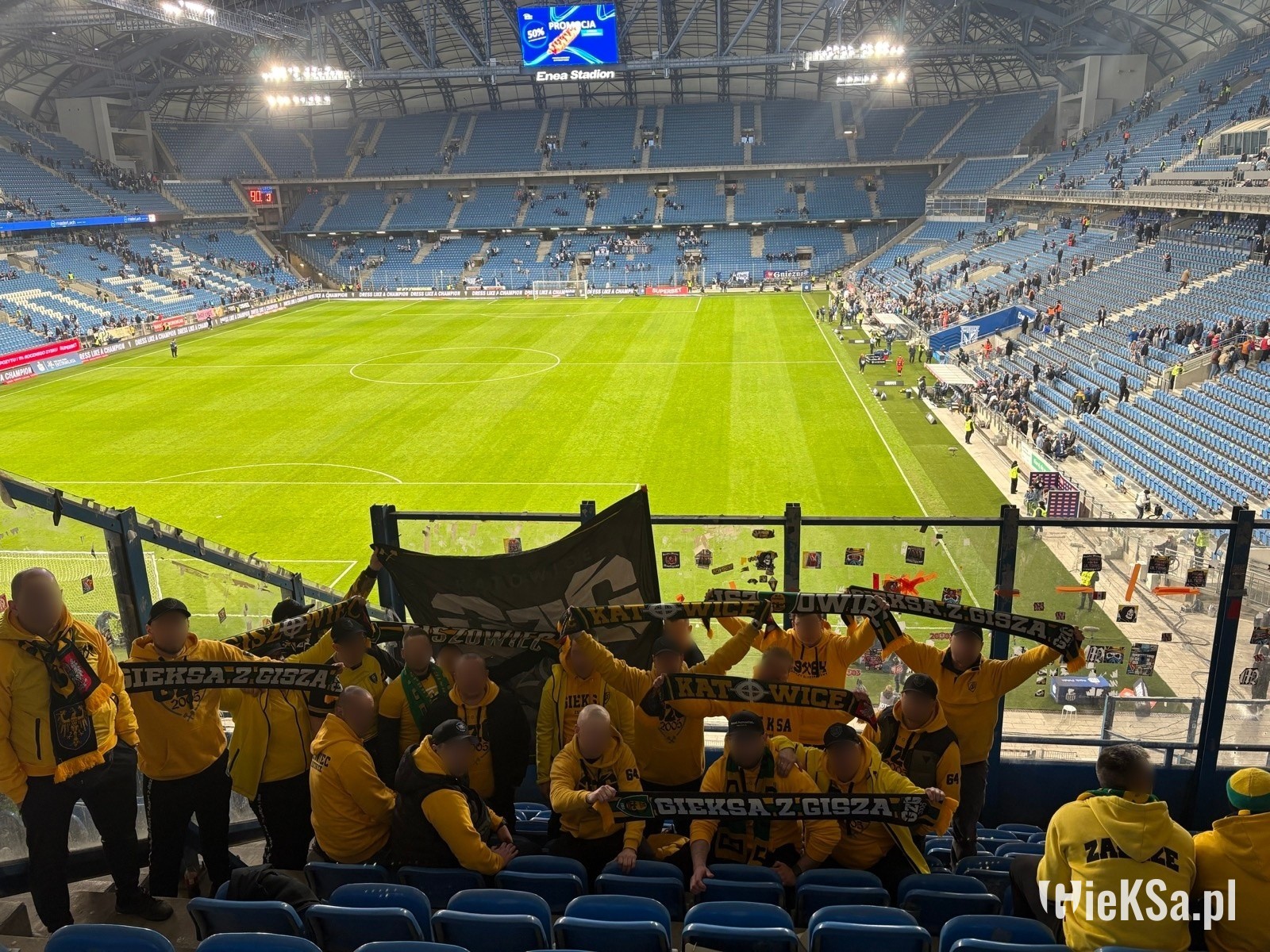 Przed samym wyjazdem do Poznania grupa GieKSiarzy uczciła pamięć Ofiar Zbrodni Katyńskiej pod katowickim pomnikiem, gdzie m.in. złożyliśmy wieniec. Następnie wszyscy spotkaliśmy się na Nowej Bukowej, skąd o 10:40 wyruszyliśmy autokarami do stolicy Wielkopolski. Jadąc na teren aktualnego Mistrza Polski i tak samo aktualnego lidera, zastanawialiśmy się, jak pokaże się nasza drużyna, po czwartkowym wyczerpującym meczu w Częstochowie. Po drodze, jeszcze w sąsiednim województwie, zaczęły mijać nas samochody z wystającymi niebiesko-białymi szalami w oknach, co z czasem tylko się nasilało. Spodziewaliśmy się więc, że na Bułgarskiej, zasiądzie tego dnia liczna widownia i się nie zawiedliśmy, bo mecz ten ostatecznie oglądało ponad 35 tysięcy widzów.