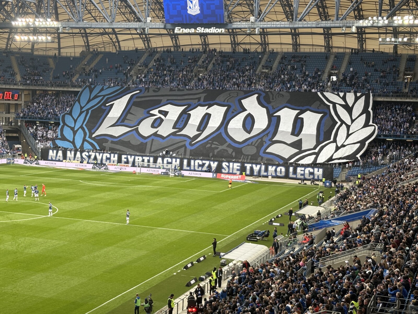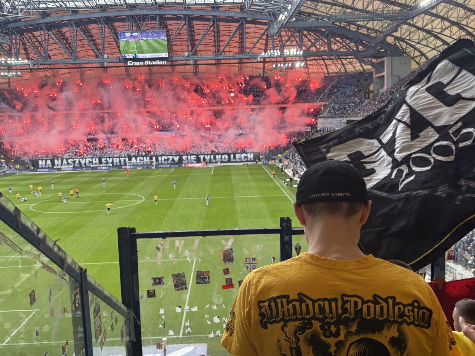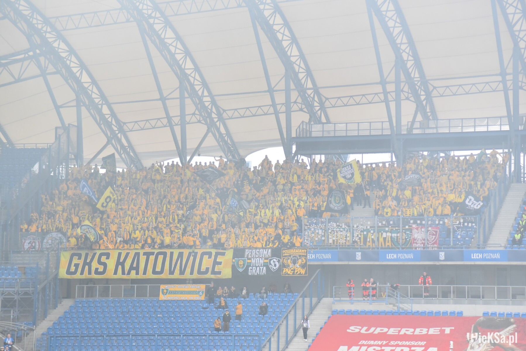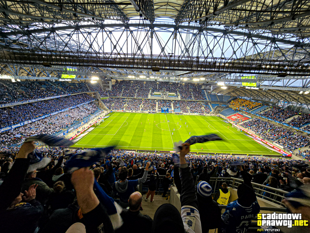 Chwilę później ruszyliśmy z dopingiem, a hymn GieKSiarzy „GKS młody Śląski klub” przedzierał się przez akustykę budowaną przez tysiące gardeł Pyrlandii. Lechici tego dnia zasiedli na trzech kondygnacjach w Kotle, wypełniając szczelnie dwie, na których utworzyli unikalny w naszym kraju dwukolorowy młyn. Na początku meczu Niebiesko-Biali zaprezentowali oprawę z cytatem z piosenki „Carlos – Wielkopolska” „W NASZYCH FYRTLACH LICZY SIĘ TYLKO LECH”, do której rozciągnięto na dwóch poziomach sektorówkę „Landy”, na której napis był wpisany w laur, a w tle widoczny był herb KKS-u i Wielkopolski. Po opadnięciu wieloformatowego płótna, Kocioł zapłonął blaskiem czerwonych rac na całej swojej powierzchni. W ten sposób poznańska lokomotywa uhonorowała swoje fan cluby, rozwieszając dodatkowo, na trzech poziomach 44 flagi, z czego większość to właśnie nazwy miejscowości kibicujące Lechowi. Machali także kilkunastoma machajkami z różnymi motywami i wywiesili transparent dla kibica Cracovii.