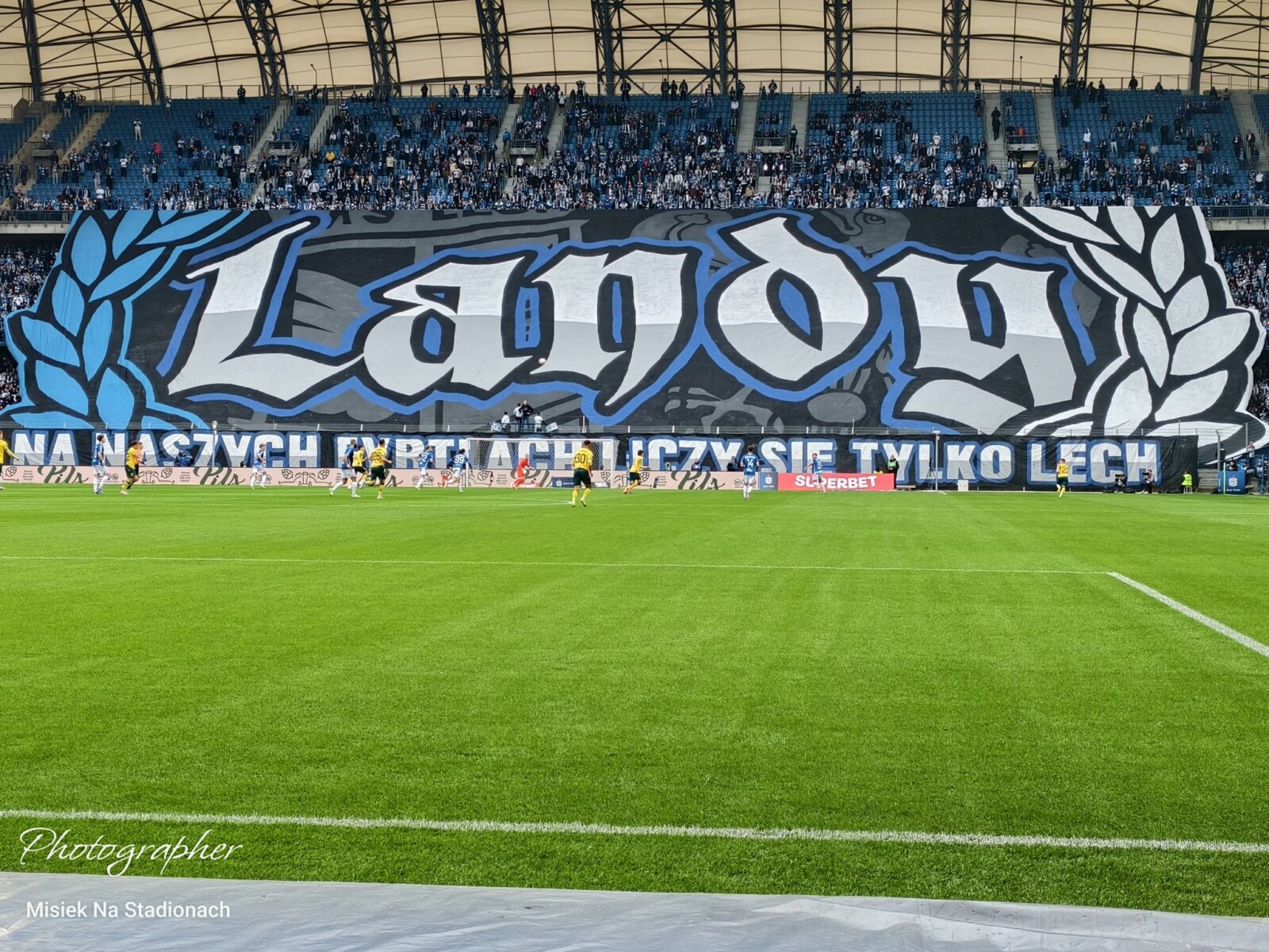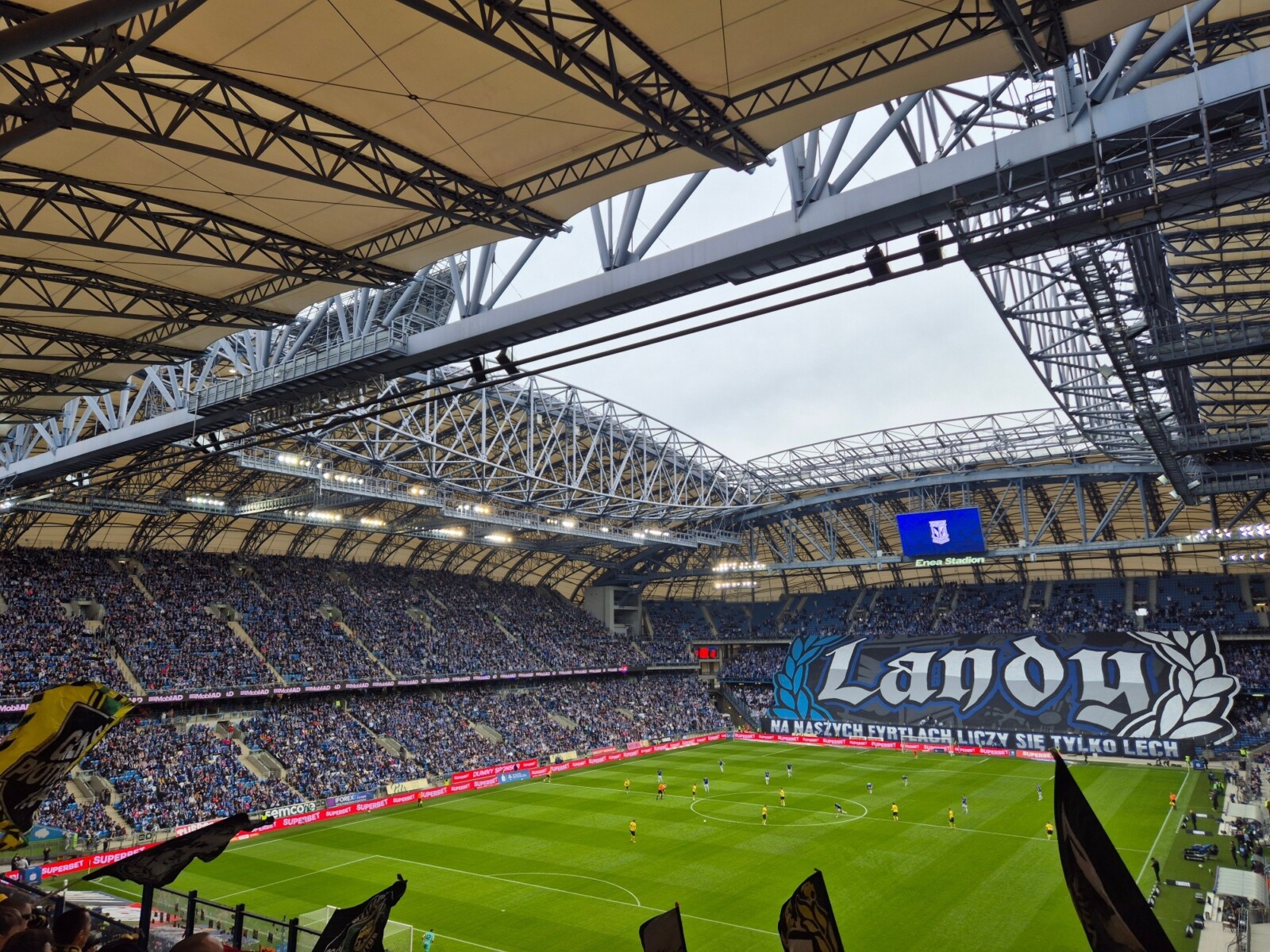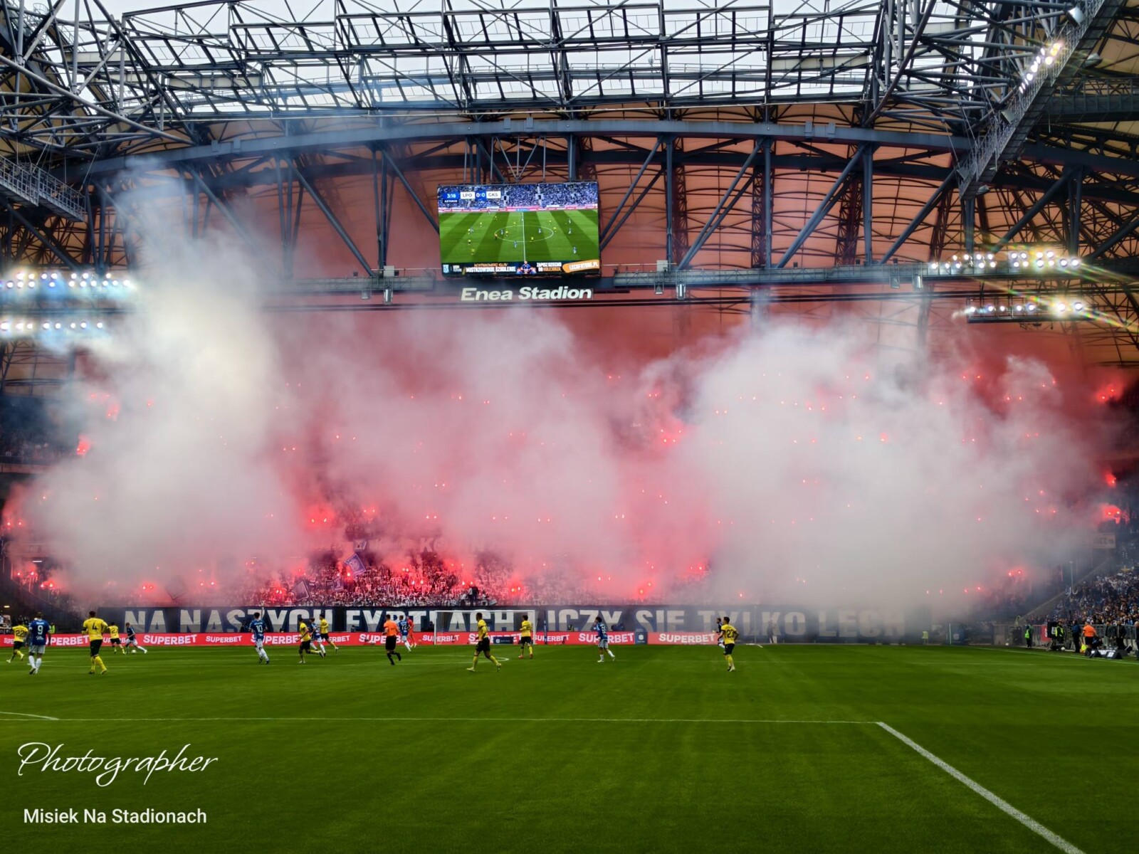 Chwilę później ruszyliśmy z dopingiem, a hymn GieKSiarzy „GKS młody Śląski klub” przedzierał się przez akustykę budowaną przez tysiące gardeł Pyrlandii. Lechici tego dnia zasiedli na trzech kondygnacjach w Kotle, wypełniając szczelnie dwie, na których utworzyli unikalny w naszym kraju dwukolorowy młyn. Na początku meczu Niebiesko-Biali zaprezentowali oprawę z cytatem z piosenki „Carlos – Wielkopolska” „W NASZYCH FYRTLACH LICZY SIĘ TYLKO LECH”, do której rozciągnięto na dwóch poziomach sektorówkę „Landy”, na której napis był wpisany w laur, a w tle widoczny był herb KKS-u i Wielkopolski. Po opadnięciu wieloformatowego płótna, Kocioł zapłonął blaskiem czerwonych rac na całej swojej powierzchni. W ten sposób poznańska lokomotywa uhonorowała swoje fan cluby, rozwieszając dodatkowo, na trzech poziomach 44 flagi, z czego większość to właśnie nazwy miejscowości kibicujące Lechowi. Machali także kilkunastoma machajkami z różnymi motywami i wywiesili transparent dla kibica Cracovii.